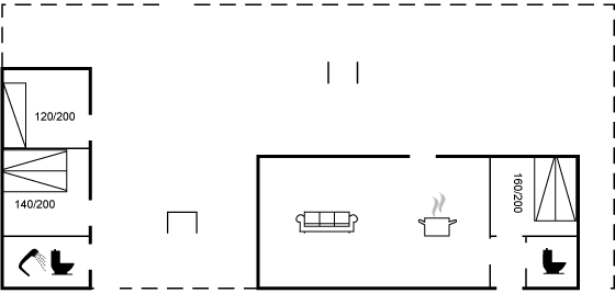 Huset er indrettet med et hyggeligt køkkenalrum og stue ud i et – herfra er der udgang til et stort terrasseområde, hvoraf en del er overdækket og hvor det er muligt at finde skygge og læ. I selve huset findes der ét soveværelse med dobbeltseng og ét gæstetoilet. I annekset er der to soveværelser med henholdsvis dobbeltseng og enkeltseng (sengen måler 120x200 cm.) og her er der også et badeværelse med bruseniche. Der findes også vaskemaskine.