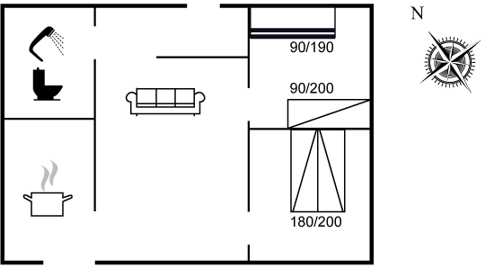 Husets samlingspunkt er det åbne køkken, som ligger i åben forbindelse med stuen, hvorfra der er udgang til terrassen. Der er 2 soveværelser. I det ene soveværelse er 2 sovepladser med mulighed for at vågne op til den mest fantastiske udsigt. I det andet soveværelse er en køjeseng (pga. målene på 90x190 cm. er den bedst egnet til børn og unge) samt en enkeltseng. Badeværelset er med bruseniche og gulvvarme.
