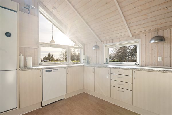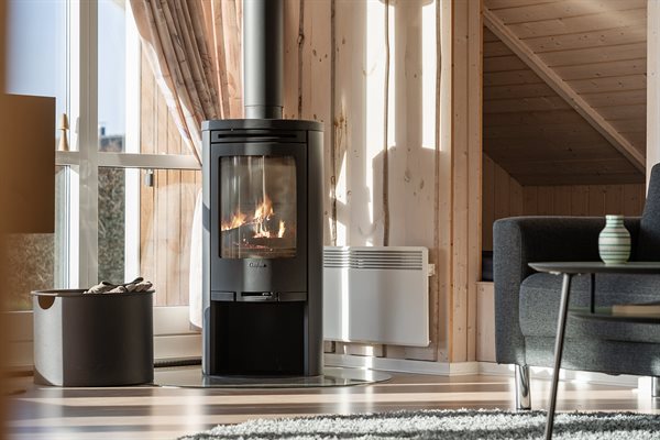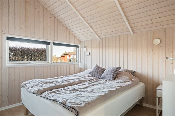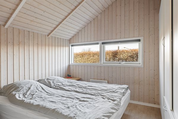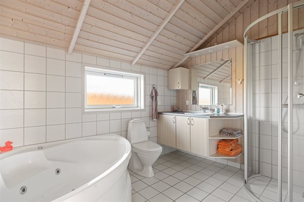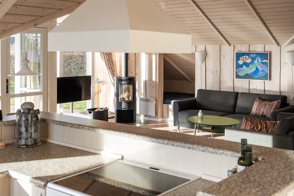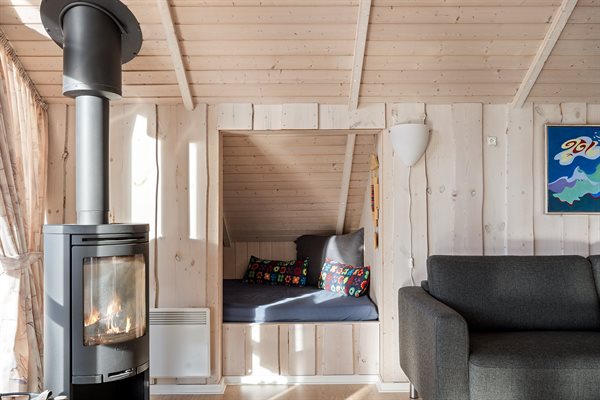 Stuen er møbleret med moderne møbler og brændeovn, hvilket giver en hyggelig stemning. Der findes to gode soveværelser samt to komplette badeværelser, hvoraf det ene er indrettet med spa og har adgang til en dejlig sauna. Her er der altså gode muligheder for selvforkælelse, mens I nyder ferien.