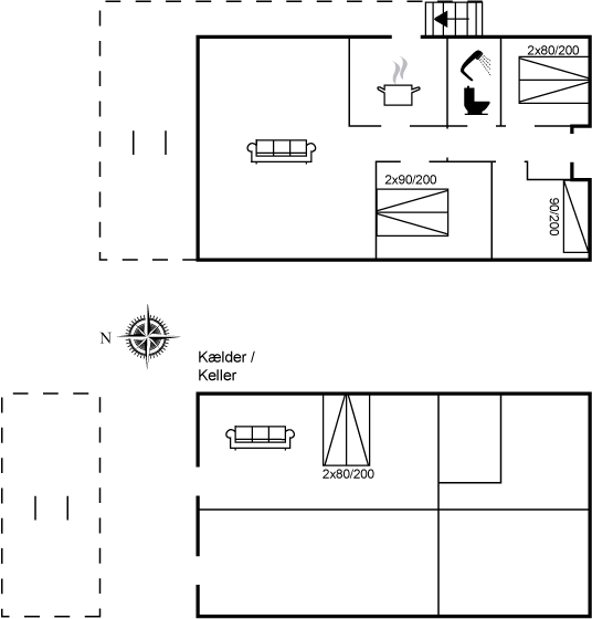 Sommerhuset har to etager – første sal med stort køkken alrum og udgang til den store terrasse – og en underetage med soveværelse og eget badeværelse. Fantastisk beliggenhed – tæt på områdets mange muligheder for udflugter både i naturen, badebyerne i Nordsjælland og Gilleleje med frisk fisk, restauranter og butikker.