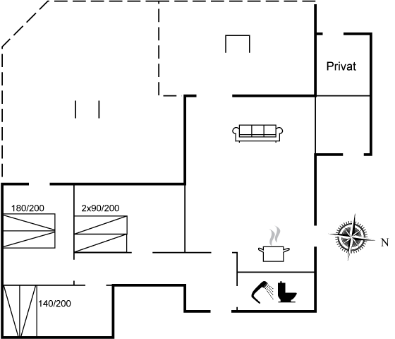 Der er 1 badeværelse med bruseniche og toilet. Desuden findes der en udendørsbruser med varmt/koldt vand. Udebruseren er tilgængelig fra maj til og med august.