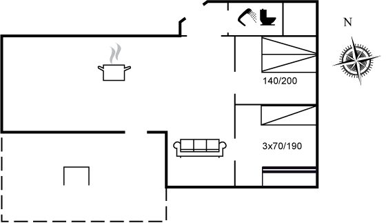 Huset er renoveret med nyt køkken samt nye eller istandsatte overflader på gulve, vægge og lofter og fremstår lyst og moderne. Huset er hyggeligt og sommerligt indrettet med køkken, spiseplads og sofagruppe ud i et. Herfra er udgang til den sydvendte terrasse, hvor en del er overdækket og hvor der er god mulighed for at nyde solen og finde skygge under den overdækkede del. Mod nord er yderligere en dejlig terrasse med godt læ. Det ene soveværelse er med dobbeltseng. I det andet soveværelse er der køjeseng og i alt 3 sovepladser (madrasserne måler 70x190 cm. og er derfor bedst egnede til børn og unge mennesker). Badeværelset er med bruser uden bruseniche.