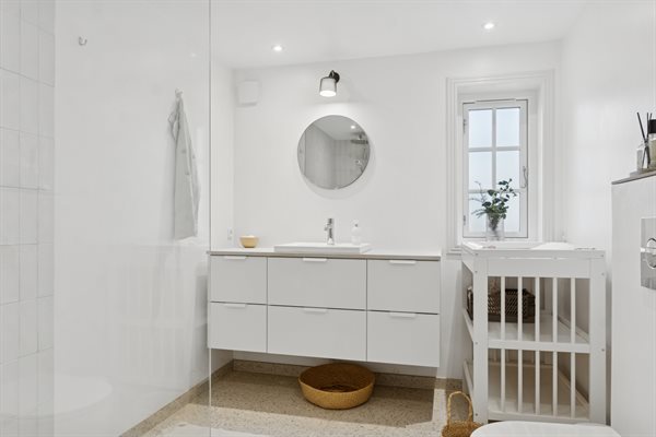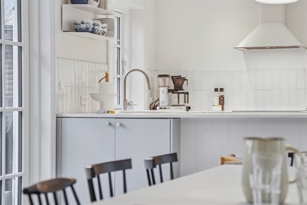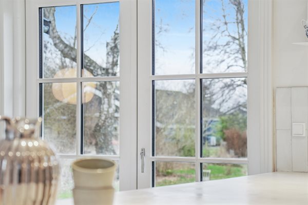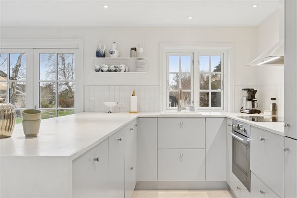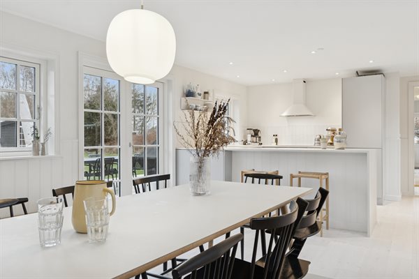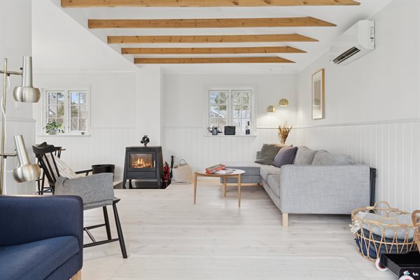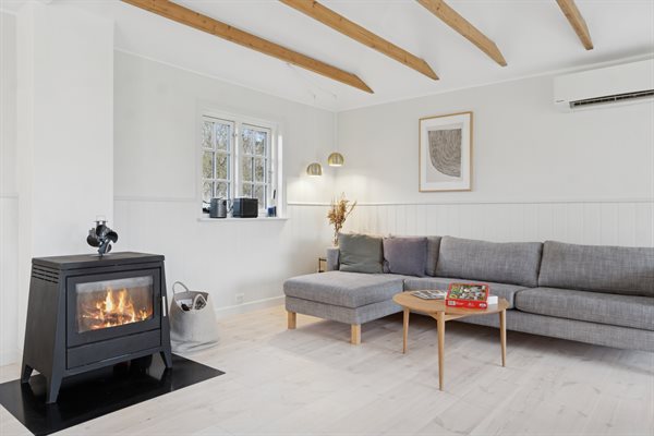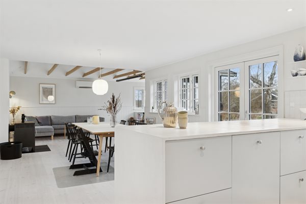 Huset fremstår lyst og indbydende med en velholdt og opdateret indretning, hvor stue og køkken flyder naturligt sammen. Her er der tænkt på detaljerne, og en nænsom modernisering gør huset både funktionel og behagelig at opholde sig i – uden at det har mistet sin oprindelige sommerhus-charme. De store vinduer lukker lyset ind og giver kig til haven.