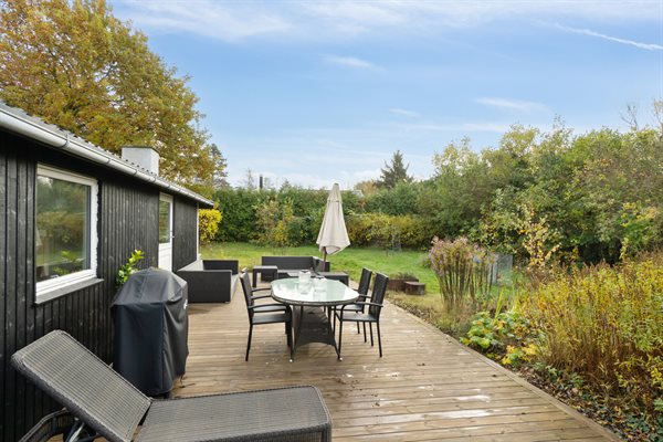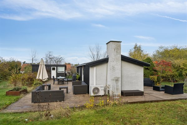 Huset indeholder et dejligt køkken i åben forbindelse med stue og spiseplads. Det store vinduesparti i stuen kan åbnes op og skydes til siden, hvorved udelivet inviteres indenfor, og der er fri adgang til terrassen. Rundt om huset er der gode terrasser og flot beplantning, som indbyder til at være ude og nyde solen og det gode vejr.