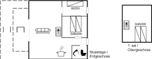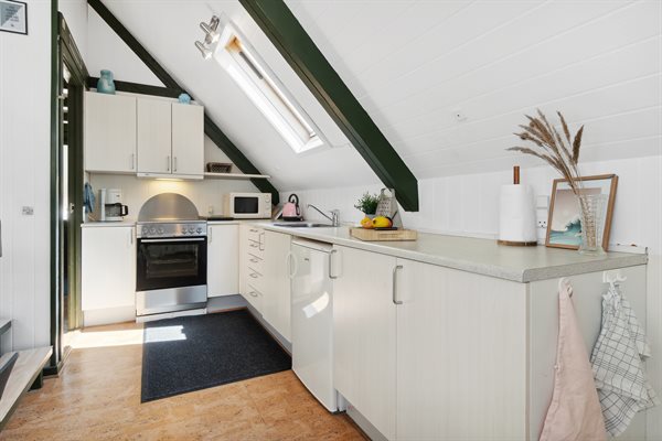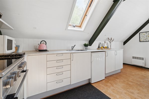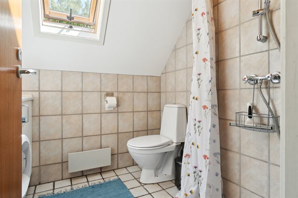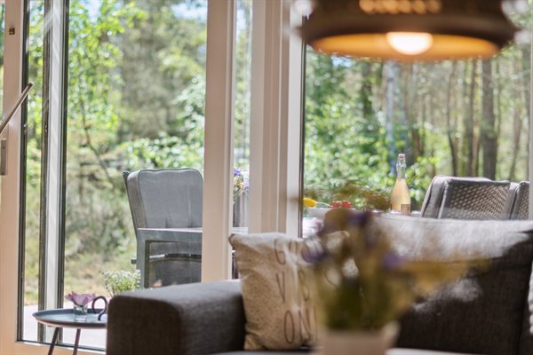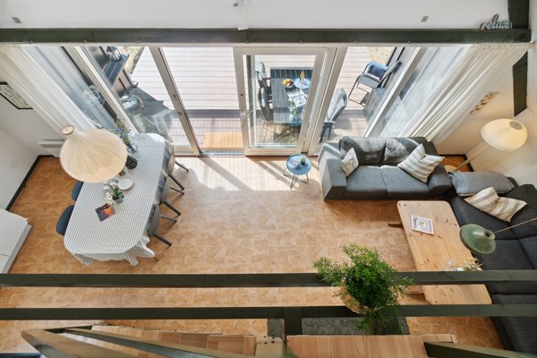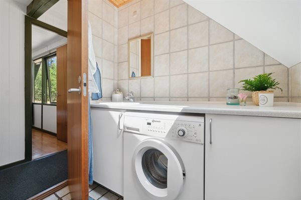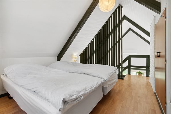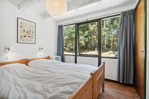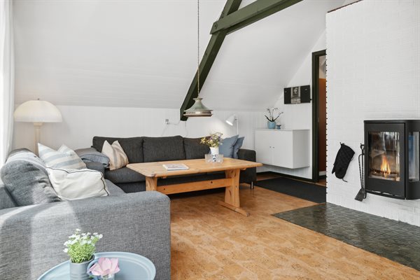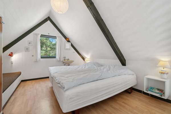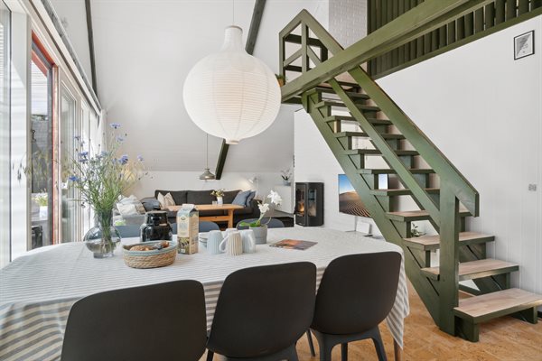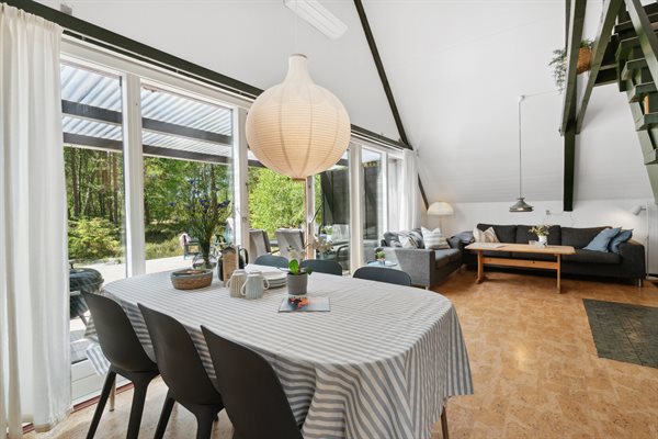 Huset er i 2 plan med en stor hems, der er indrettet med soveværelse. Fra de store panoramavinduer ud mod terrassen og naturgrunden kan man følge vejrets skiften og naturens gang.