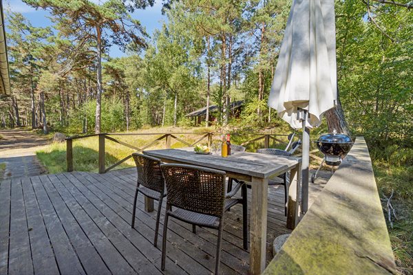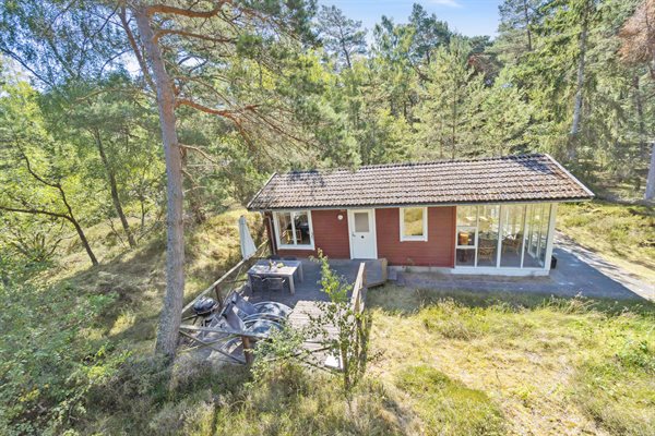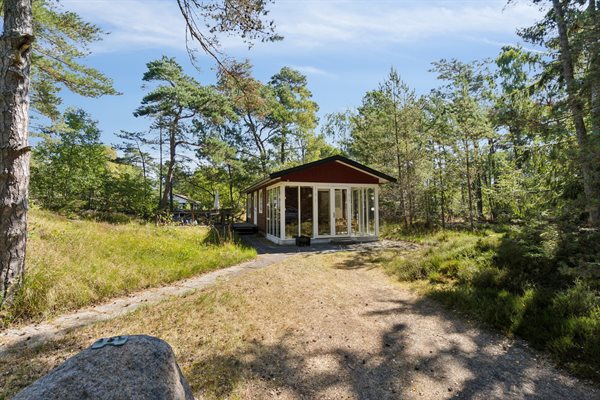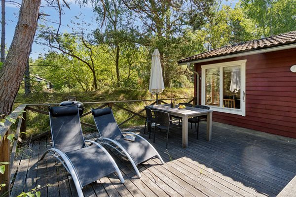 På meget stor naturgrund med blandet fyr og birke bevoksning ligger dette lille, hyggelige, røde sommerhus - blot to nabohuse er der på grunden, der i øvrigt også byder på et større naturareal. Huset er ideelt til en aleneferie eller til et par, der gerne vil nyde Dueoddes vidtstrakte sandstrande og imponerende klitlandskaber, der er specielle i forhold til, hvad man i øvrigt kan opleve på Bornholm, hvor naturen i øvrigt er meget forskellig med lige så imponerende fuglefjelde på den nordlige del af øen.