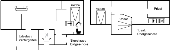 Husets indretning er med to stuer, der ikke er ganske adskilt, men sådan at man kan spise sin frokost i den ene afdeling og sidde og slappe af i den anden del eller se TV. Køkkenet er rummeligt og af nyere dato, så alt fungerer på bedste vis og endda med god plads til at kokkerere. Huset er i to plan med to soveværelser på 1. sal og et soveværelse i stueplan. Da huset jo er bygget i en anden tid, så når loftshøjden under bjælkerne nogle steder kun op til 180 cm.