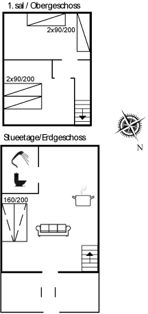 På 1. sal findes der 2 værelser i alt; 1 soveværelse med dobbeltseng, skabsplads, barnestol og weekendseng med madras samt 1 soveværelse med 2 enkeltsenge og skabsplads.