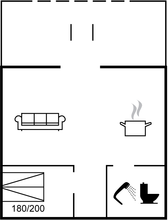 Lejligheden fremstår med et lyst interiør. hvor pladsen er veludnyttet, så der endda er blevet plads til en hems med stejl trappe. Foruden soveværelset er der også en god sofakrog i stuen, som kan benyttes som dobbeltsoveplads, hvis men ikke vil sove hemsen. Velassorteret køkkenafdeling og stue med direkte udgang til terrassen, der er godt afskærmet.