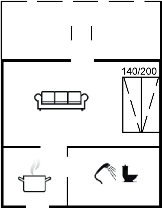 Ferielejligheden er indrettet med stue, mindre køkken, indbydende badeværelse og dobbelt sovesofa i stuen.