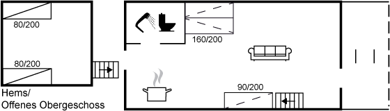 Ferieboligen er på 34 m² fordelt over stueplan og hems. På hemsen er der to enkeltsenge og i stuen en sovesofa (200x160). Til de små er der en højstol og en rejseseng. Ferieboligen er udstyret med en energibesparende varmepumpe. Til ferieboligen hører et eget terrasseareal.