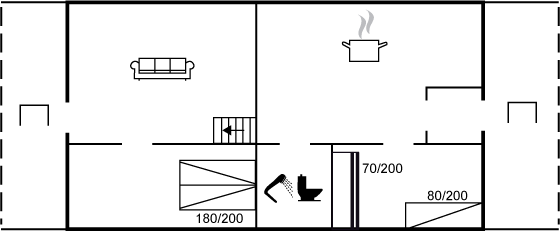 Boligen er opført i to niveauer. På øverste plan, som ligger i niveau med indgangspartiet og det skrånende terræn, findes køkken-alrum, badeværelse samt et soveværelse. I forskudt niveau ligger den lyse og indbydende stue med loft til kip og direkte udgang til svalegangsterrassen. Indretningen er hyggelig og indbydende, og man føler sig hurtigt hjemme.