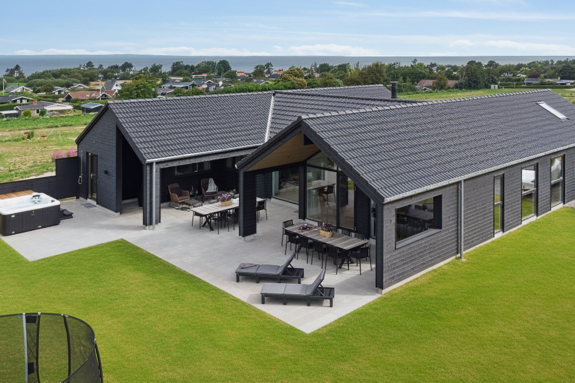 Dette rummelige og luksuriøse poolhus ved Skåstrup Strand er ideelt til en ferie med familie eller venner \u2013 med plads til op til 16 personer. Huset er designet til fællesskab og hygge med seks soveværelser, fire hemsepladser og to separate soveafdelinger med egne badeværelser. Det store køkken-alrum samler gæsterne omkring måltider og samtaler, mens stuen med brændeovn skaber en hyggelig atmosfære. Huset byder på en privat poolafdeling med vandrutsjebane samt et aktivitetsrum med bl.a. billard og bordtennis. Udendørs kan I nyde grillmiddage på terrassen, slappe af i wellnessområdet med udespa og sauna eller lege i haven med trampolin og gynger. Blot 550 meter fra stranden og tæt på Bogense, hvor natur og kultur venter, er dette hus perfekt til både afslapning og oplevelser.