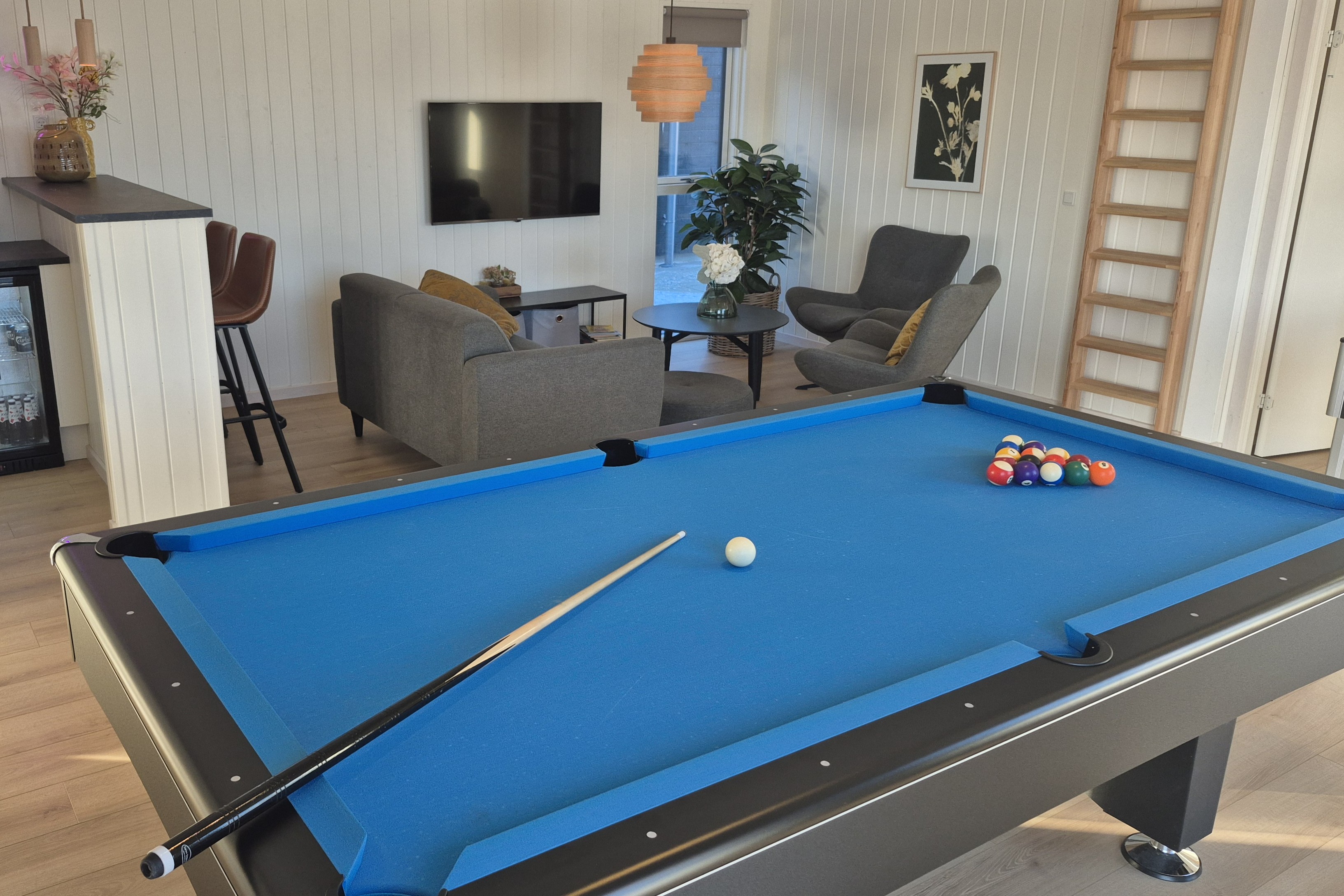 Dette rummelige og luksuriøse poolhus ved Skåstrup Strand er ideelt til en ferie med familie eller venner \u2013 med plads til op til 16 personer. Huset er designet til fællesskab og hygge med seks soveværelser, fire hemsepladser og to separate soveafdelinger med egne badeværelser. Det store køkken-alrum samler gæsterne omkring måltider og samtaler, mens stuen med brændeovn skaber en hyggelig atmosfære. Huset byder på en privat poolafdeling med vandrutsjebane samt et aktivitetsrum med bl.a. billard og bordtennis. Udendørs kan I nyde grillmiddage på terrassen, slappe af i wellnessområdet med udespa og sauna eller lege i haven med trampolin og gynger. Blot 550 meter fra stranden og tæt på Bogense, hvor natur og kultur venter, er dette hus perfekt til både afslapning og oplevelser. Bemærk venligst at dette VillaVilla-hus ikke udlejes til ungdomsgrupper.