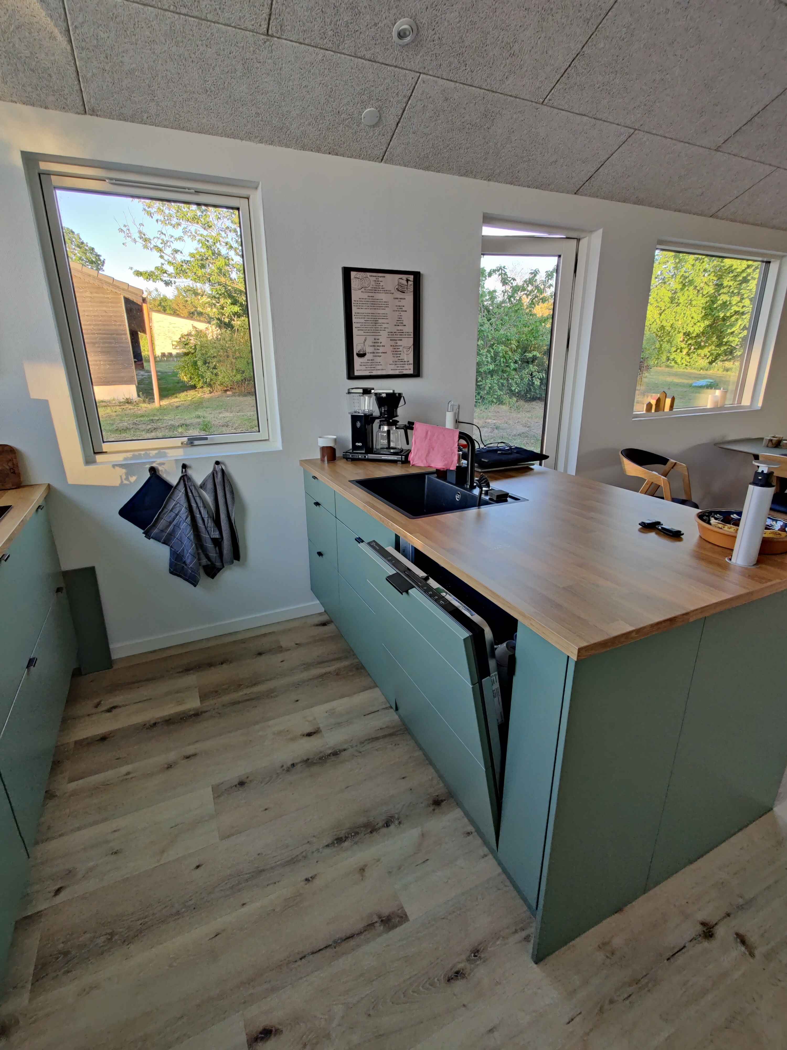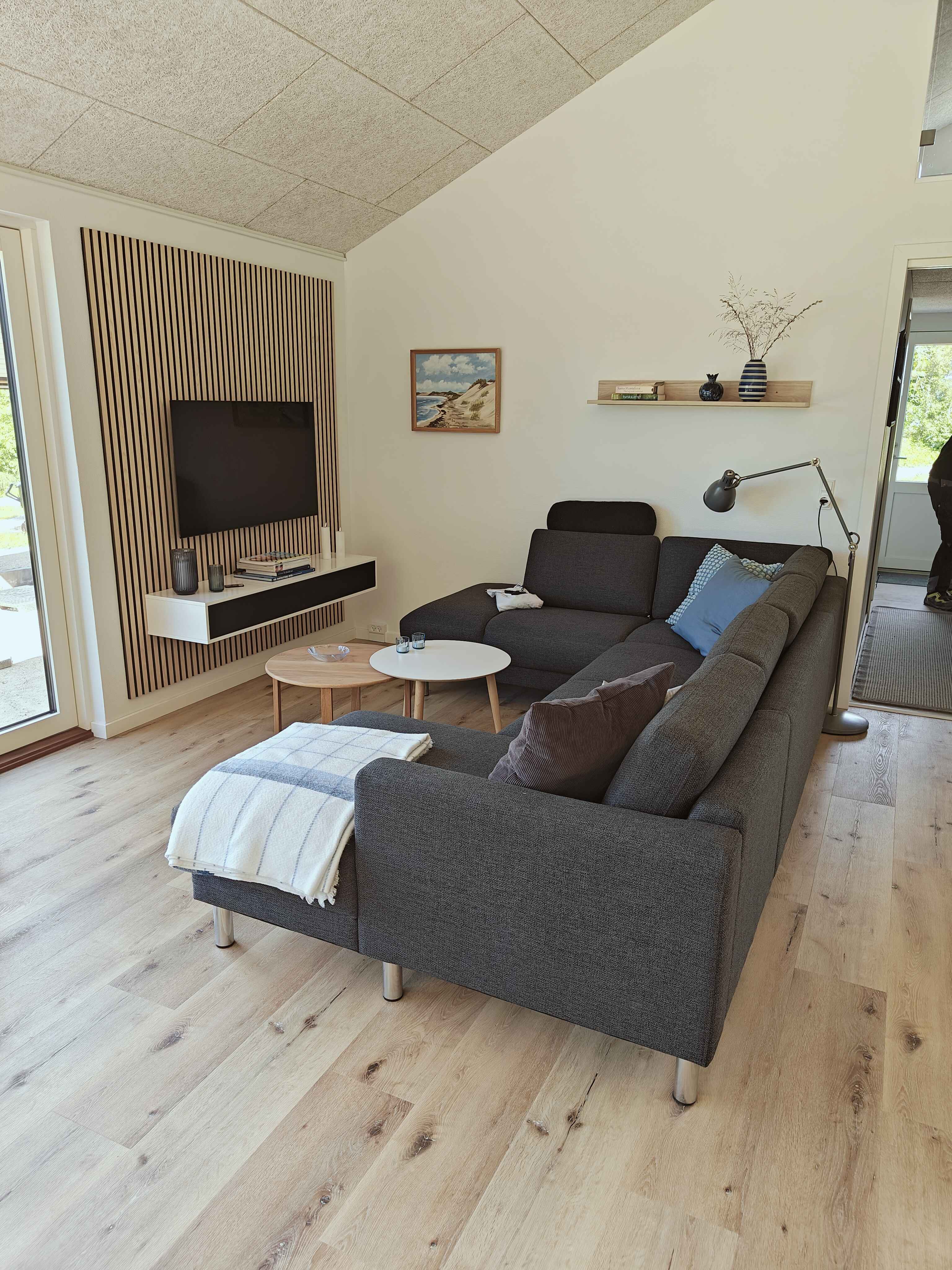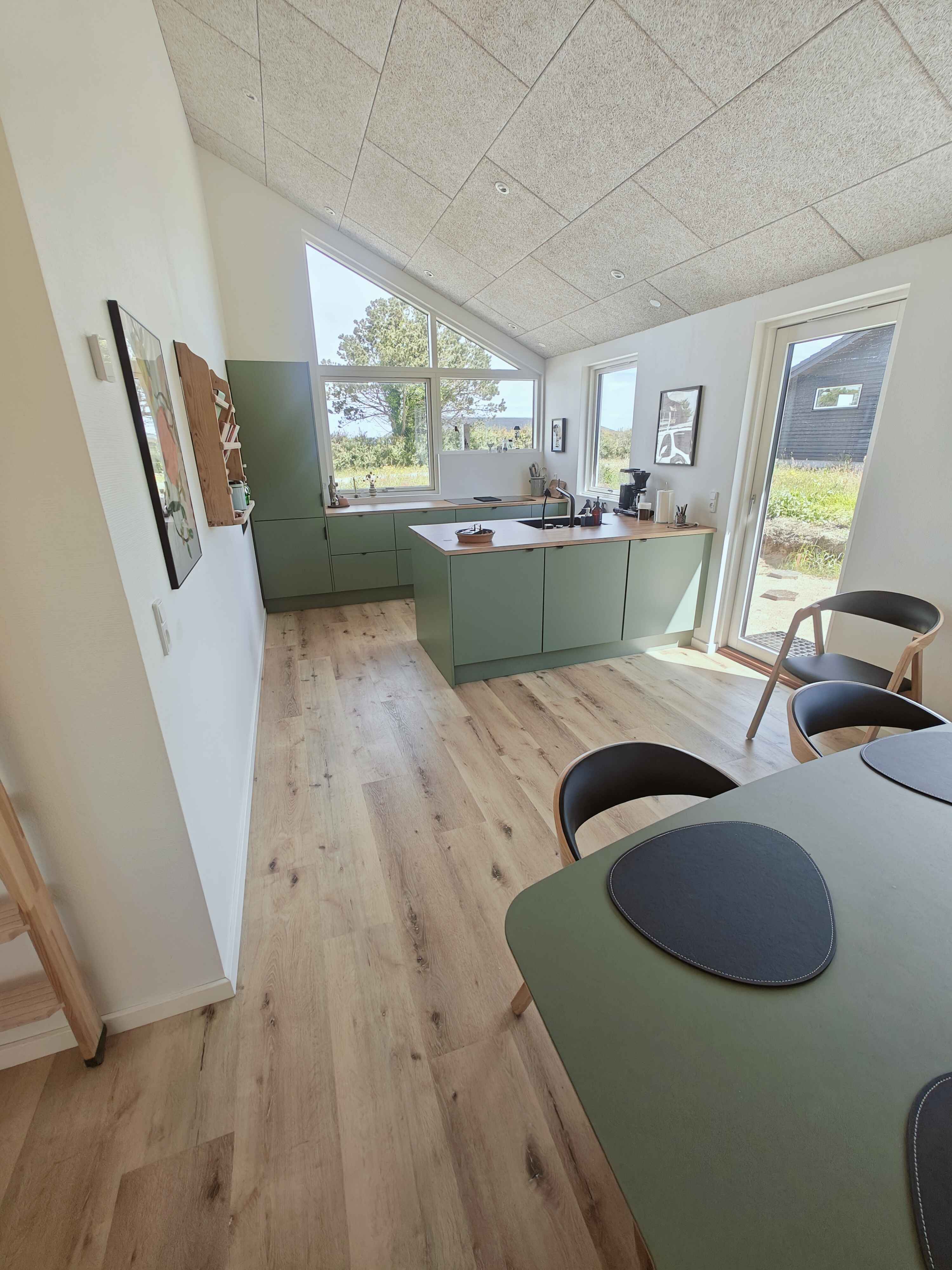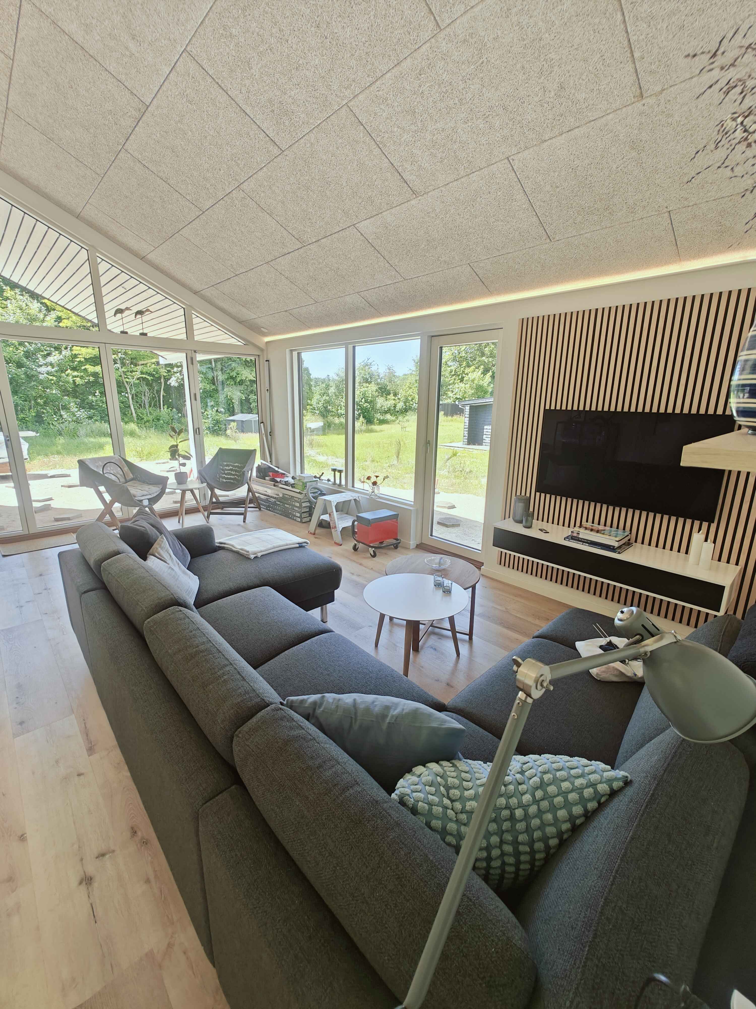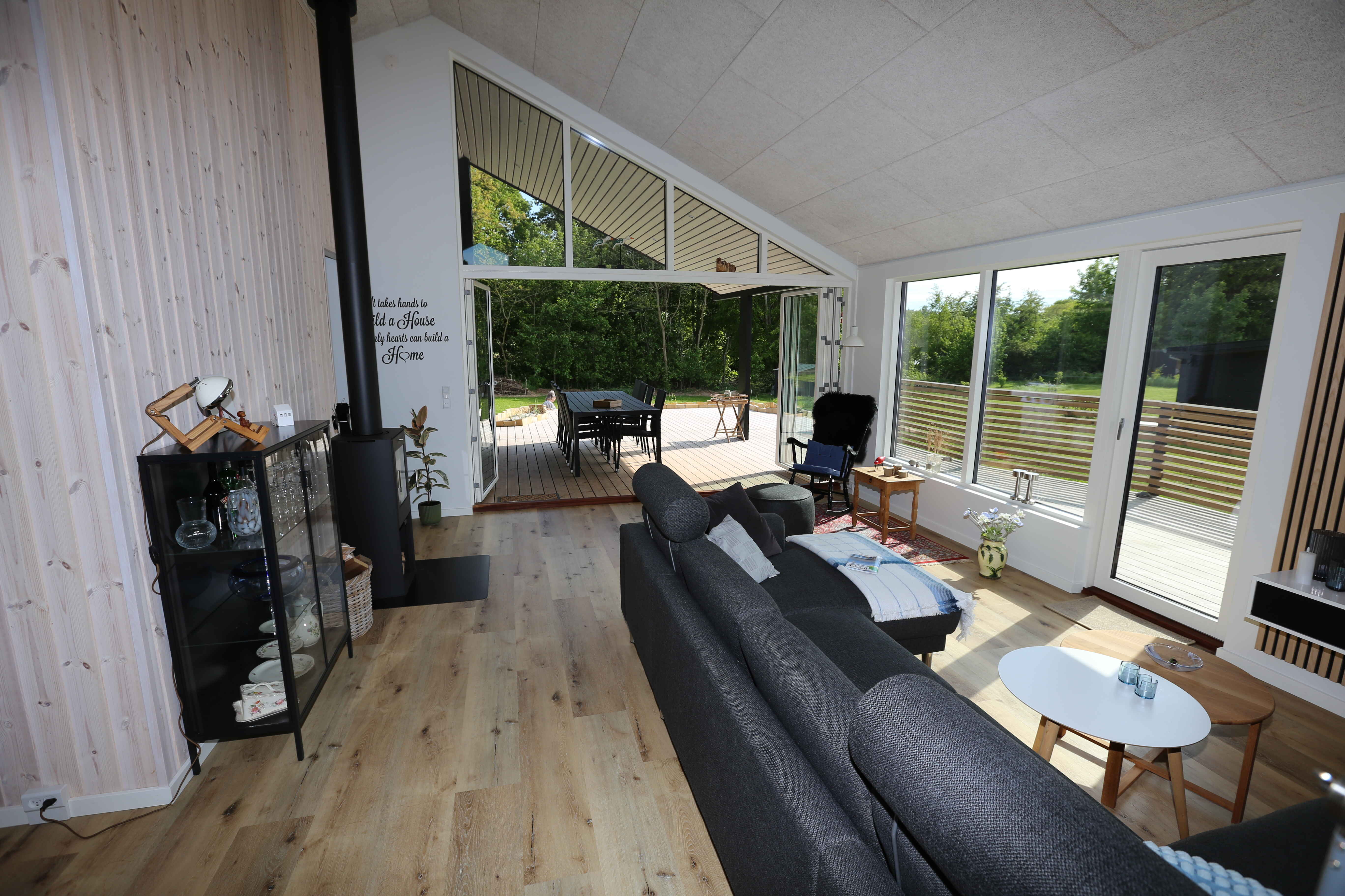 I sommerhusets store lyse alrum med højt til loftet er der masser af plads til hygge med spil og snak om spisebordet, i køkkenafdelingen hvor alle funktioner er super praktisk indrettet alt imens I nyder den fabelagtige havudsigt gennem gavlens store vinduespartier. I stuen er der en rummelig hyggeafdeling til afslapning mens man kan lune fødderne ved brændeovnen eller nyde udsigten mod syd, hvor et kæmpe vinduesparti smukt indrammer landskabet udenfor eller du kam åbne den bredde foldedør så naturen inviteres med helt ind i stuen.