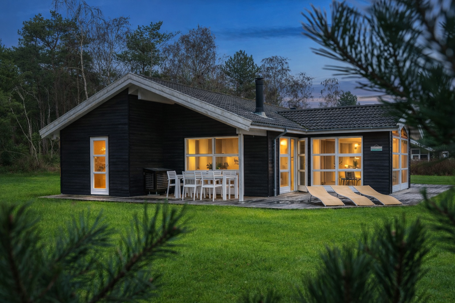 På den store terrasse som vender mod syd, findes der to sæt havemøbler. En lille del af terrassen er overdækket, og her er der mulighed for at søge skygge. Udendørs bruser kan bruges fra primo maj til medio september. Udhuset kan benyttes til opbevaring af cykler, barnevogne, bagage eller andet. Der er plads til parkering af bil lige ved siden af huset, hvor der er elbils-lader (Type 2 med 11 kW).