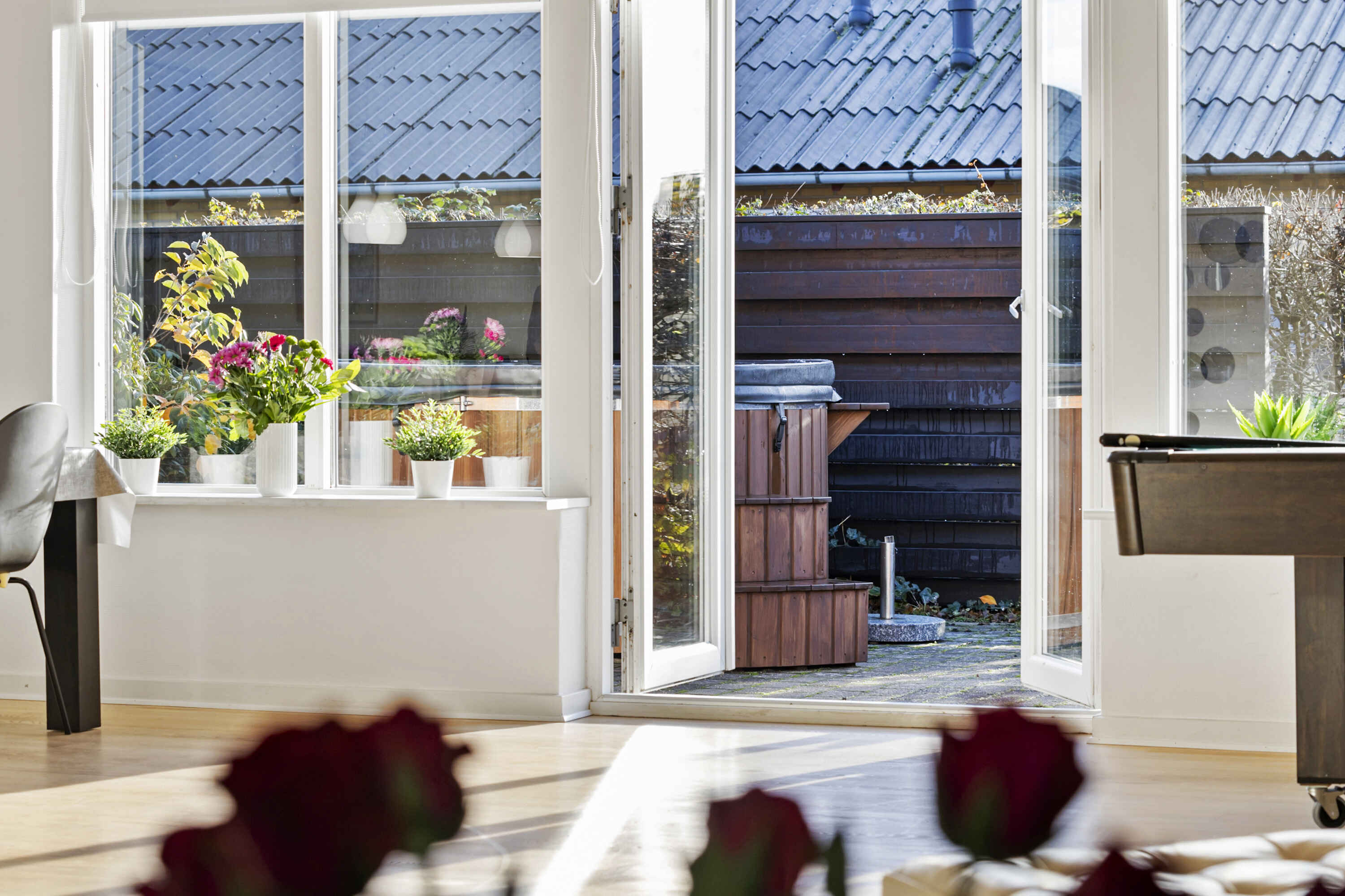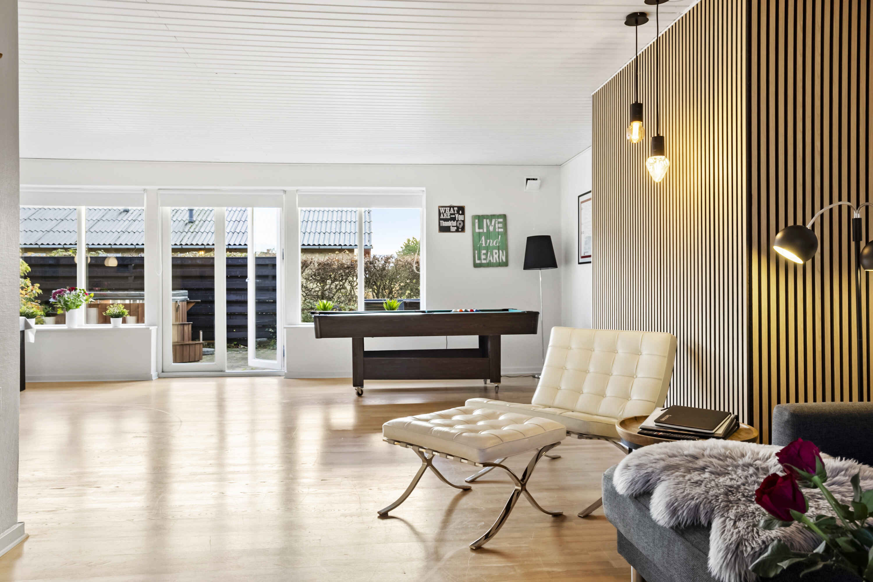 Stuen har moderne møblement, gratis high-speed internet (500/500) samt Smart-tv med Chromecast, hvor I har mulighed for at streame egne TV-tjenester. Der er også biopejs, der vil lune jer på en kølig sommeraften eller en efterårsaften med regn og rusk.