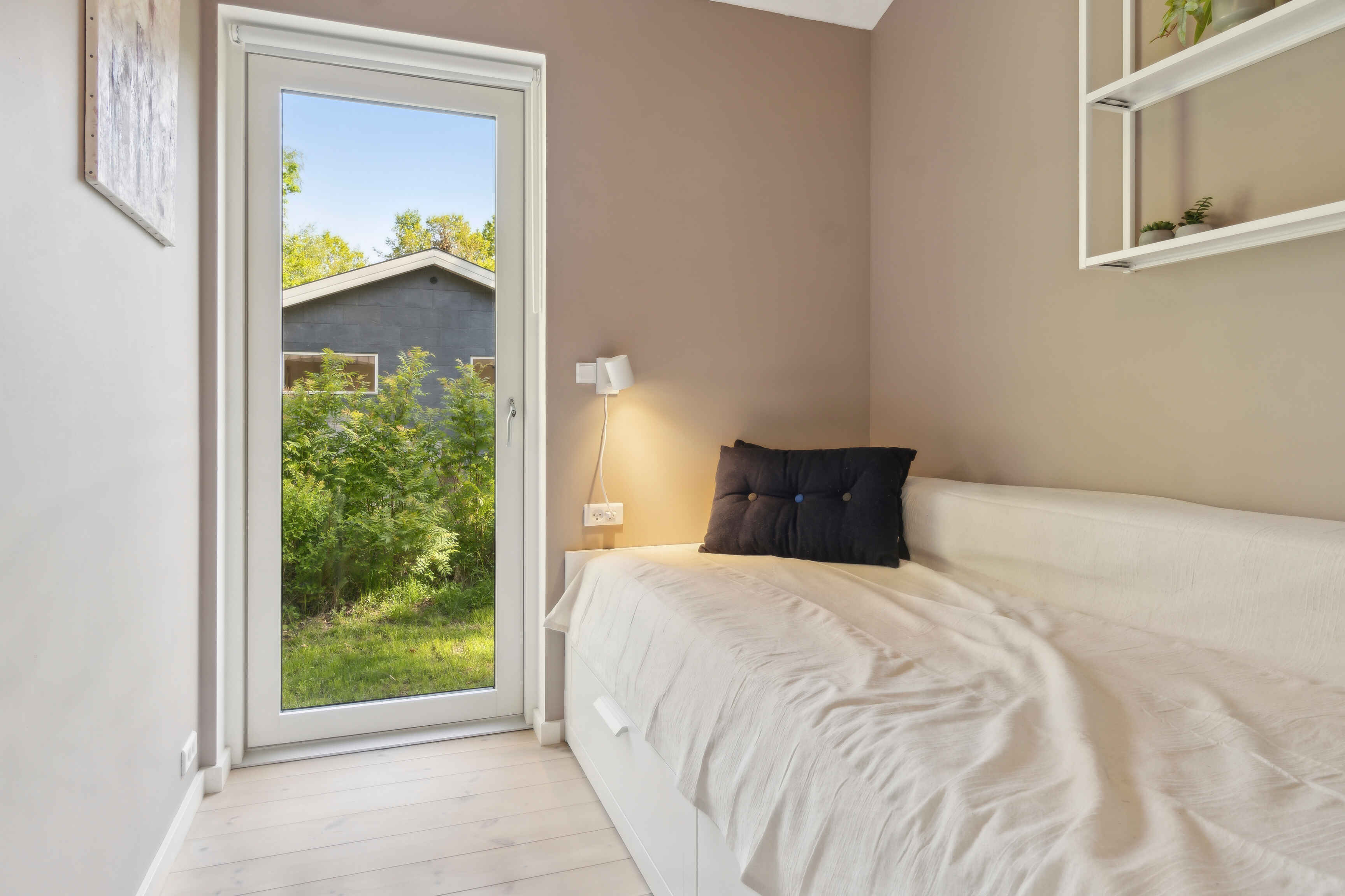 Huset er præget af store vinduespartier, ovenlysvinduer og alle rum har egen udgang til haven.