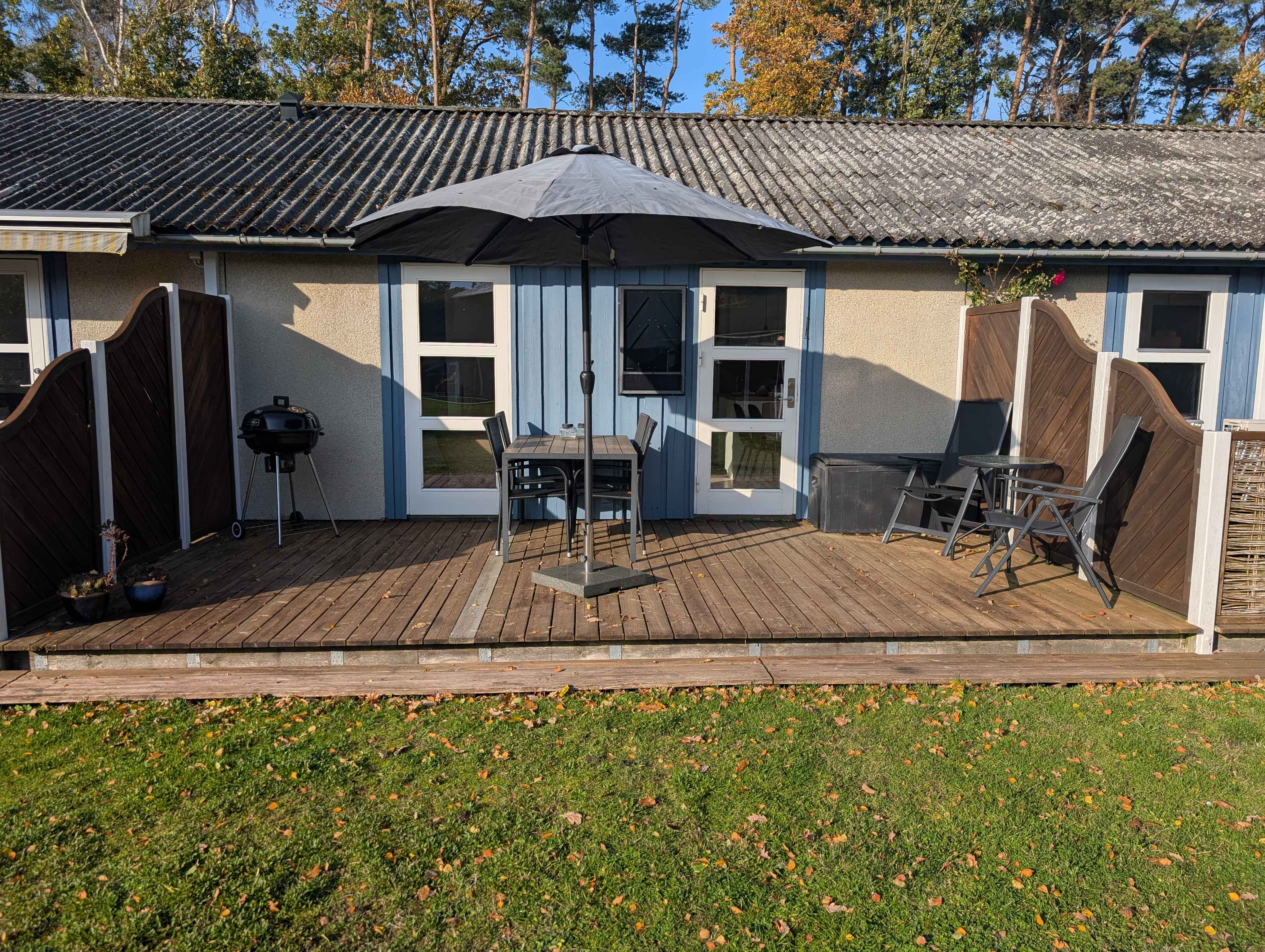 Boligen er 42 m² og har plads til fire personer. Den rummer et soveværelse med dobbeltseng samt en dobbeltopredning i alkoven i stuen. Indretningen er lys og moderne, og stuen har direkte udgang til en møbleret terrasse med grill.