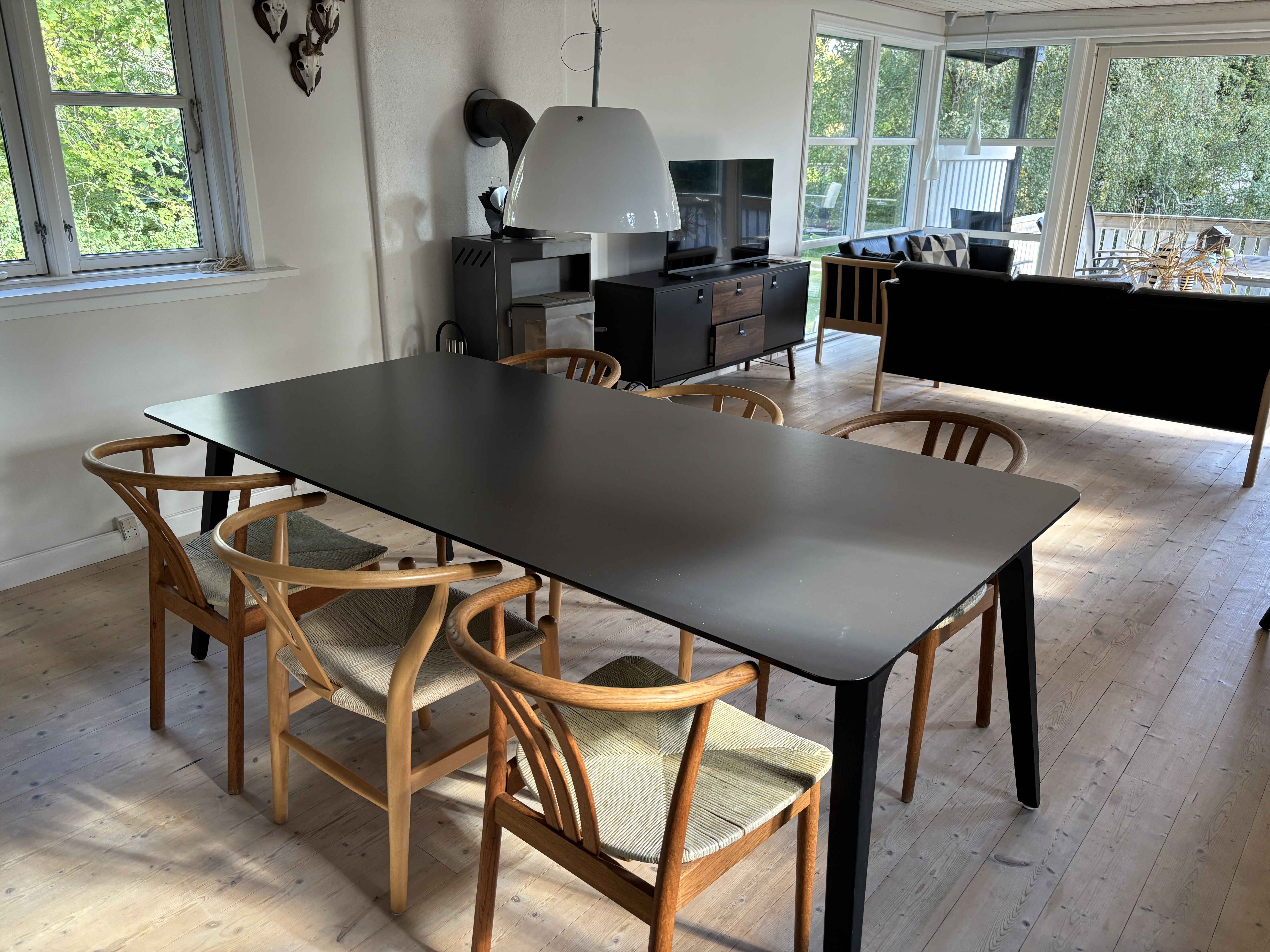 •\tStor stue med spiseplads til 8 personer, hyggelig brændeovn og to komfortable sofaer.