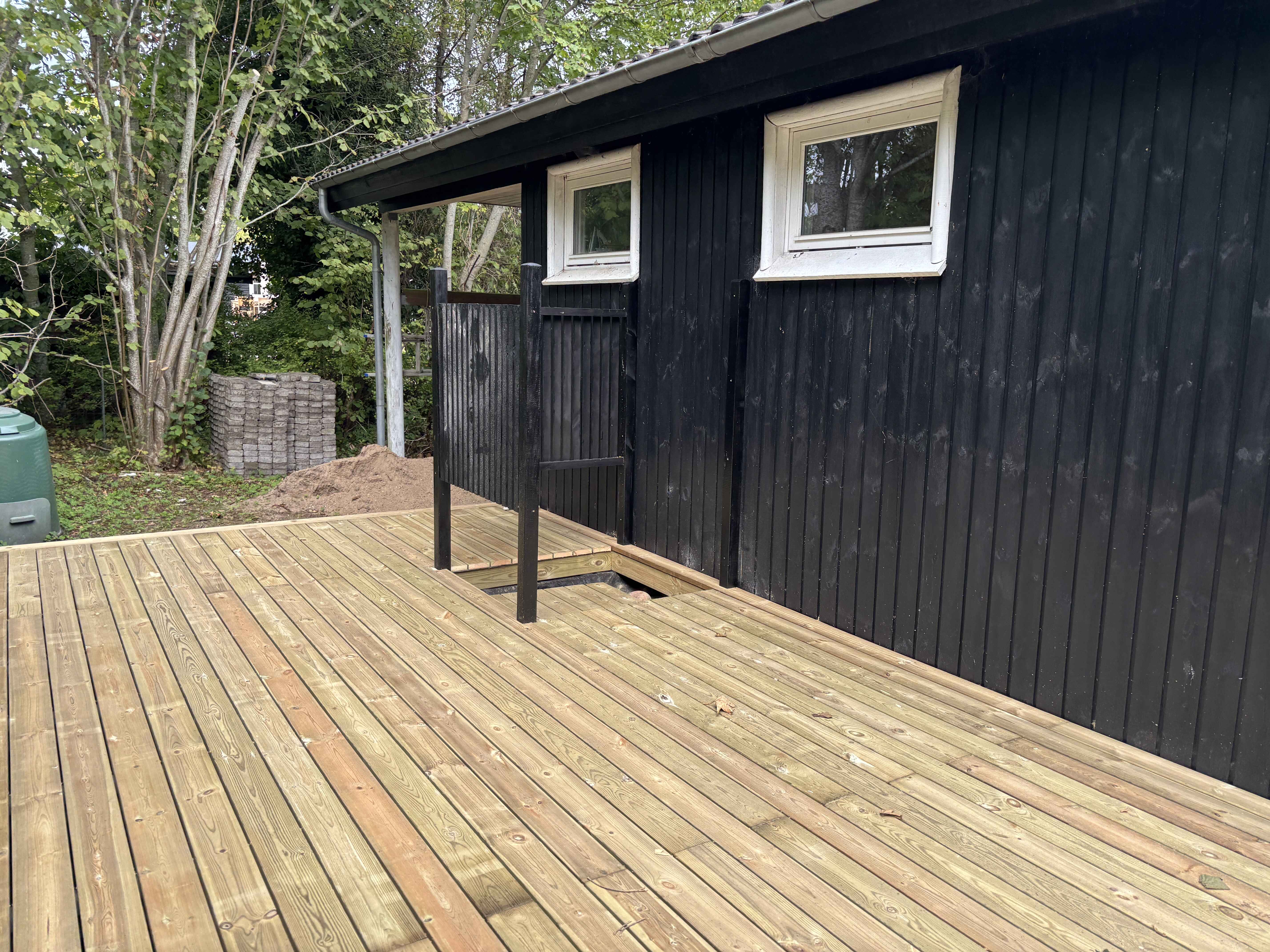•\tSkøn solrig terrasse, perfekt til morgenkaffen eller grillmiddage, stor plæne der indbyder til leg.