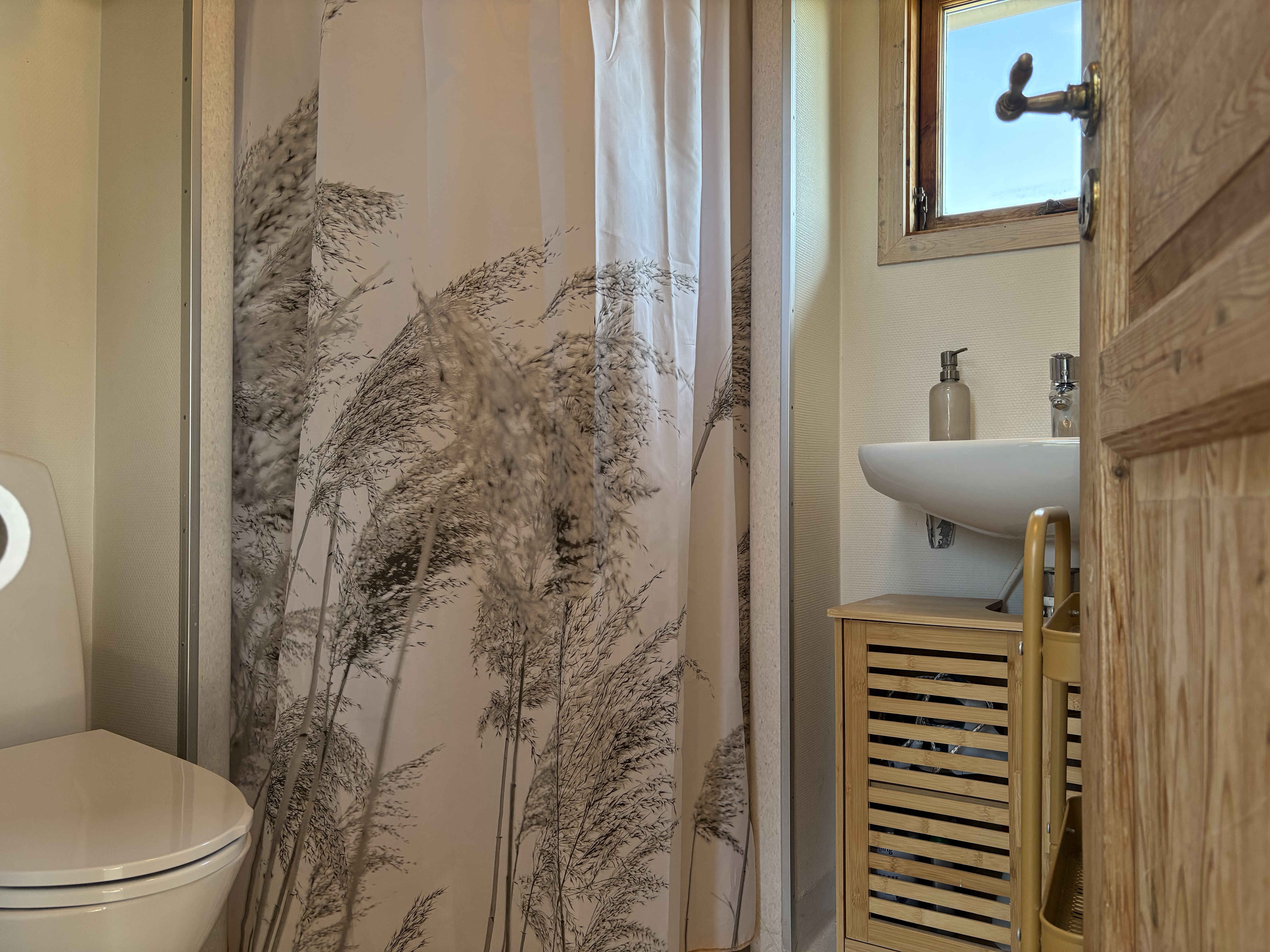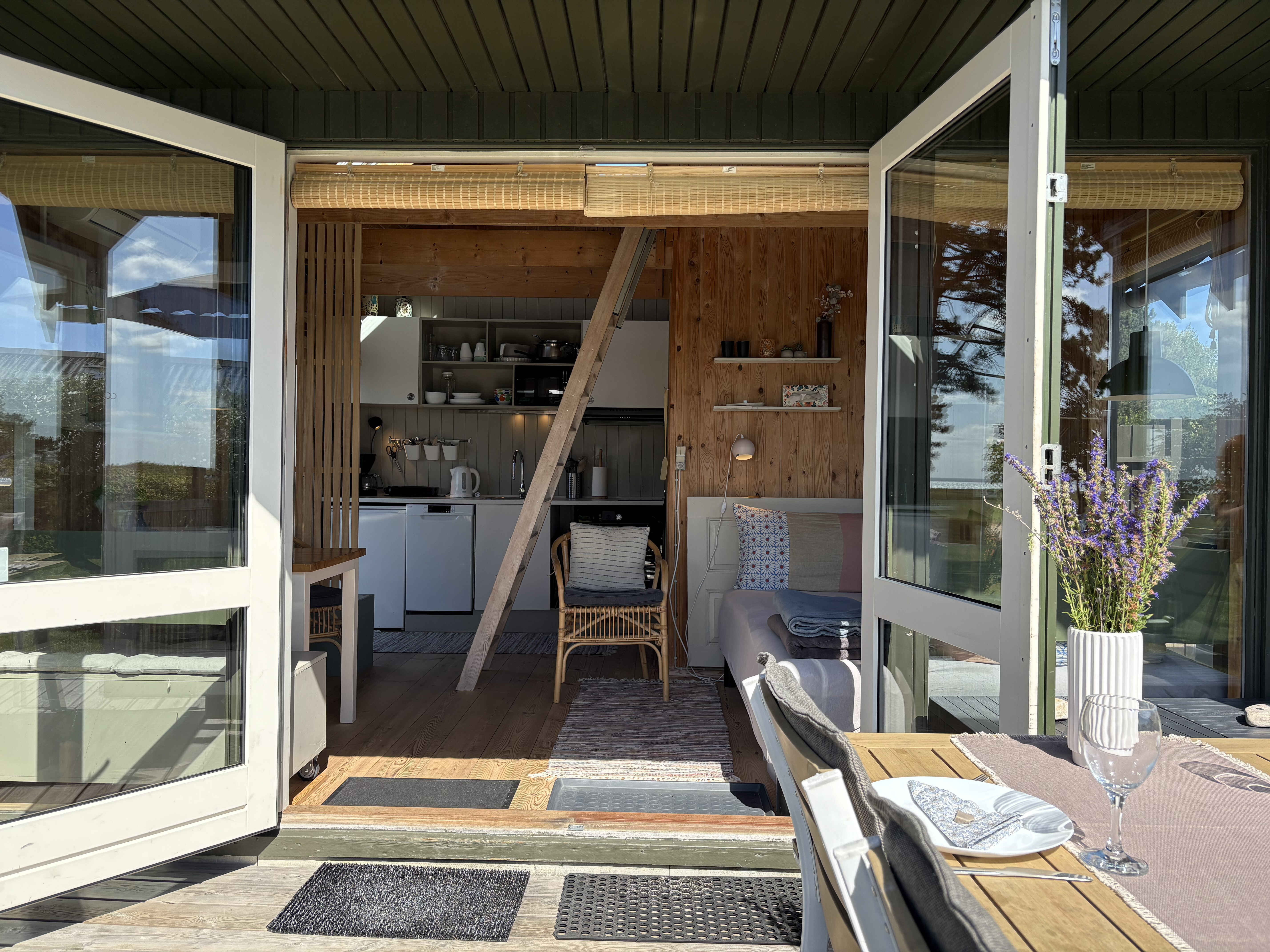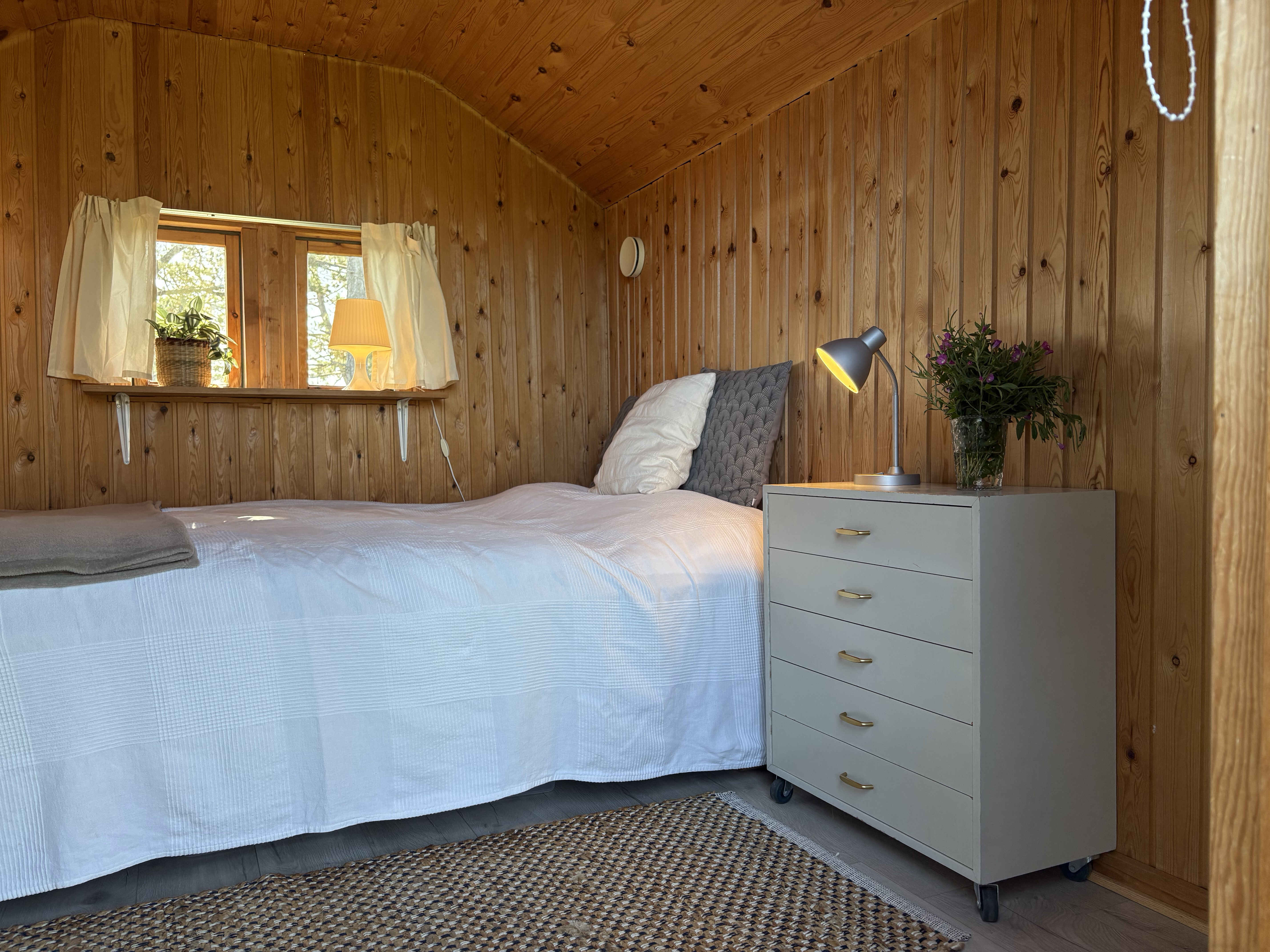 Indenfor finder du plads til fire personer. To sovepladser er placeret i stueplan, mens hemsen rummer yderligere to. Det gør hytten velegnet både til parret eller den lille familie, som ønsker at bo tæt og hyggeligt, men stadig med god komfort.
