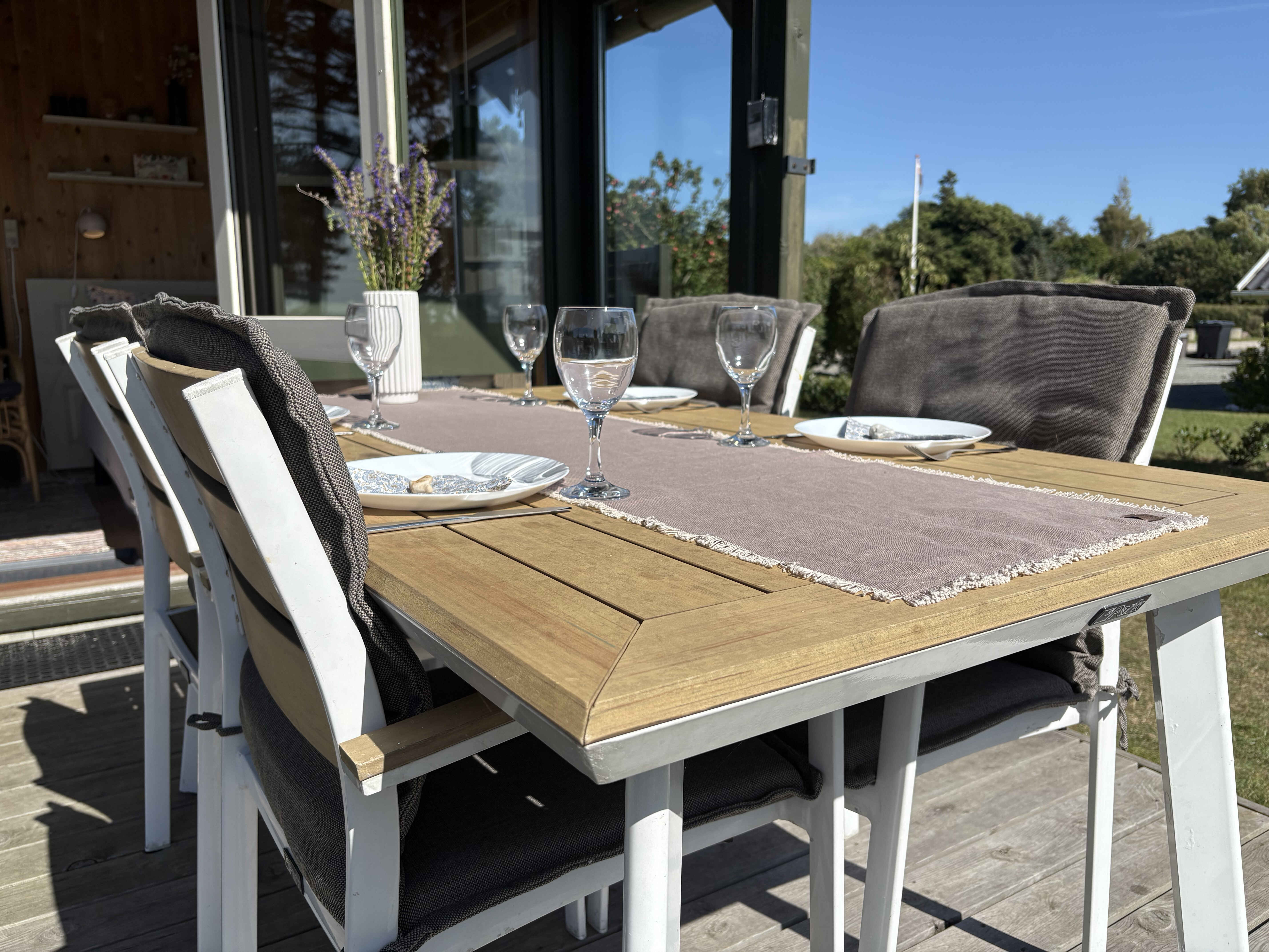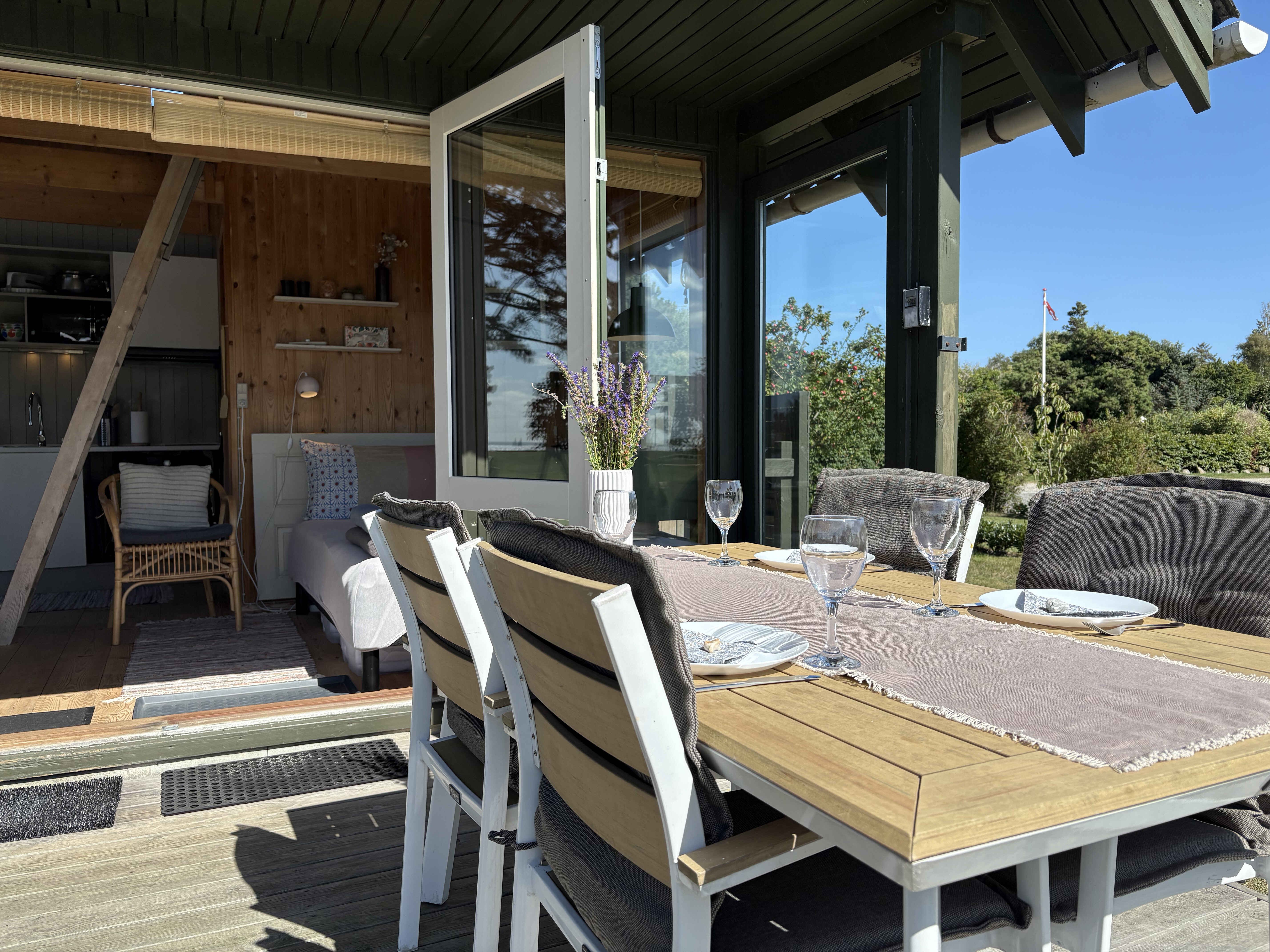 Fra stuen åbner udsigten sig direkte mod vandet. De store vinduespartier giver et panorama, der gør, at man hele tiden har naturen som baggrund – uanset om dagen bruges indenfor eller på terrassen. Afstanden til kysten er blot 100 meter.