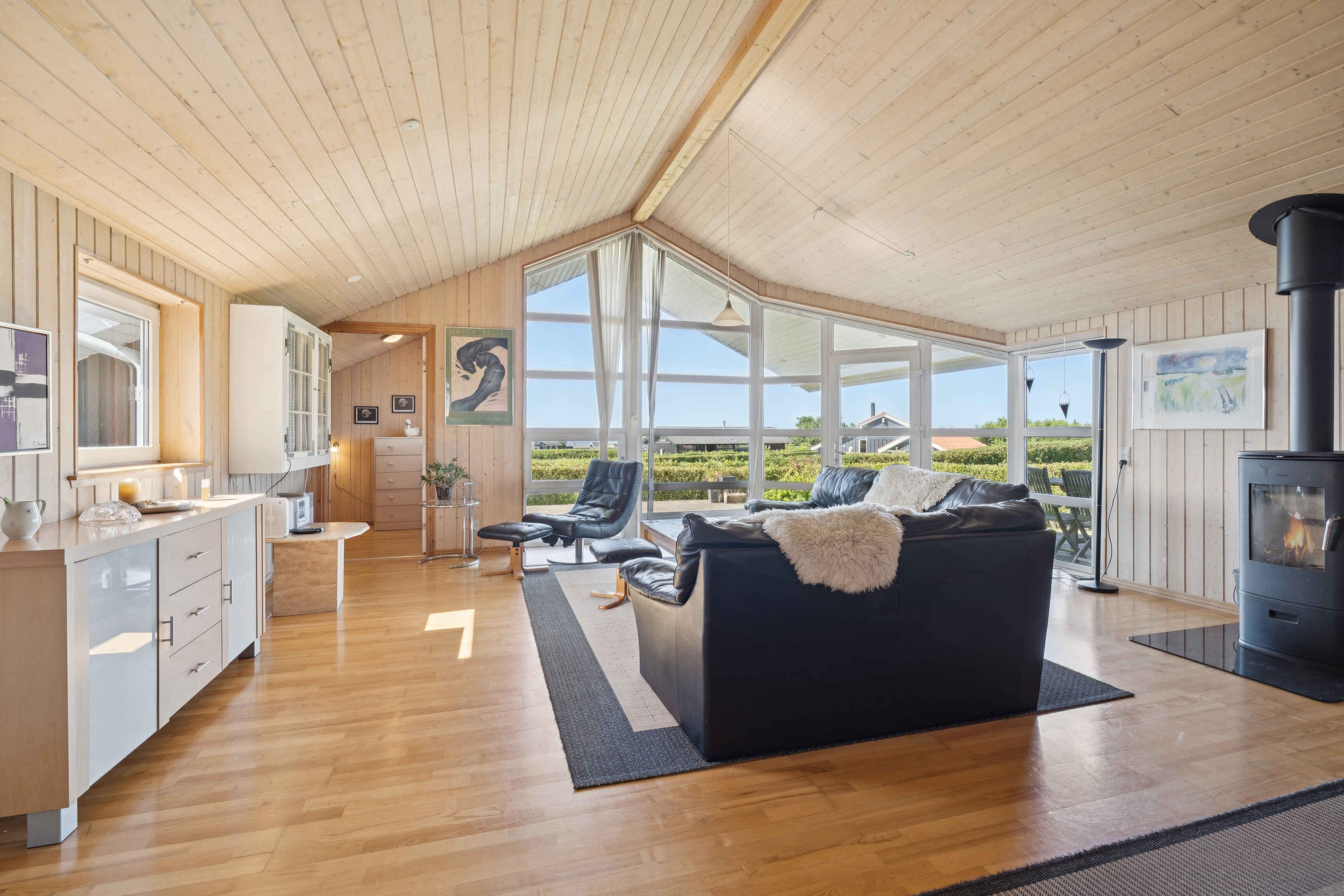 Indenfor byder huset på et åbent opholdsrum, hvor køkken, spiseplads og stue flyder sammen. De store vinduespartier lader lyset strømme ind og skaber kontakt til haven, hvor terrassen indbyder til udendørs måltider og hyggelige timer.