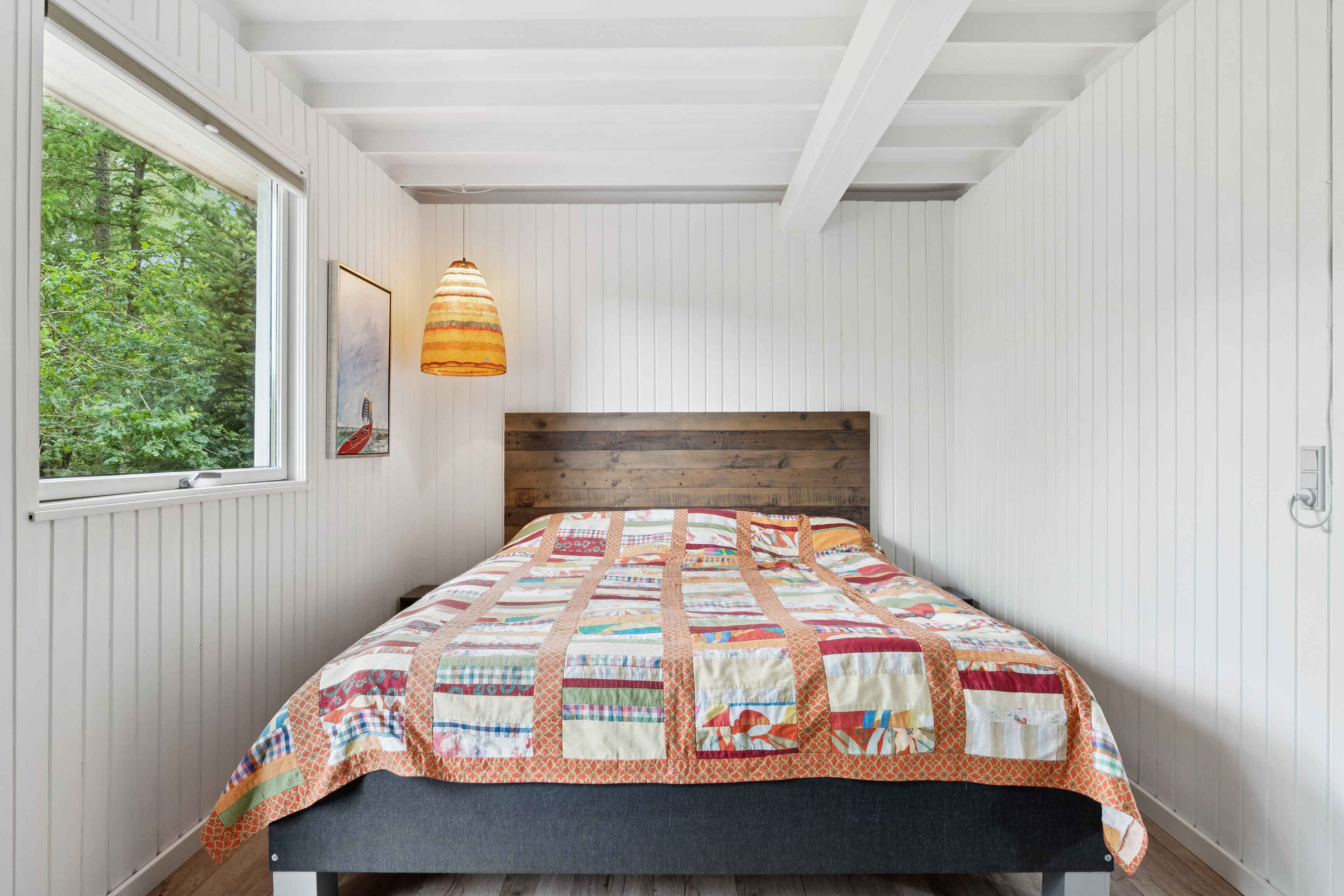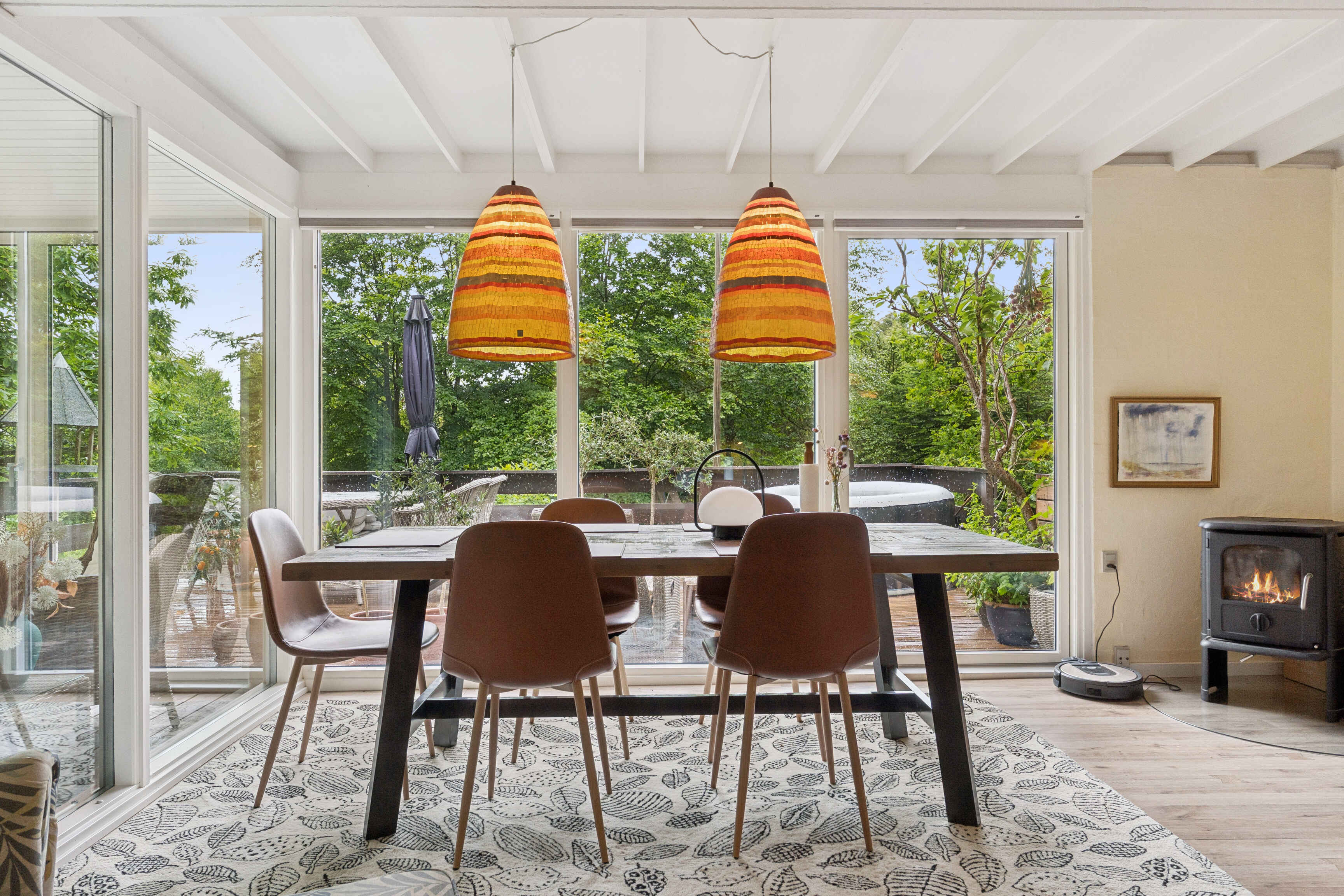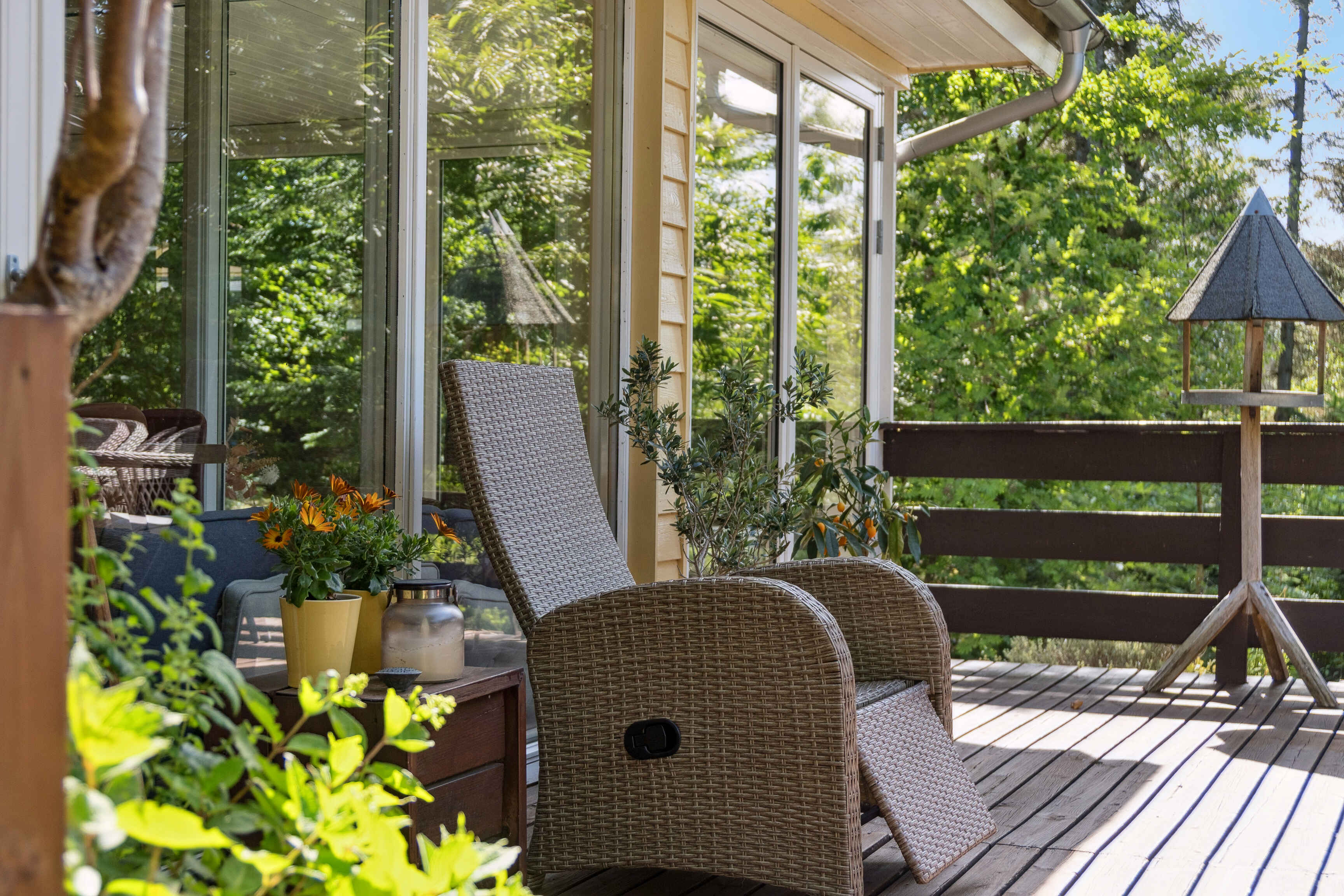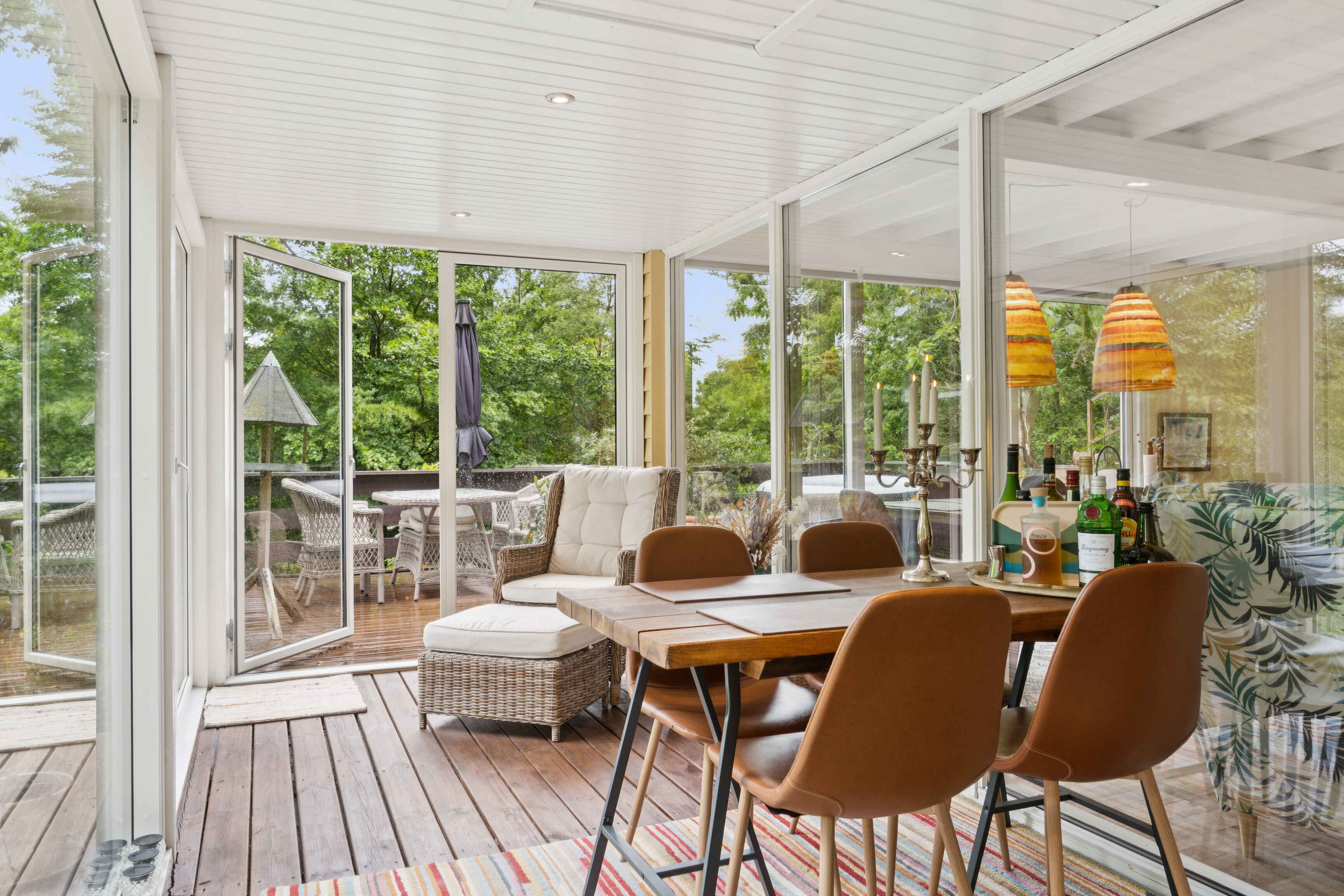 En nyindrettet udestue inviterer til afslapning i læ og med udsigt til dyrelivet. Kig ud og se egern i fuld gang – eller op, når gæs i flok flyver hen over huset. Huset ligger privat og ugeneret på en grund, der naturligt skærmer for vind.