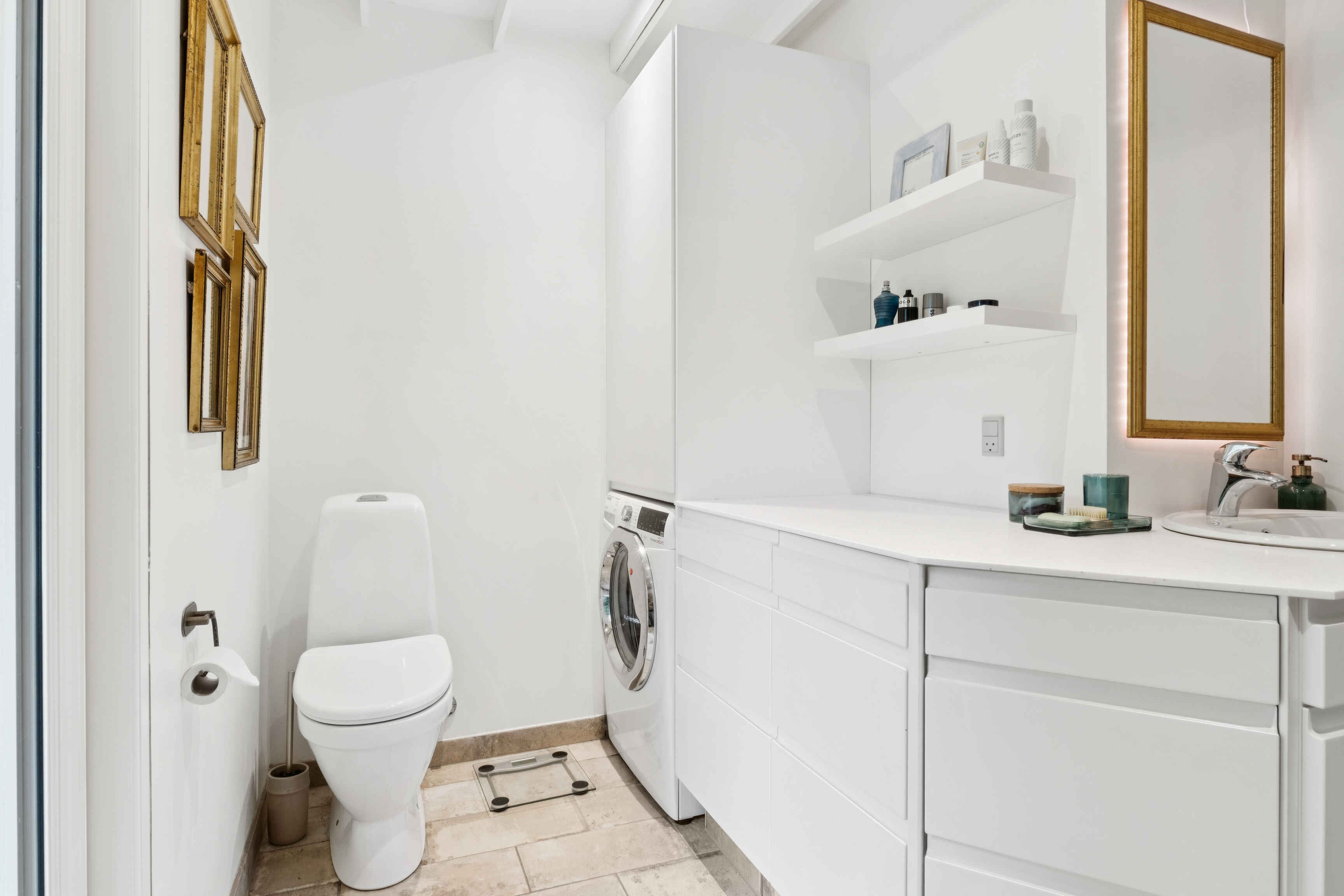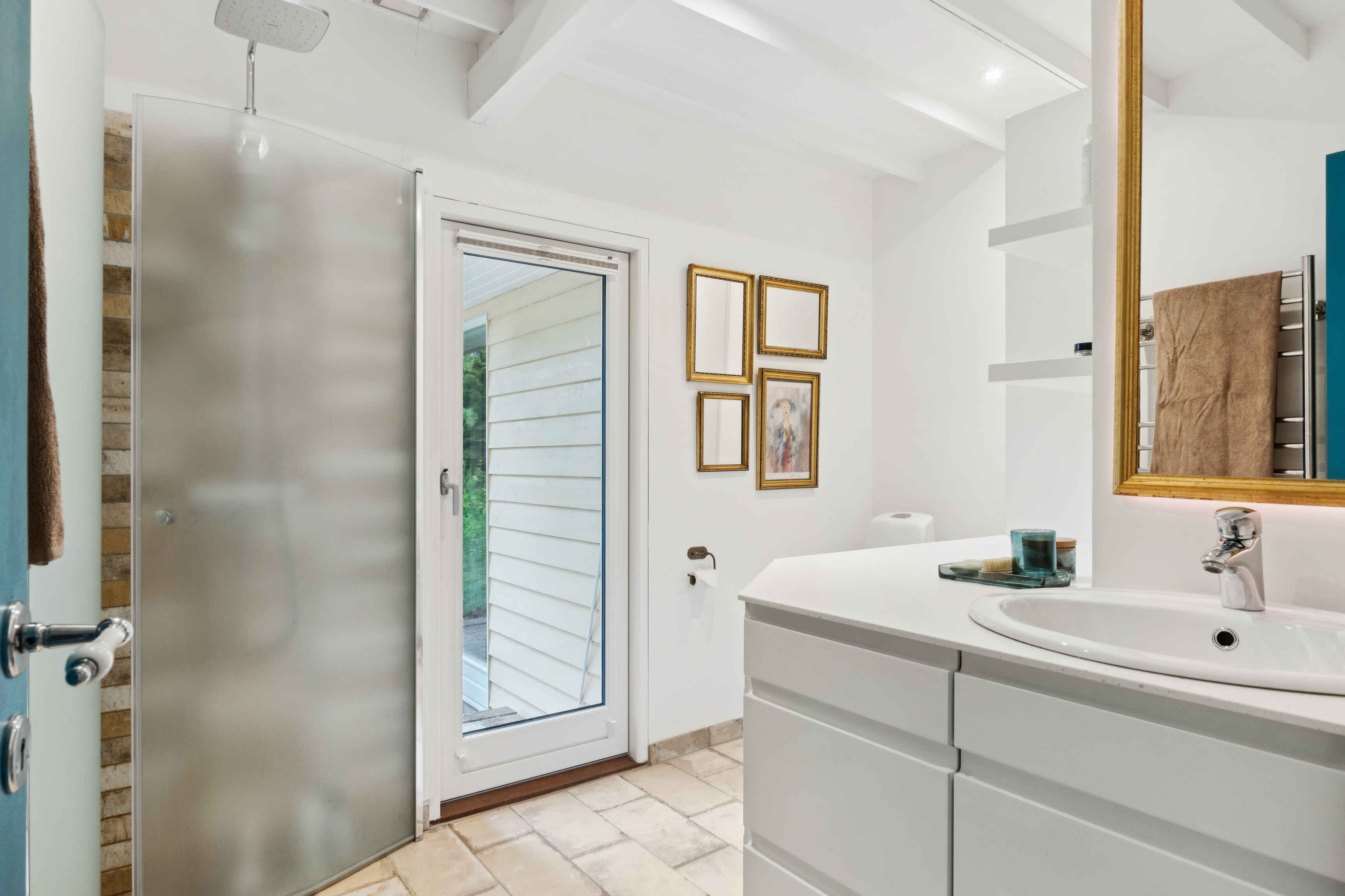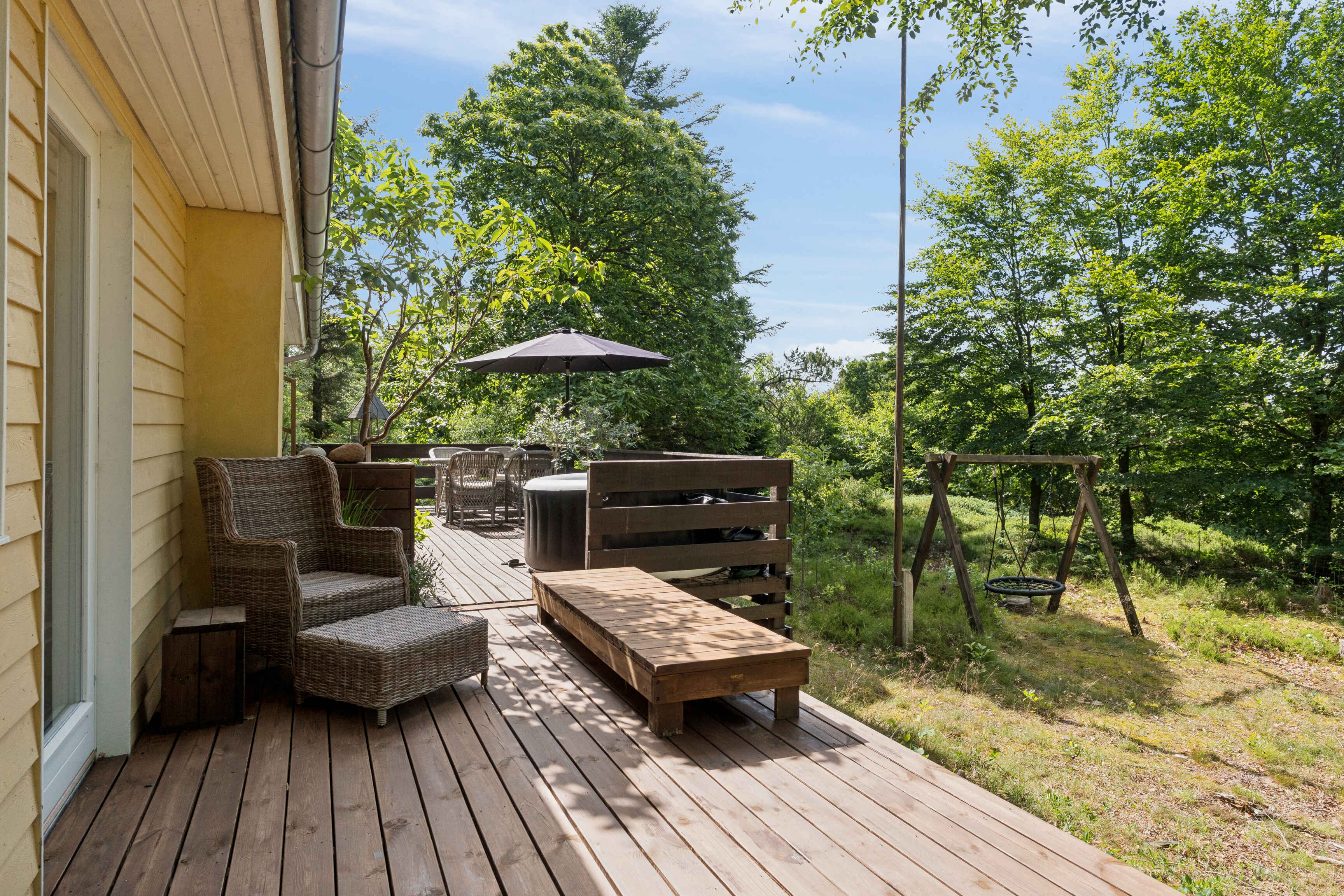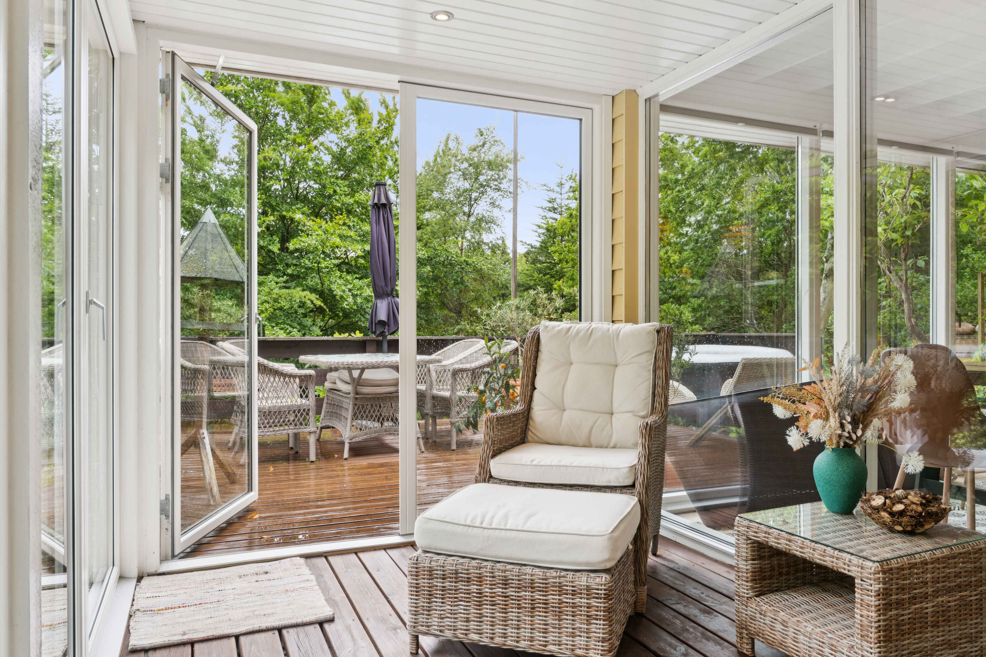 Rundt om huset finder du flere terrasser med markiser, terrassevarmere og lækre havemøbler. Uanset vindretning kan du finde læ og sol. Haven er anlagt med respekt for natur og biodiversitet og emmer af ro. Det grønne energiforbrug sikrer, at opholdet er bæredygtigt.