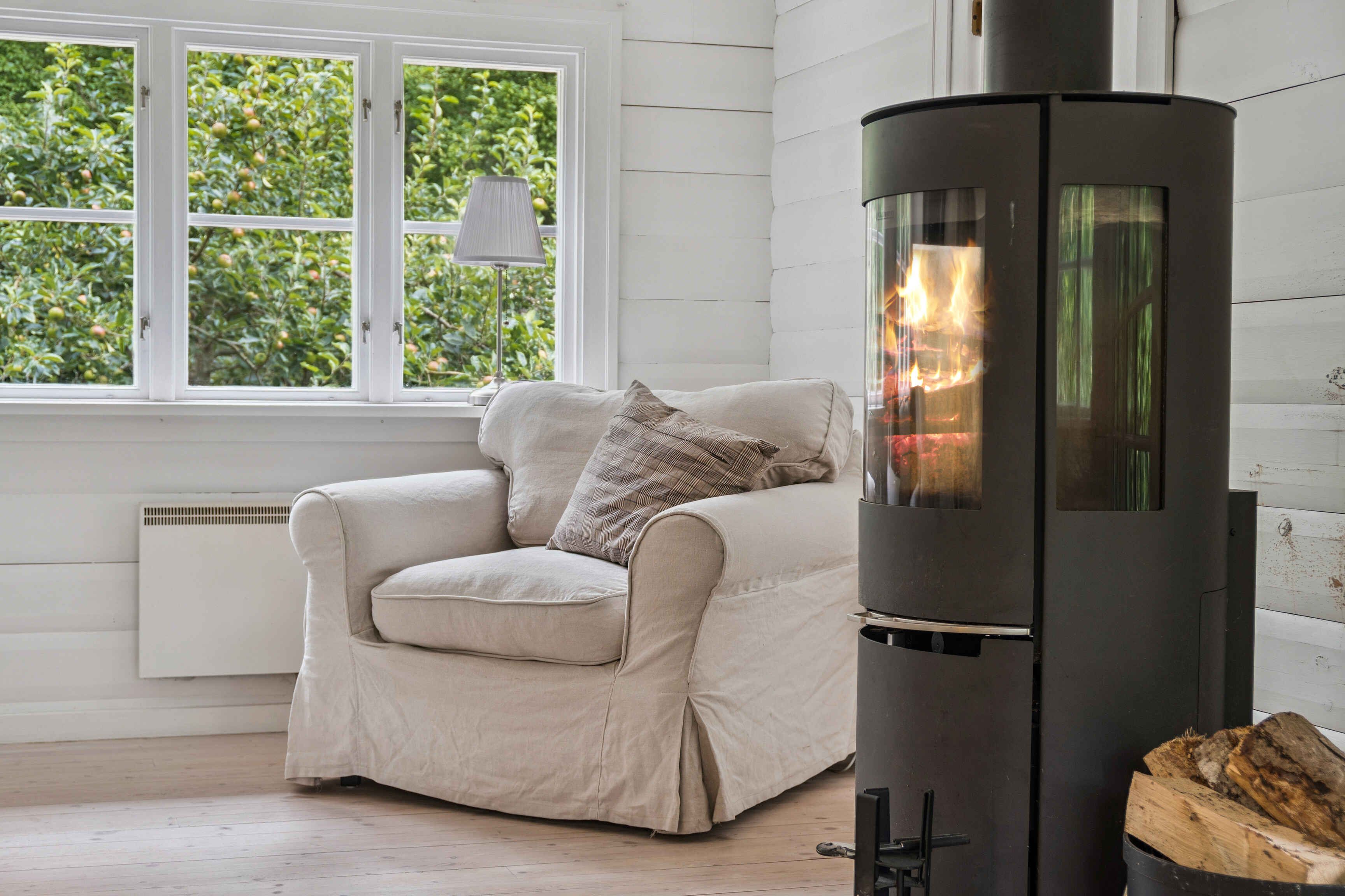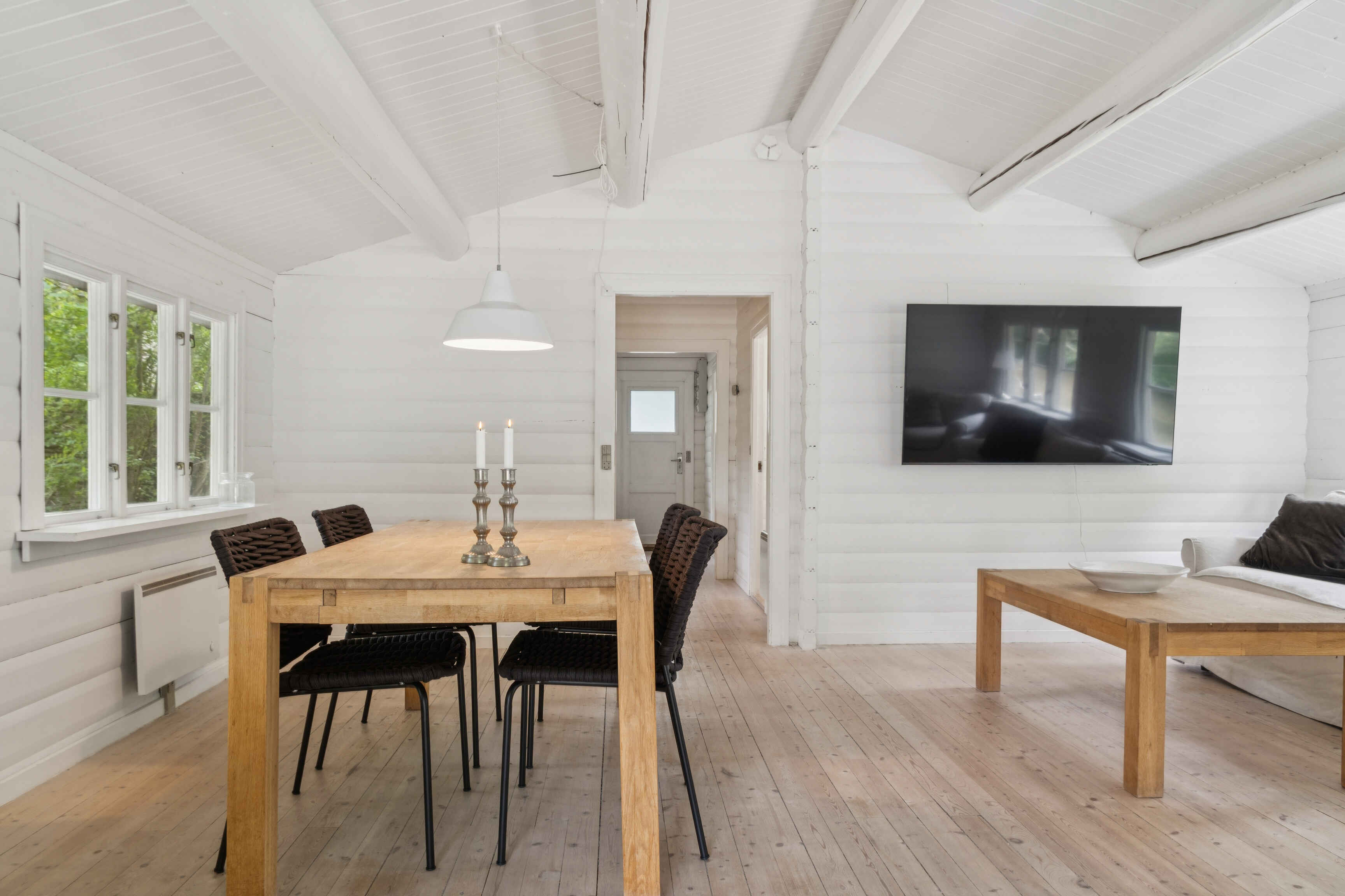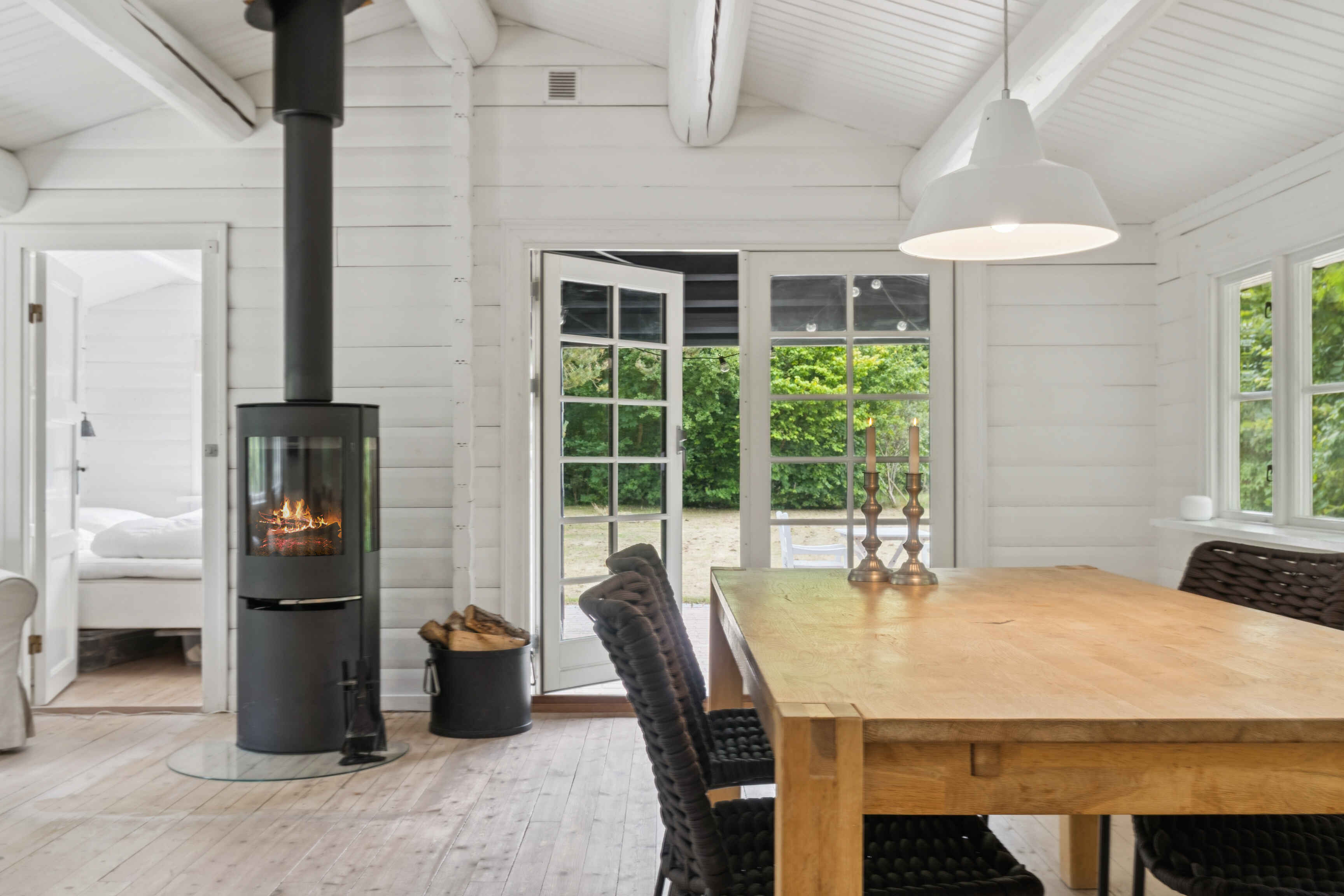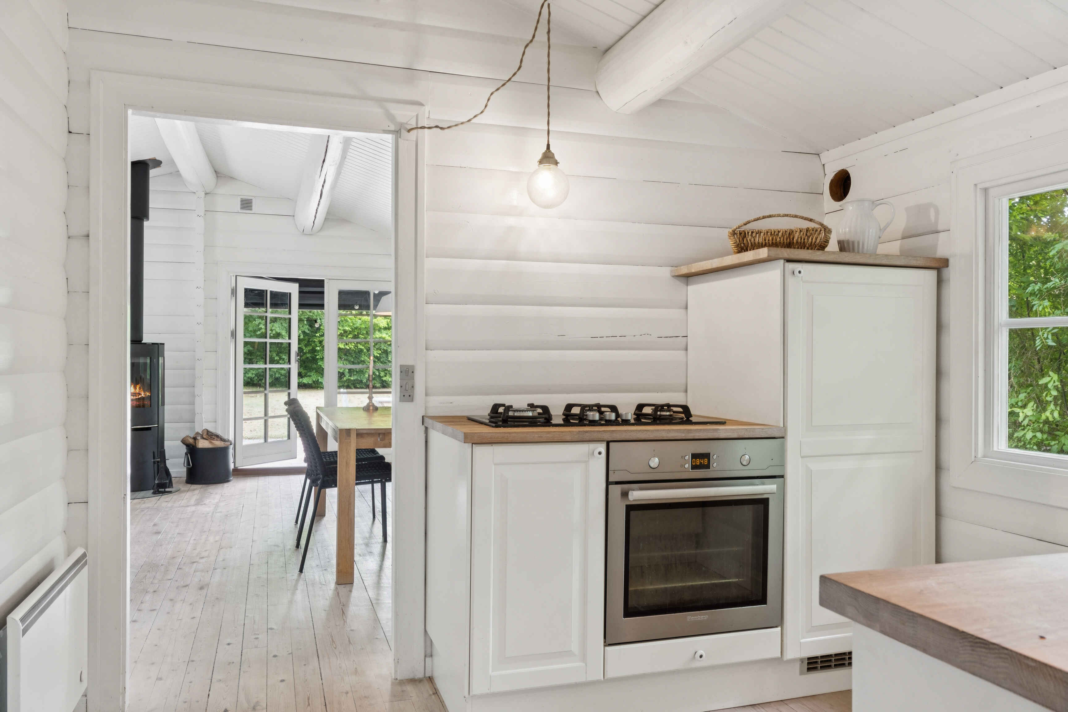 Indenfor finder du tre gode soveværelser og i alt fem sovepladser. Det åbne køkken og det pæne, hvide badeværelse er begge velholdte. Stuen har både en hyggelig spiseplads og en hørsofagruppe foran en 65\" fladskærm og en nyere brændeovn med glaslåger.