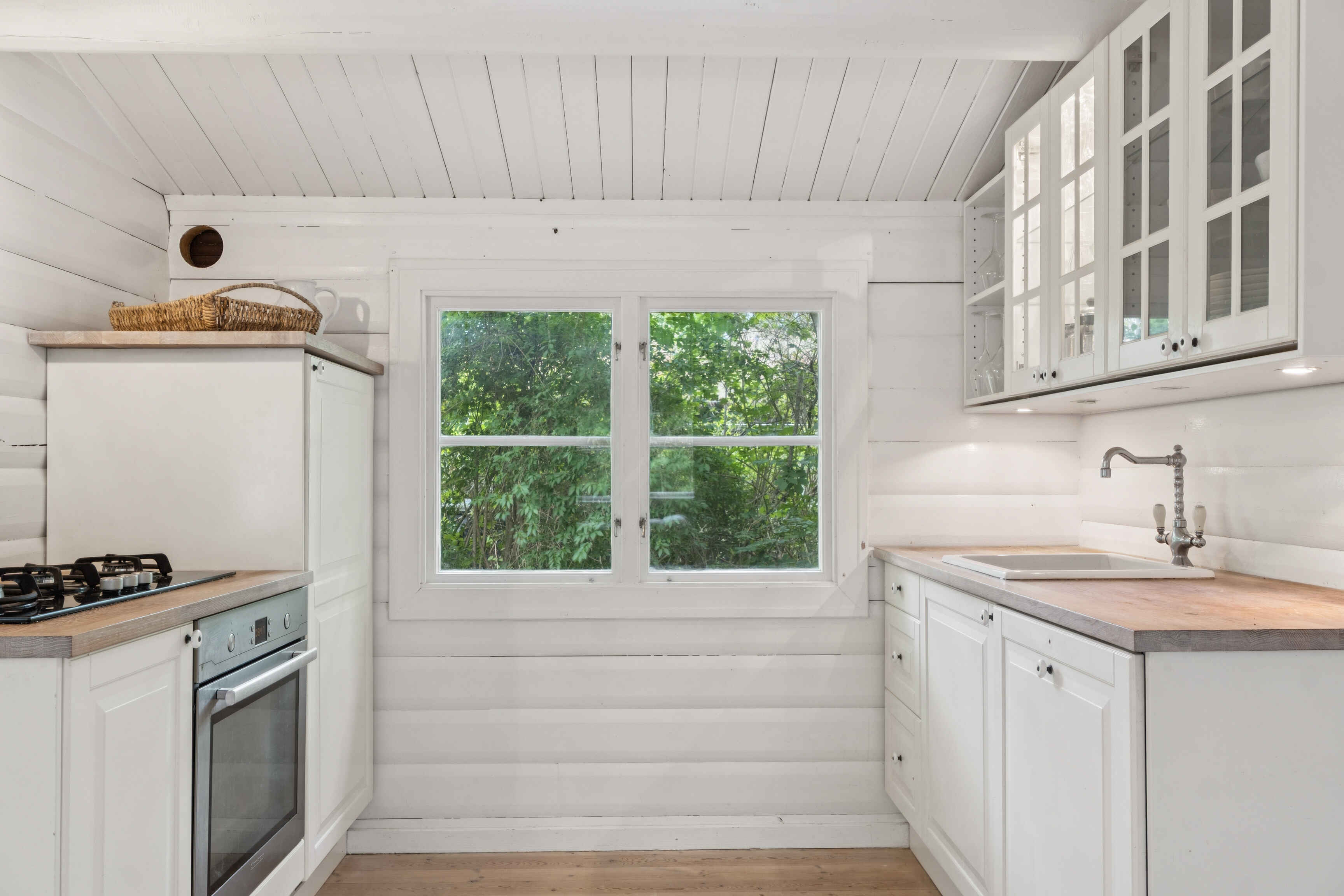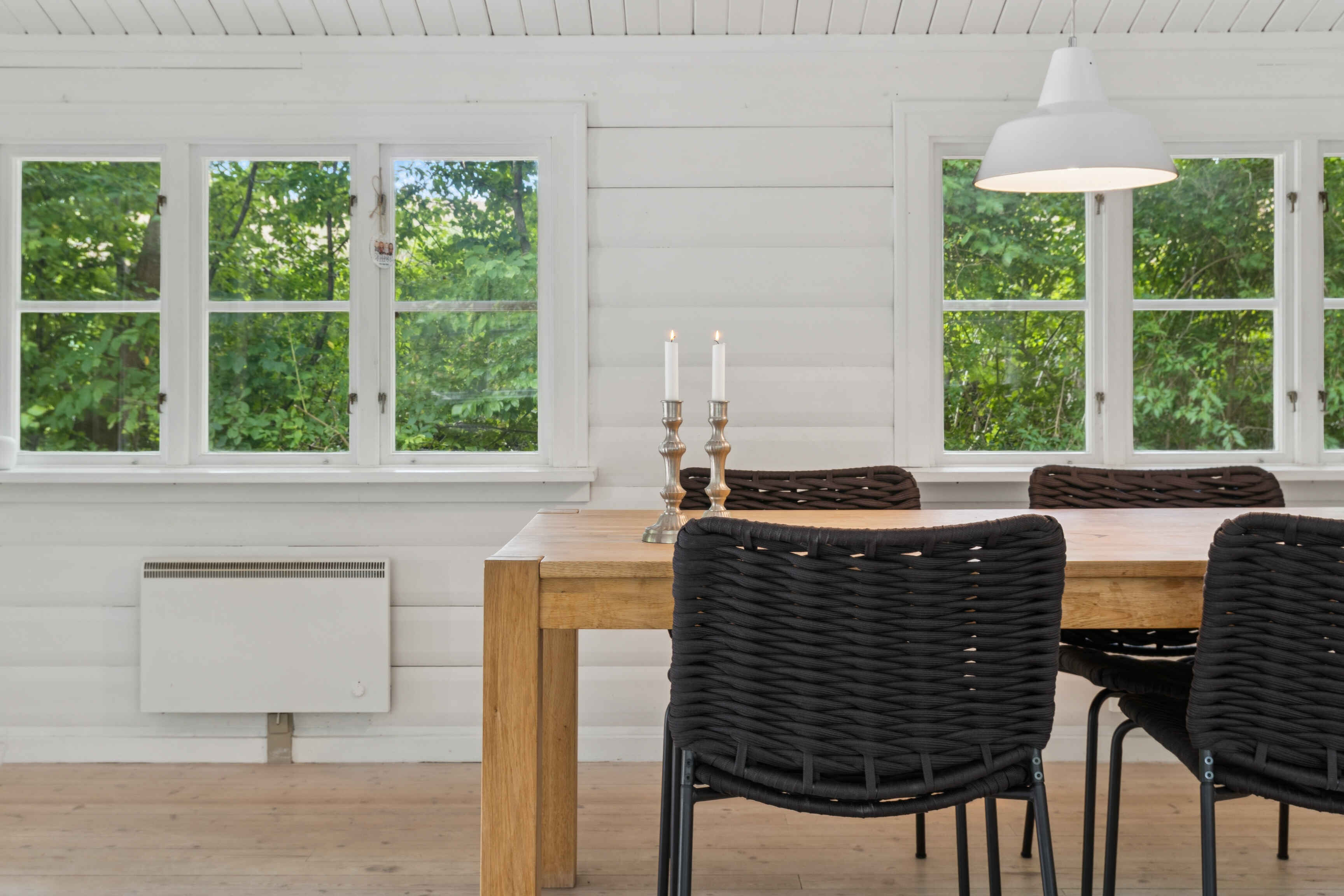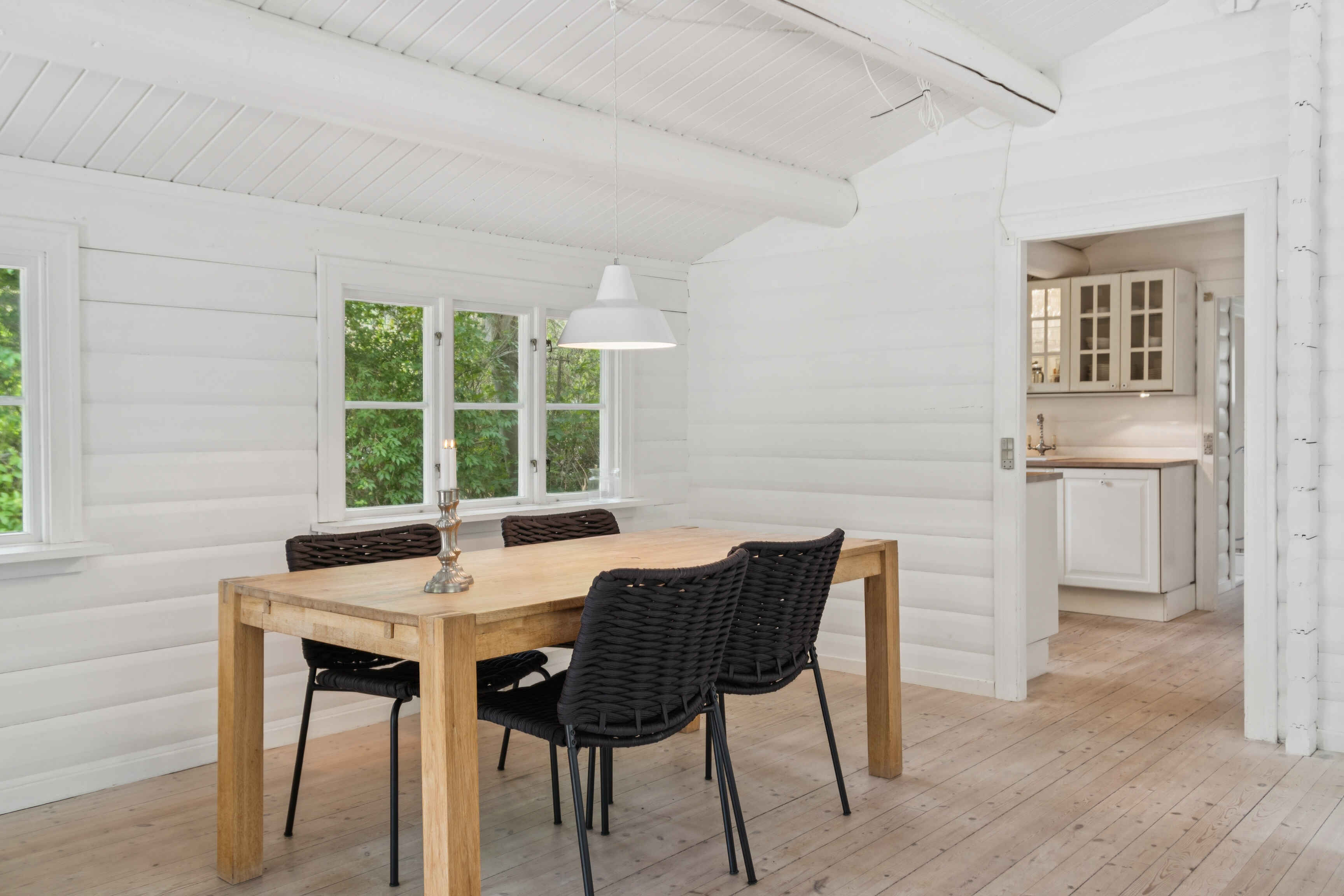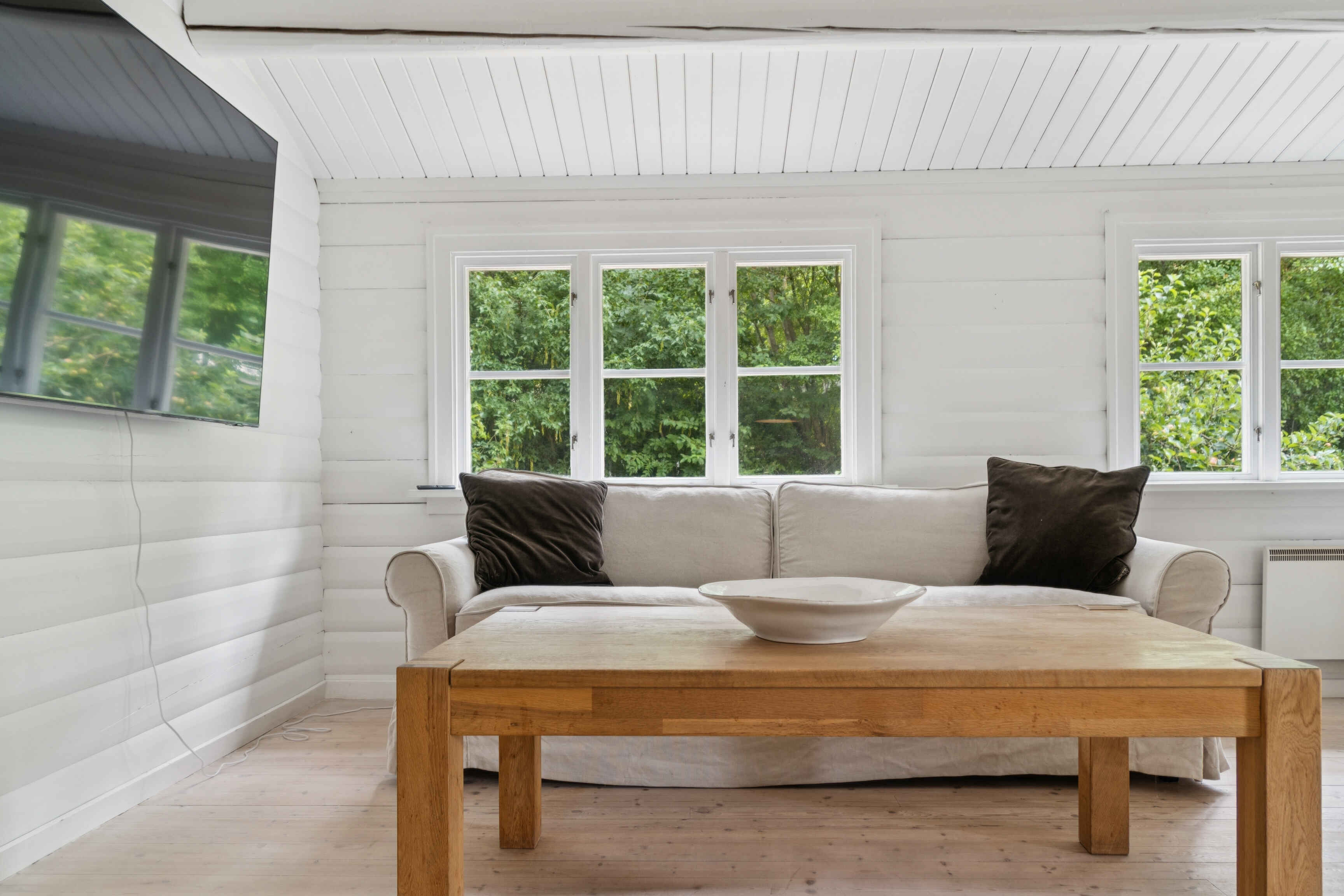 Indenfor finder du tre gode soveværelser og i alt fem sovepladser. Det åbne køkken og det pæne, hvide badeværelse er begge velholdte. Stuen har både en hyggelig spiseplads og en hørsofagruppe foran en 65\" fladskærm og en nyere brændeovn med glaslåger.