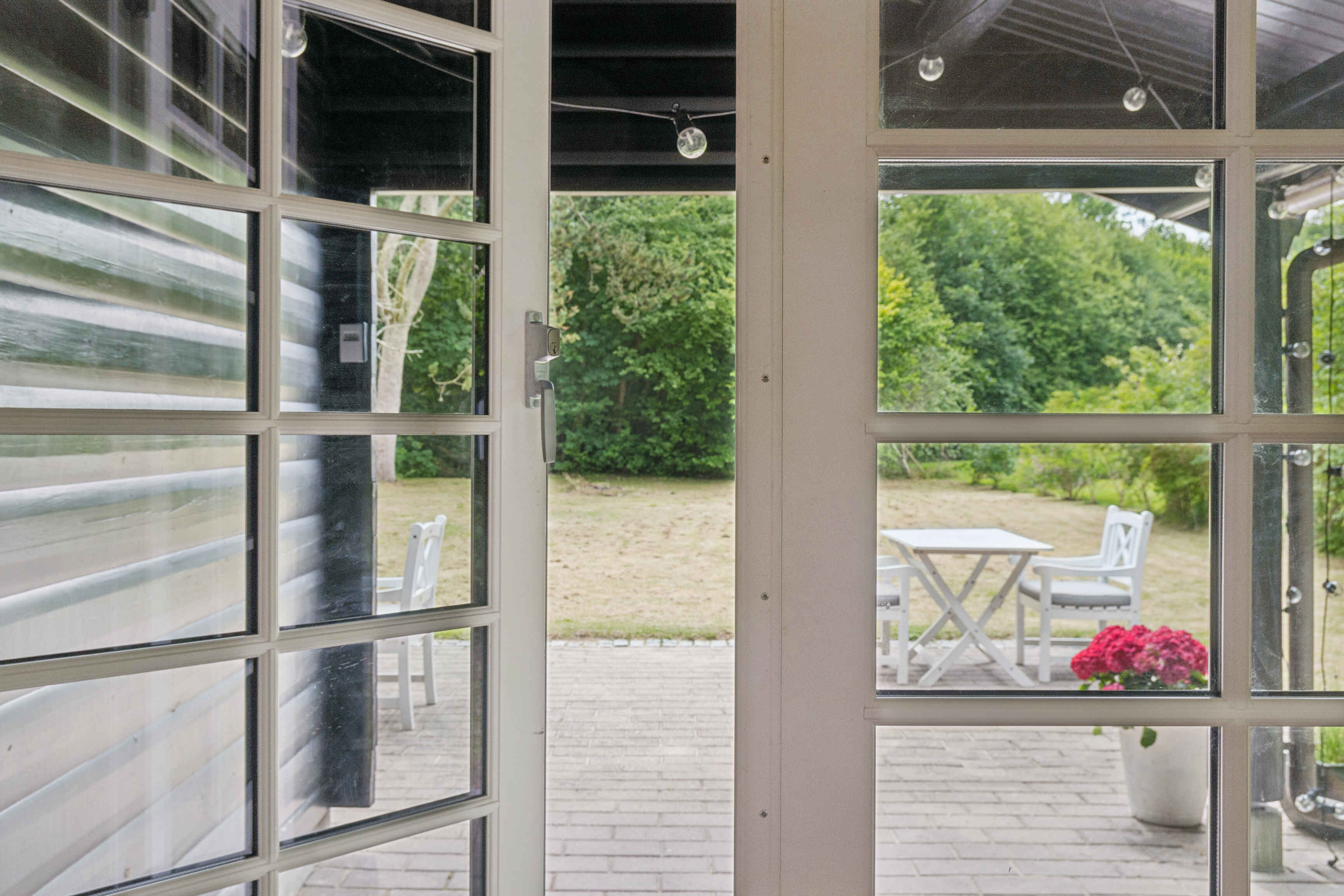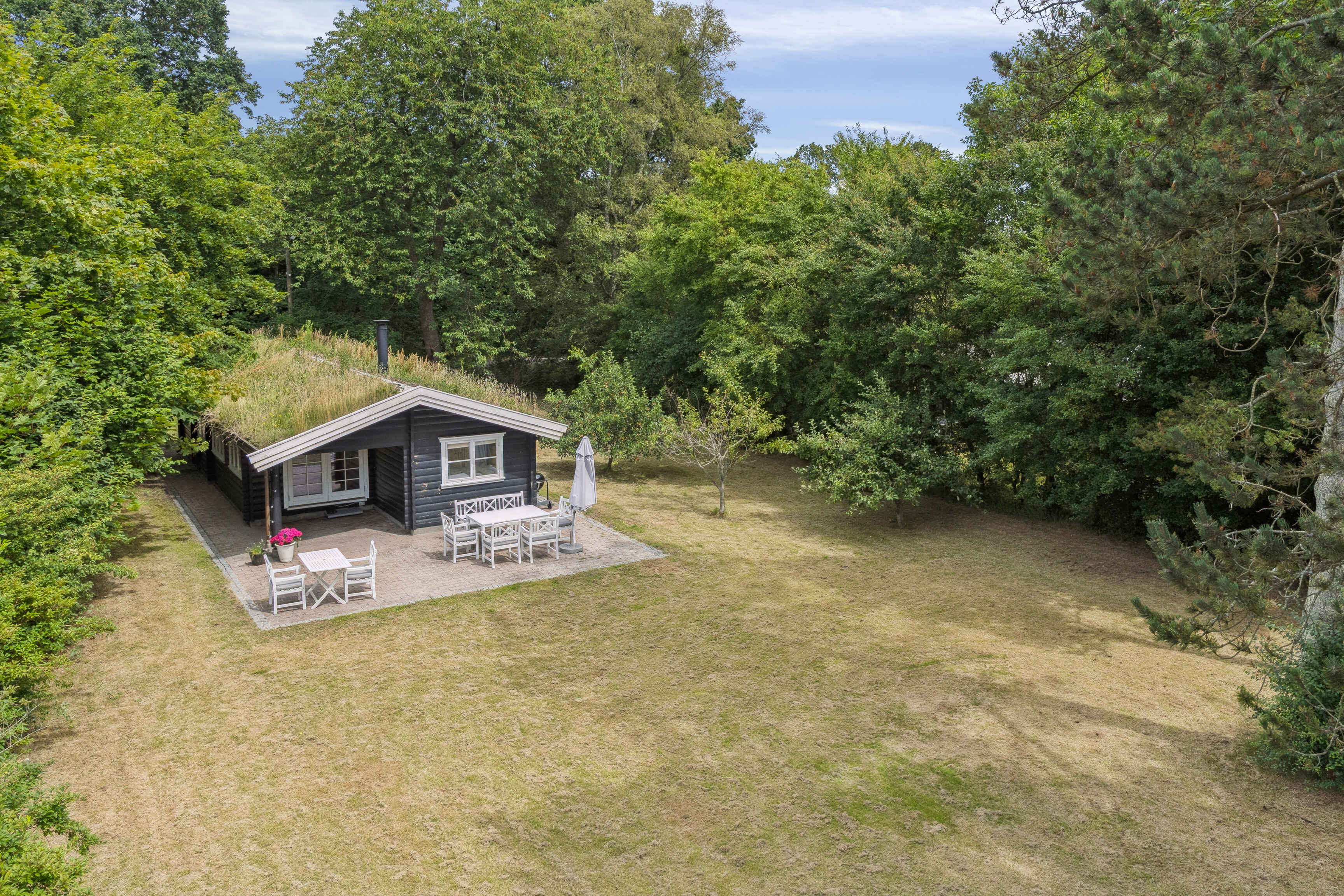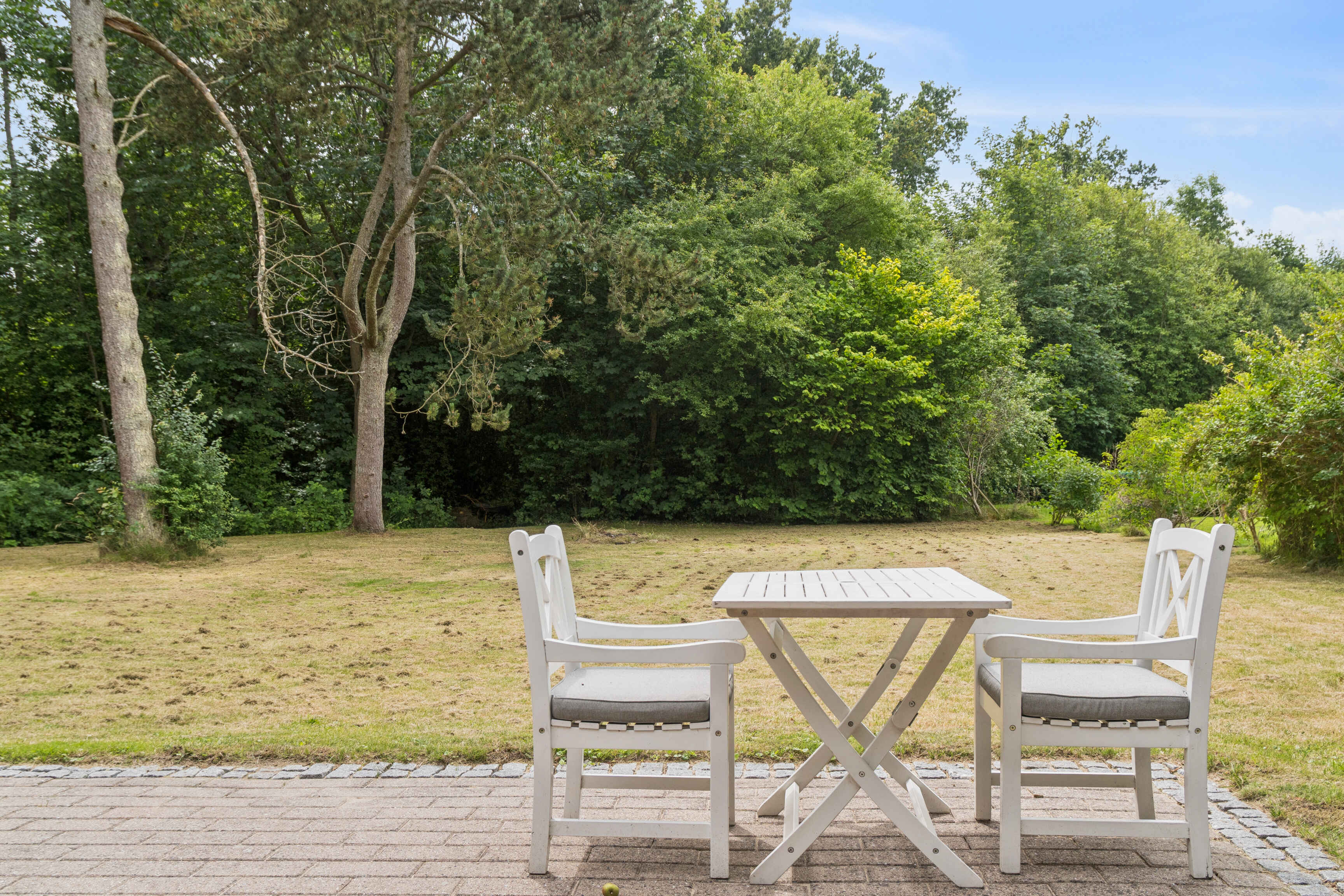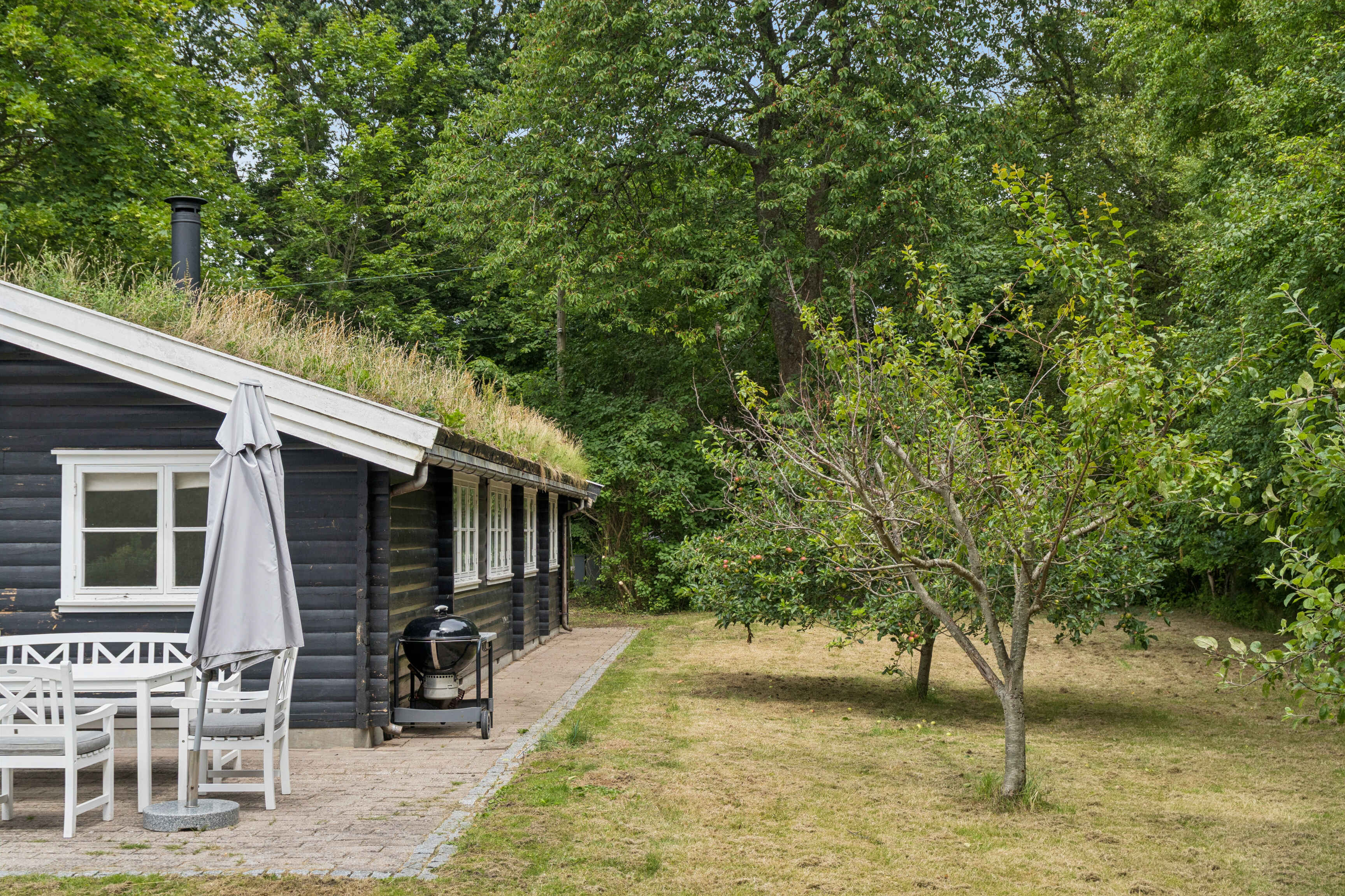 En stor, sydvendt terrasse indbyder til måltider i det fri og udsigt til naturen. Haven er hyggelig og rummelig med frugttræer, bålplads og en stor græsplæne, hvor børn og voksne kan lege og slappe af i fredelige omgivelser.