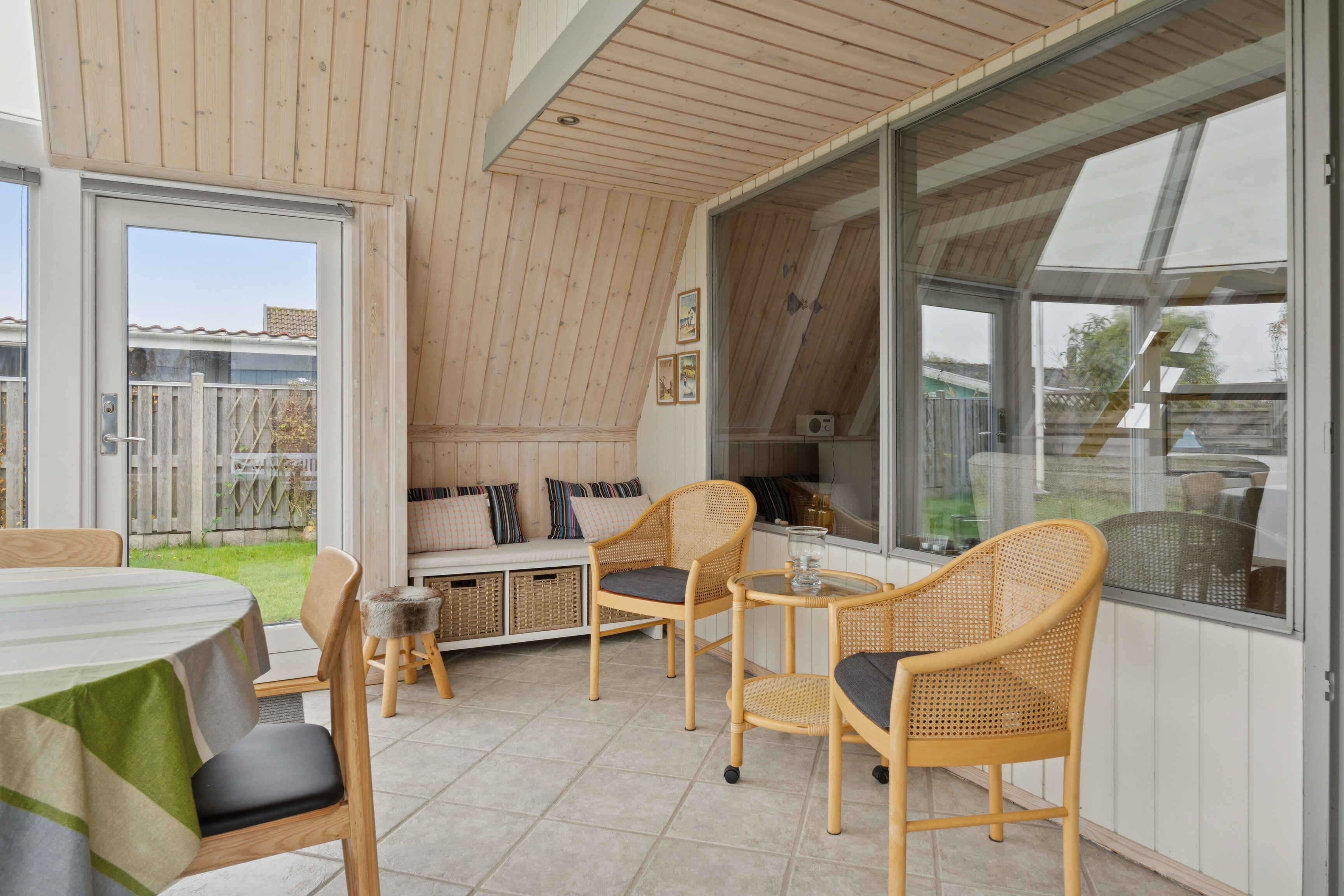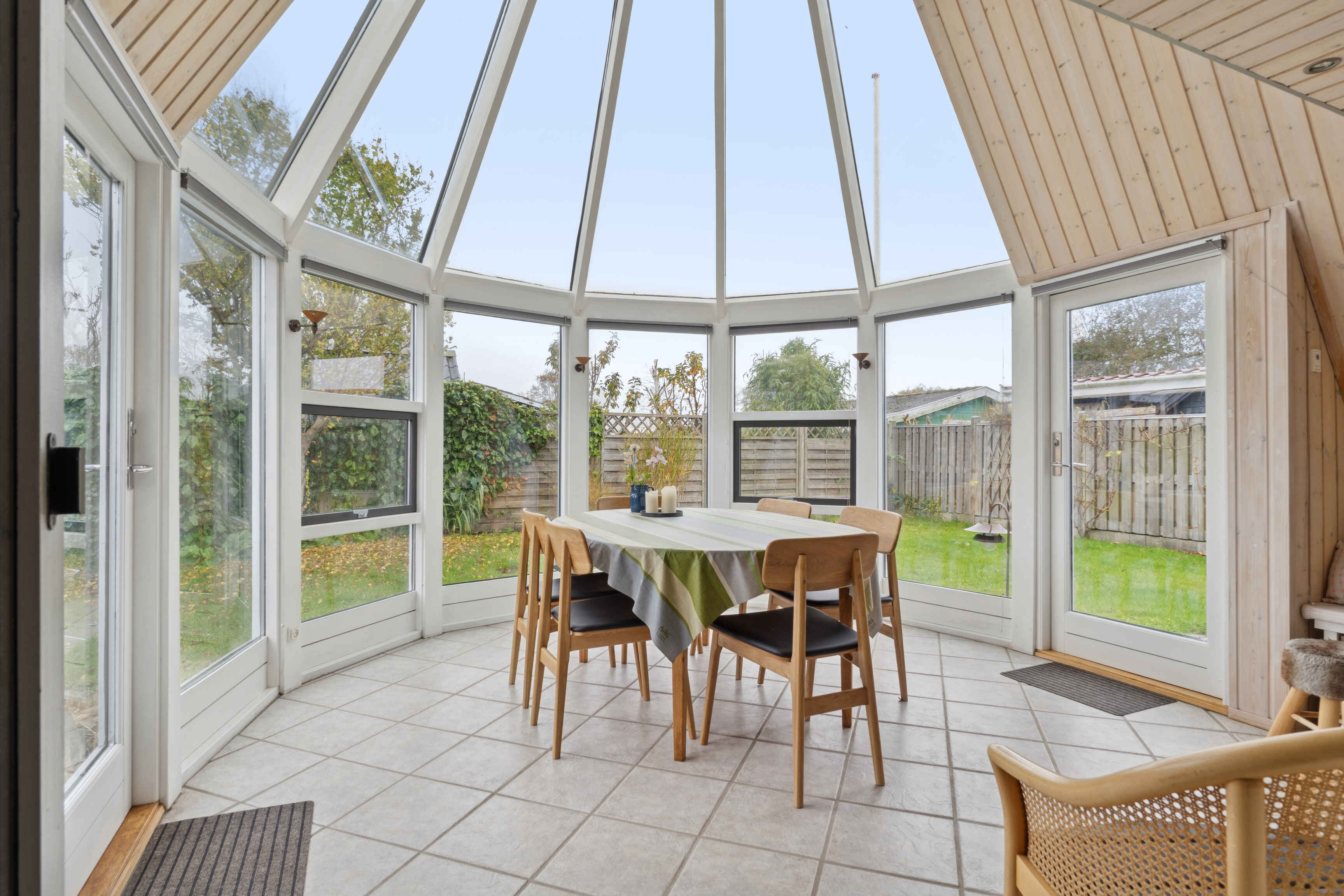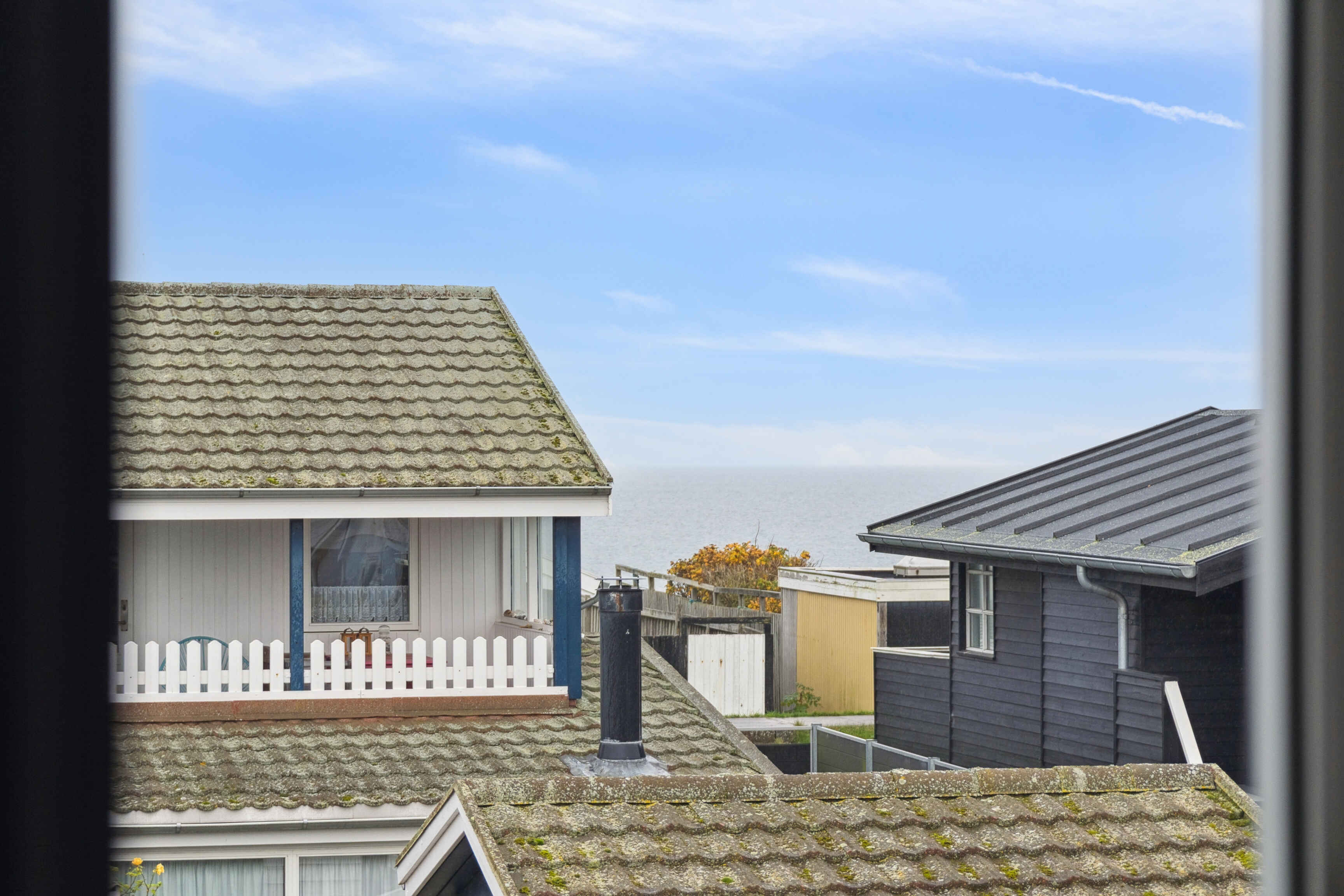 Fra stuen på første sal er der udsigt over havet. Herfra kan man følge dagens skiftende lys og se solen forsvinde bag horisonten. I stueplan ligger den lyse udestue, der forlænger sommeren og inviterer til måltider eller stille stunder, uanset vejret.