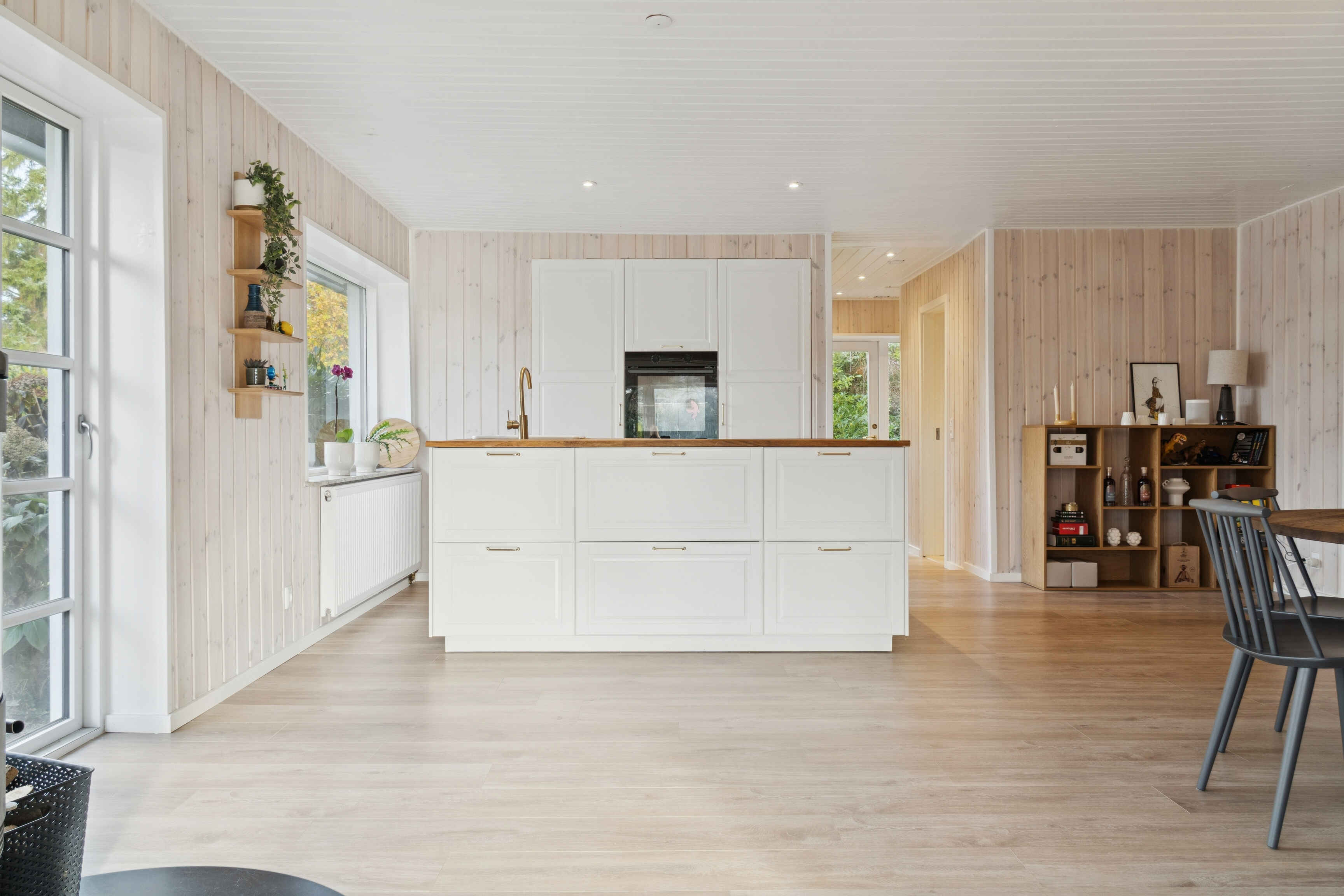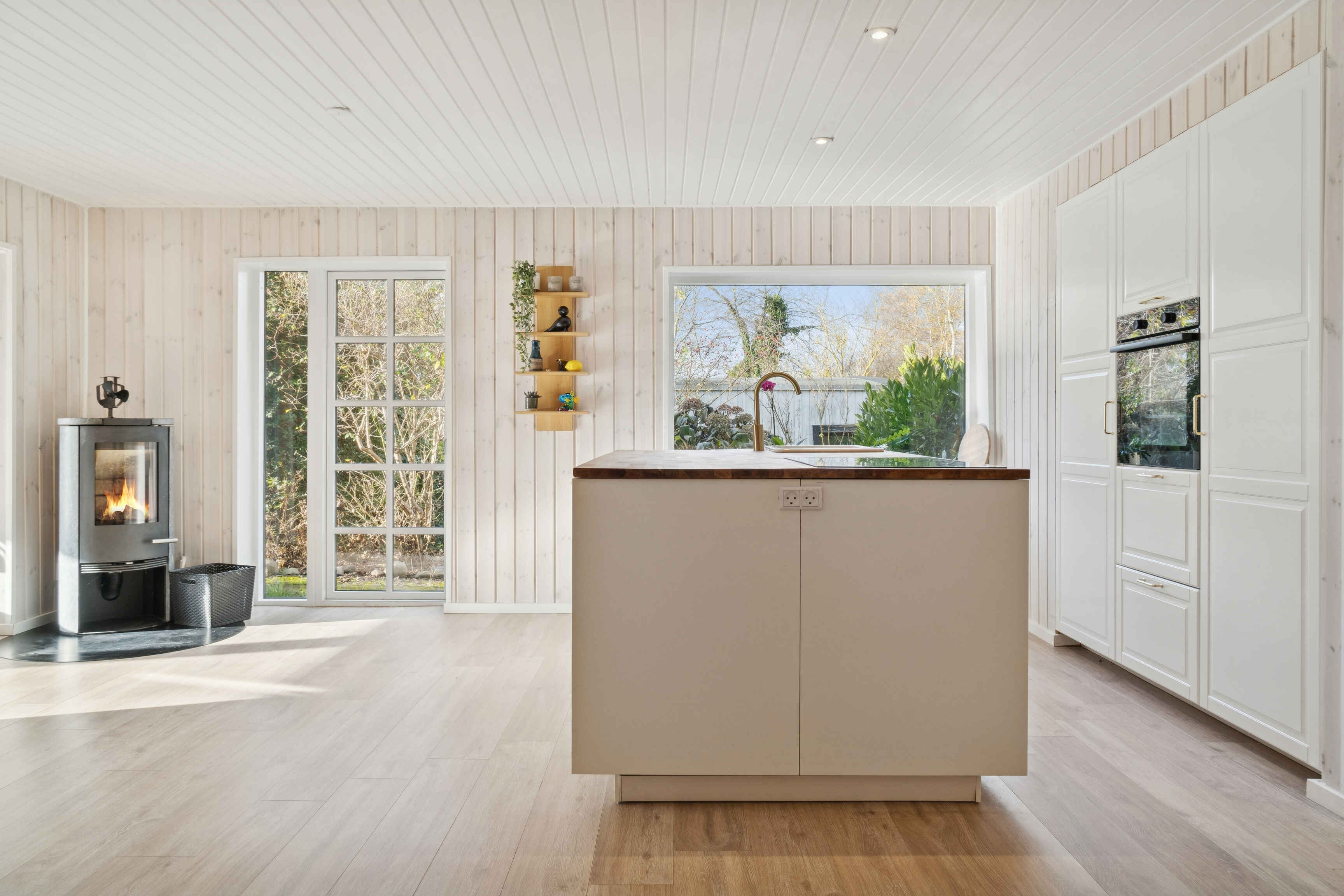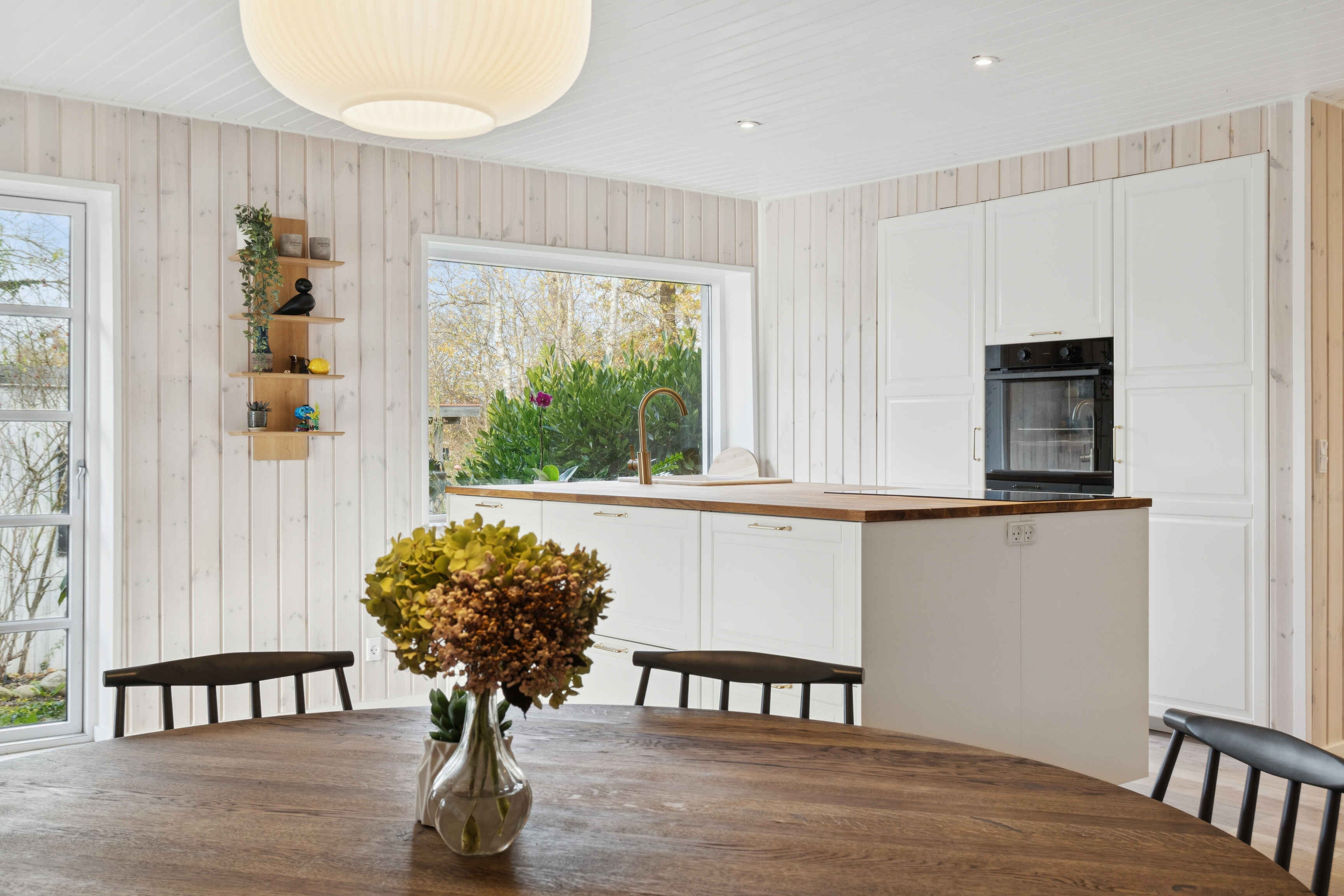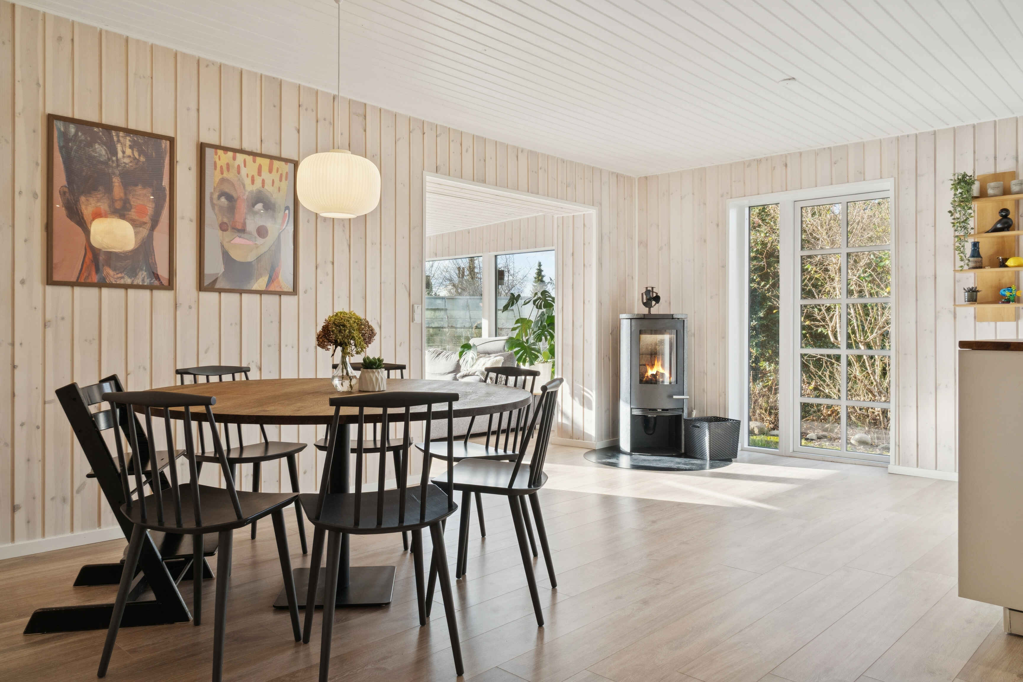 Det nyrenoverede sommerhus tilbyder 120 m² med lyst og åbent køkkenalrum. Her samles familien omkring det runde spisebord i mørkt træ, mens brændeovnen giver varme og ro. Rummet skaber en naturlig base for hyggelige måltider og nærvær.