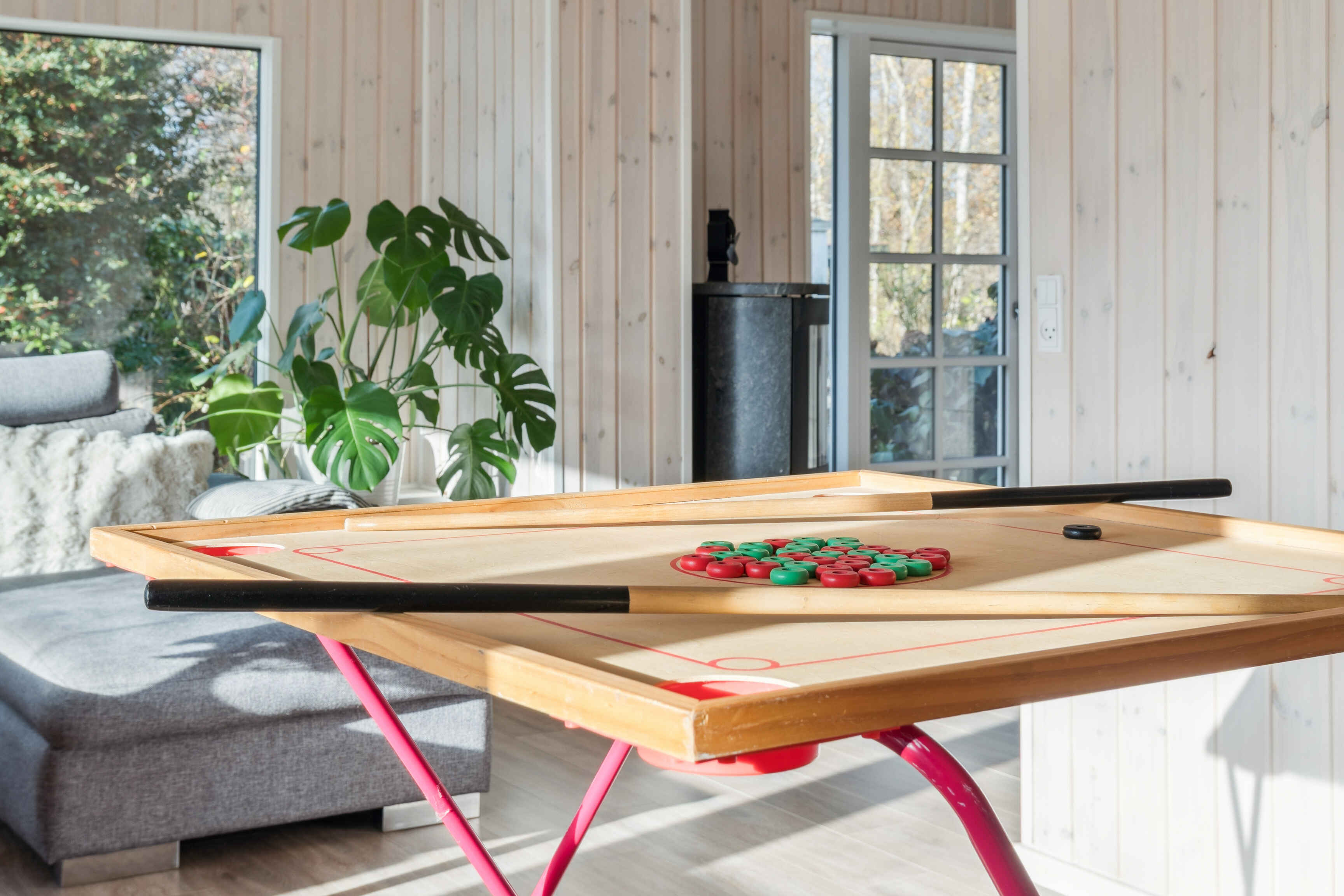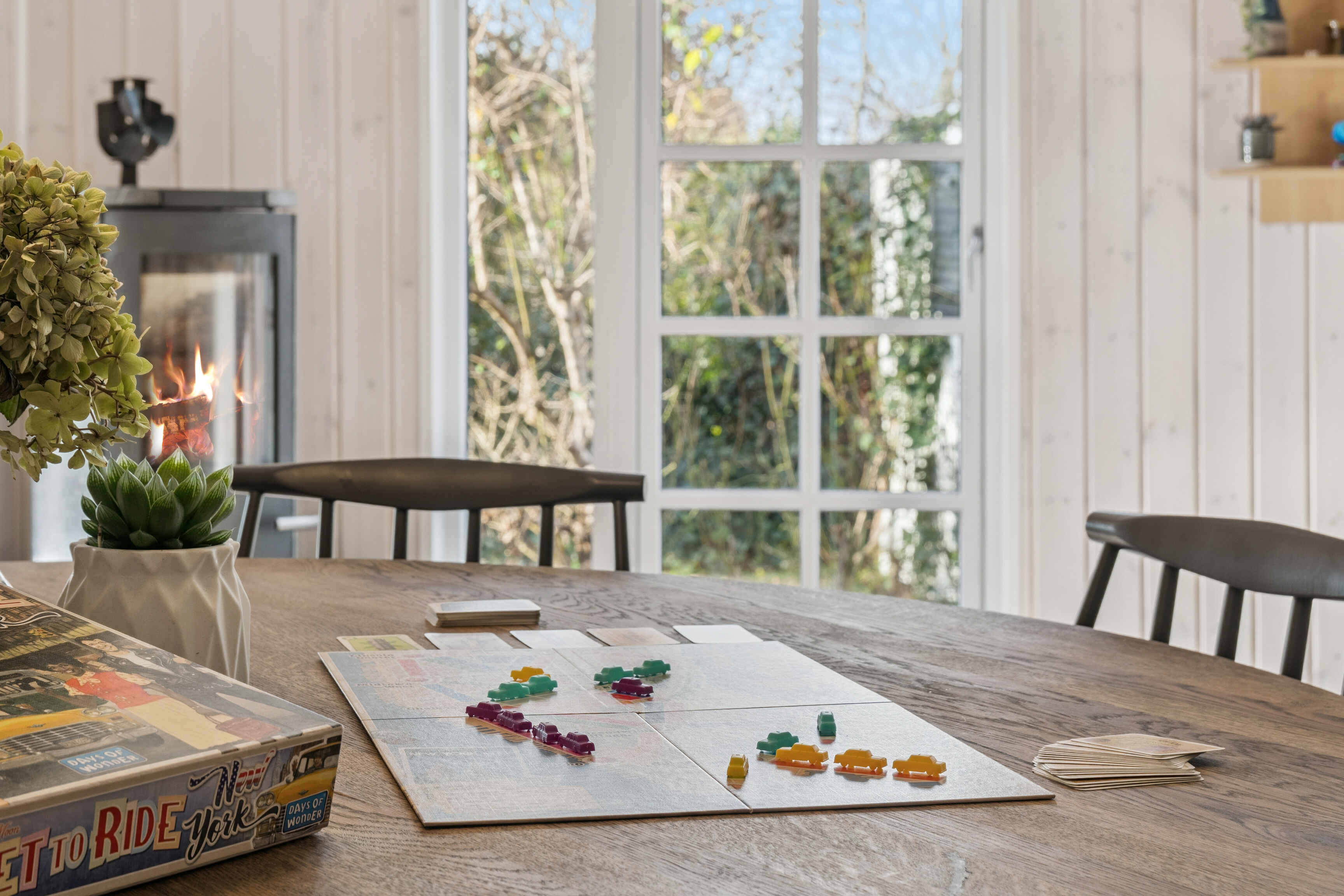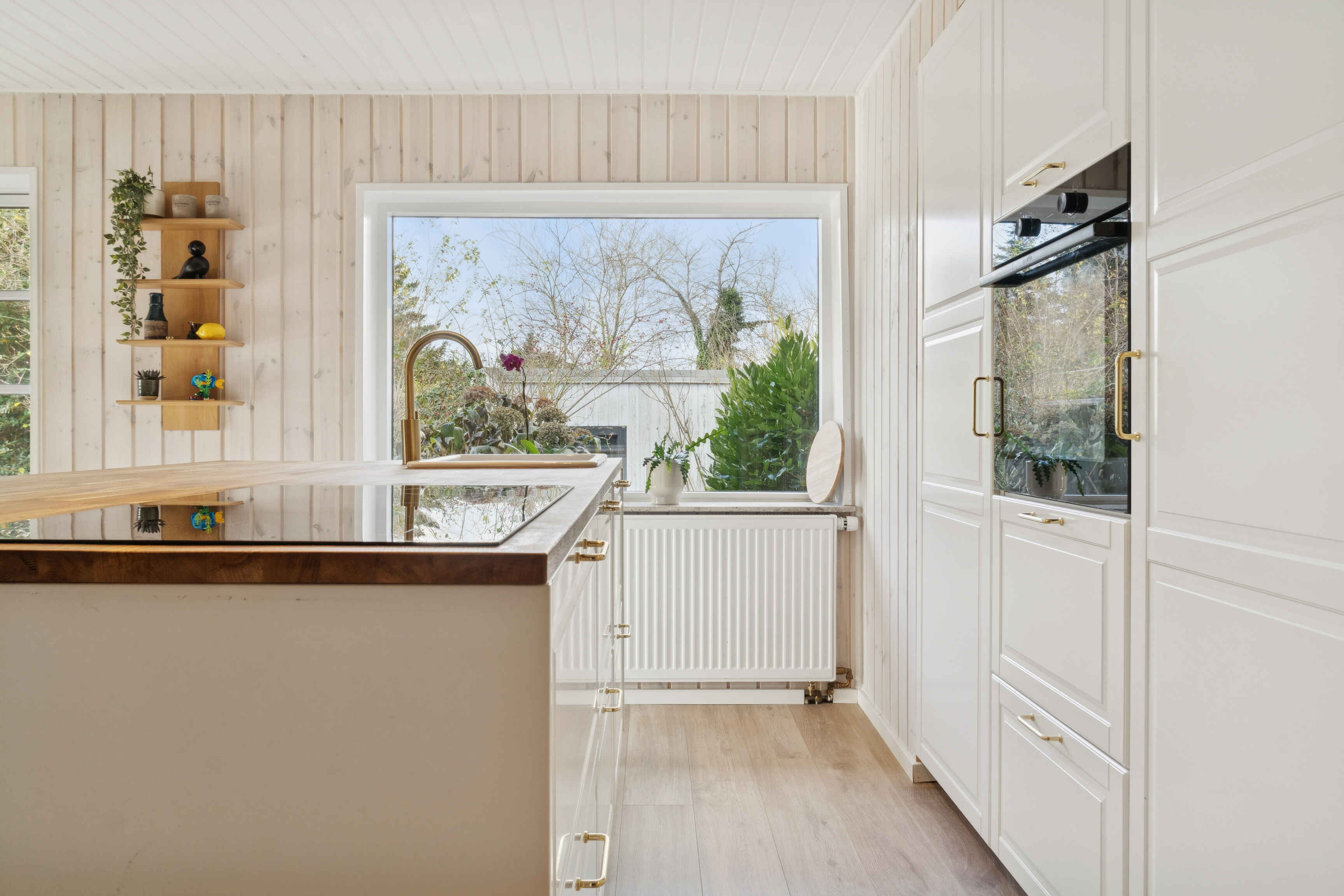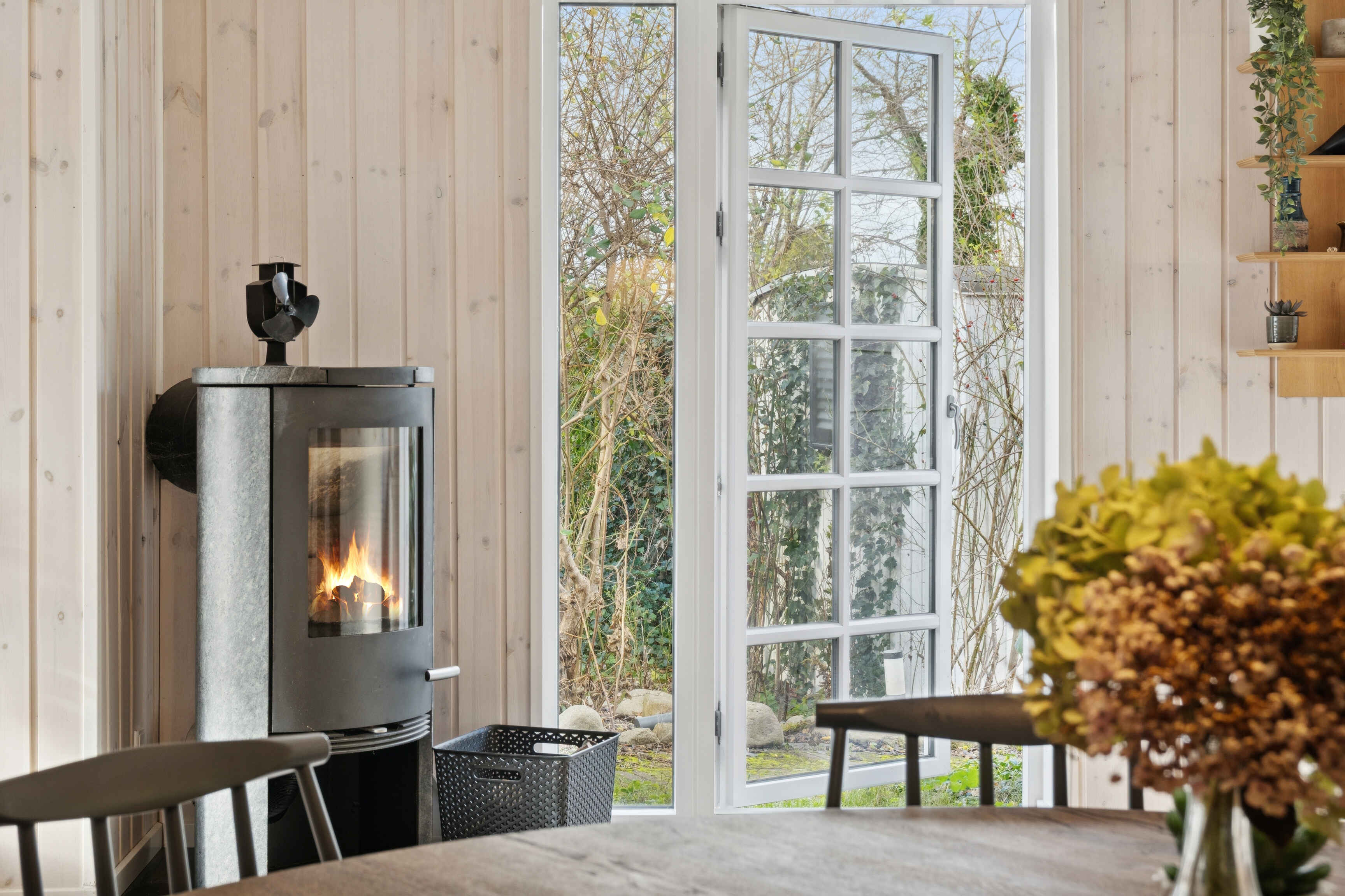 Det nyrenoverede sommerhus tilbyder 120 m² med lyst og åbent køkkenalrum. Her samles familien omkring det runde spisebord i mørkt træ, mens brændeovnen giver varme og ro. Rummet skaber en naturlig base for hyggelige måltider og nærvær.