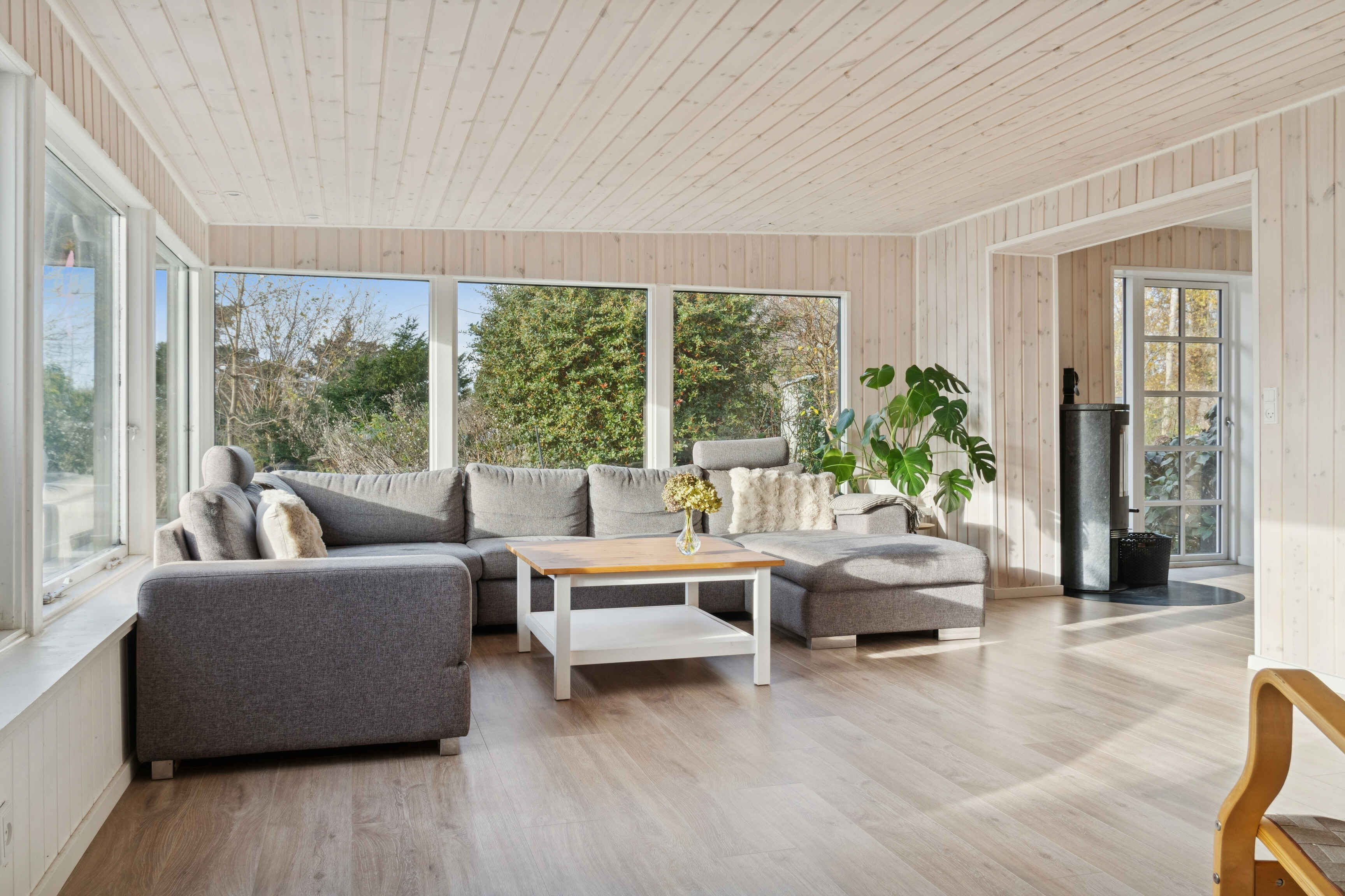 Stuen har en stor sofa, hvor alle kan slappe maks af. De mange vinduespartier giver et flot lysindfald og en åben fornemmelse, der gør, at naturen udenfor altid føles tæt på.