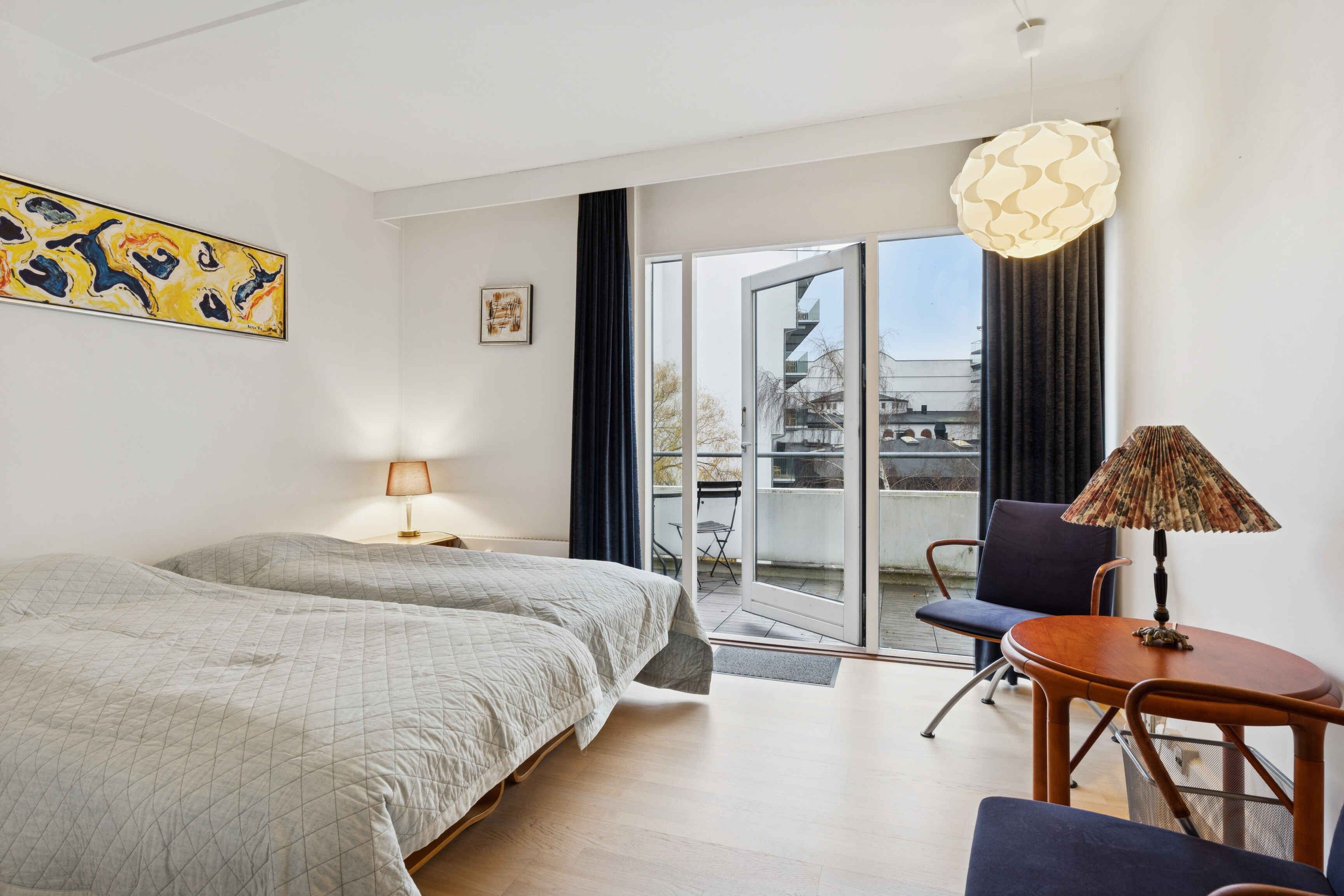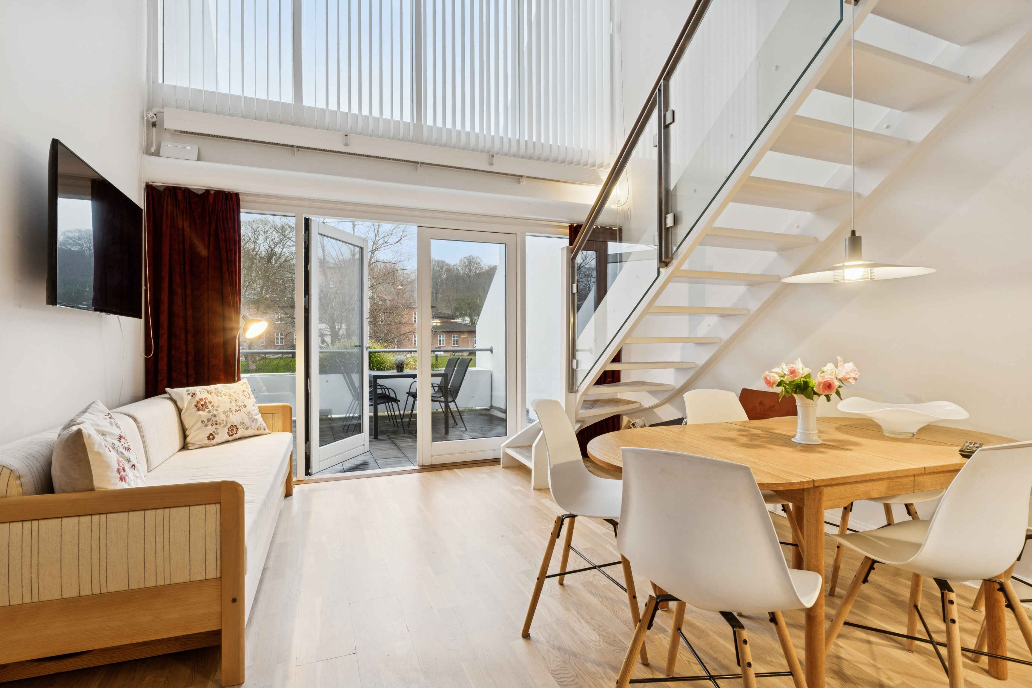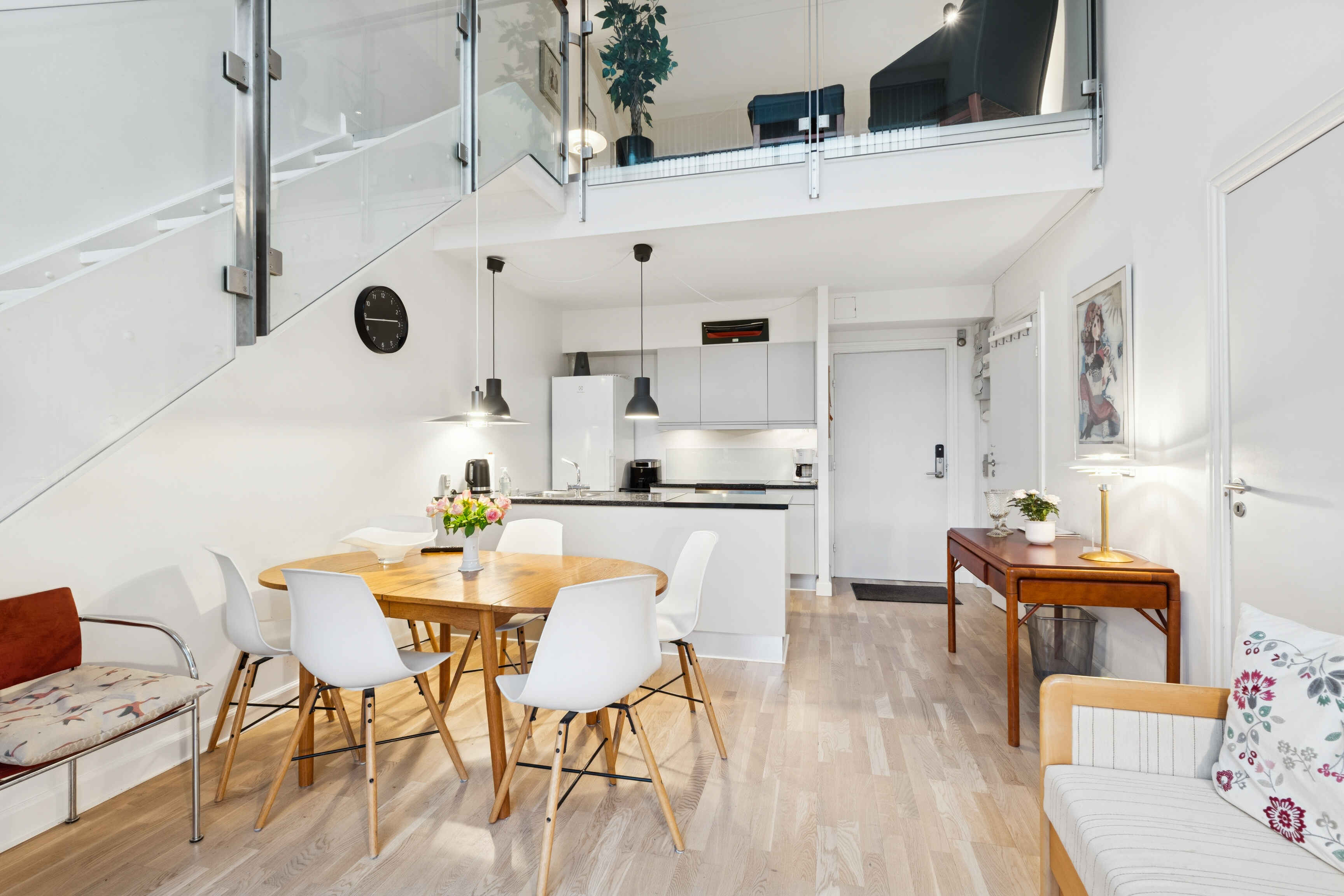 Køkkenet er rummeligt og praktisk med stort amerikansk køleskab og spiseplads til seks personer. Herfra er der direkte adgang til en sydvestvendt åben terrasse. På samme etage ligger et stort soveværelse med eget badeværelse og adgang til en overdækket terrasse, perfekt til stille stunder.