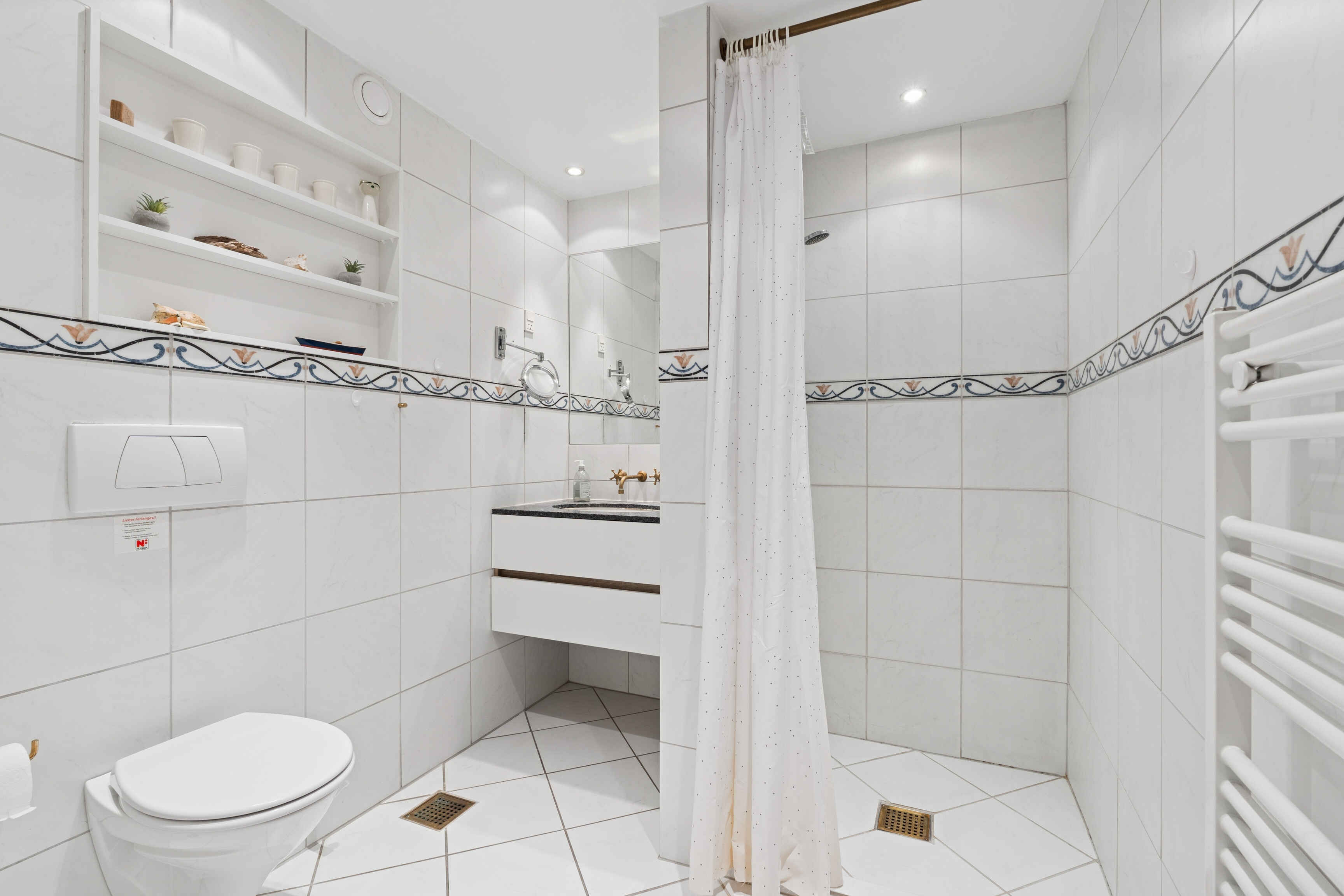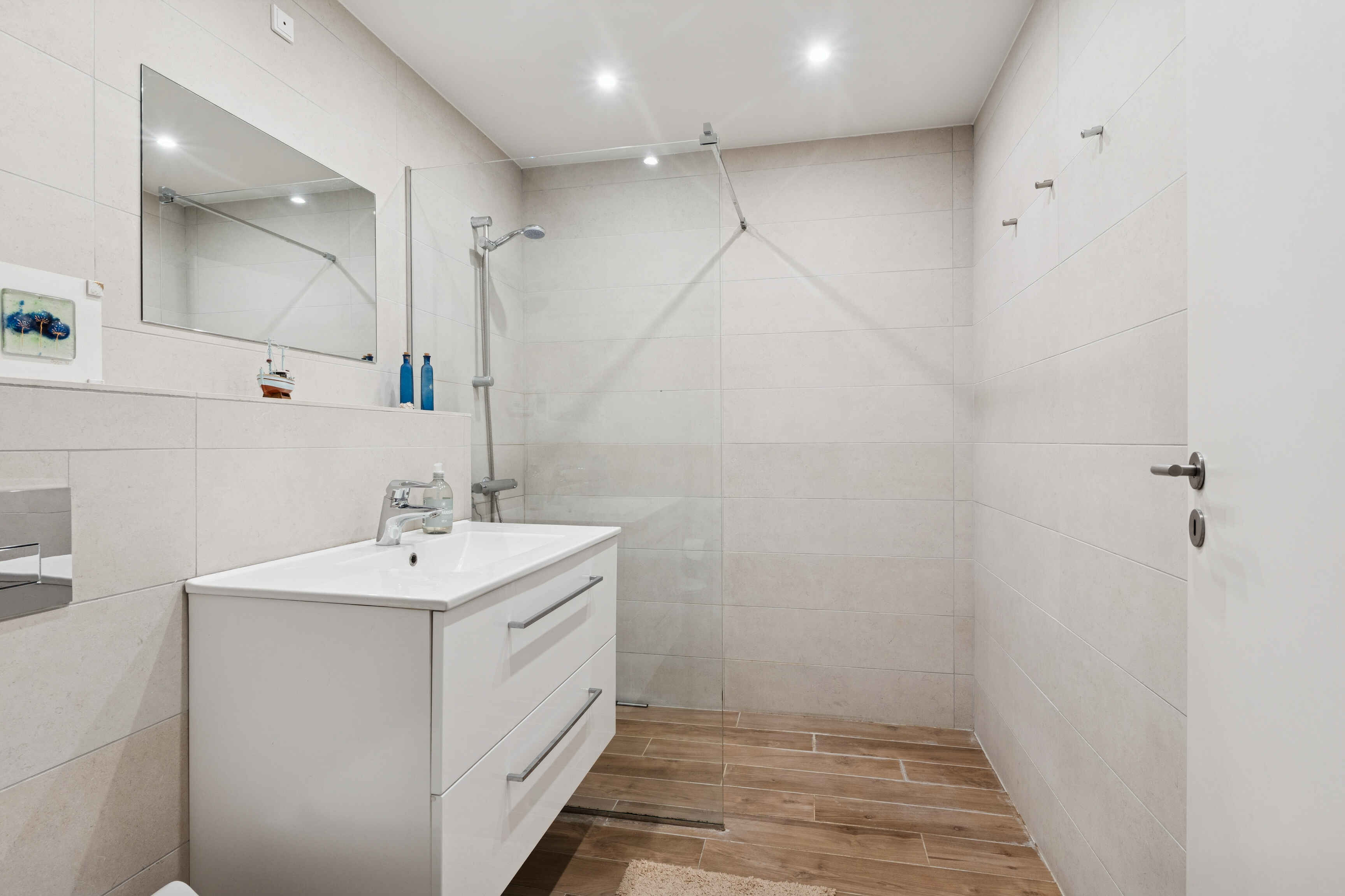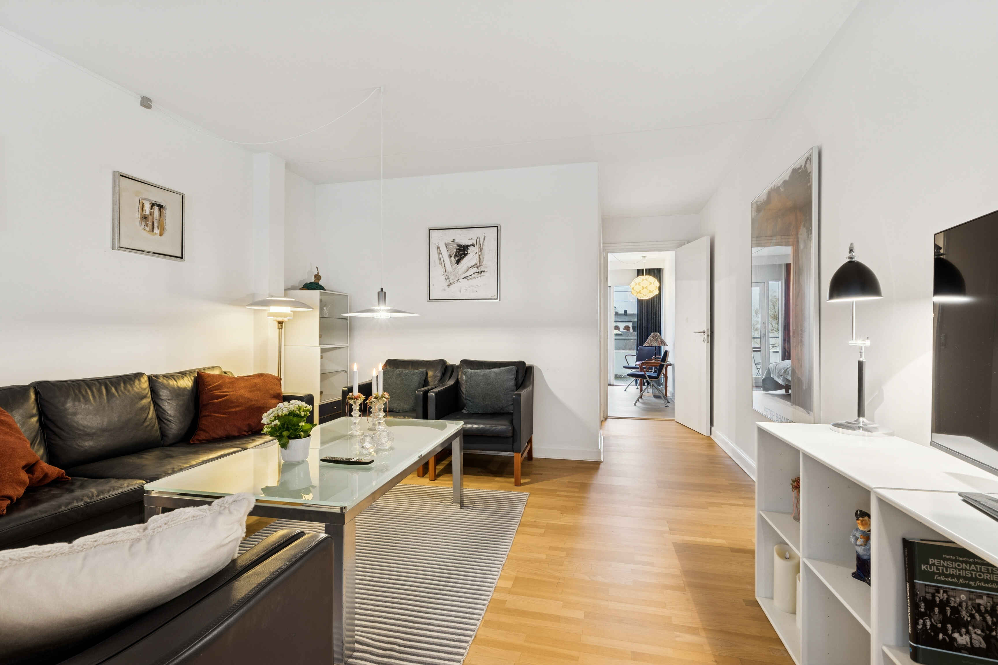 Køkkenet er rummeligt og praktisk med stort amerikansk køleskab og spiseplads til seks personer. Herfra er der direkte adgang til en sydvestvendt åben terrasse. På samme etage ligger et stort soveværelse med eget badeværelse og adgang til en overdækket terrasse, perfekt til stille stunder.