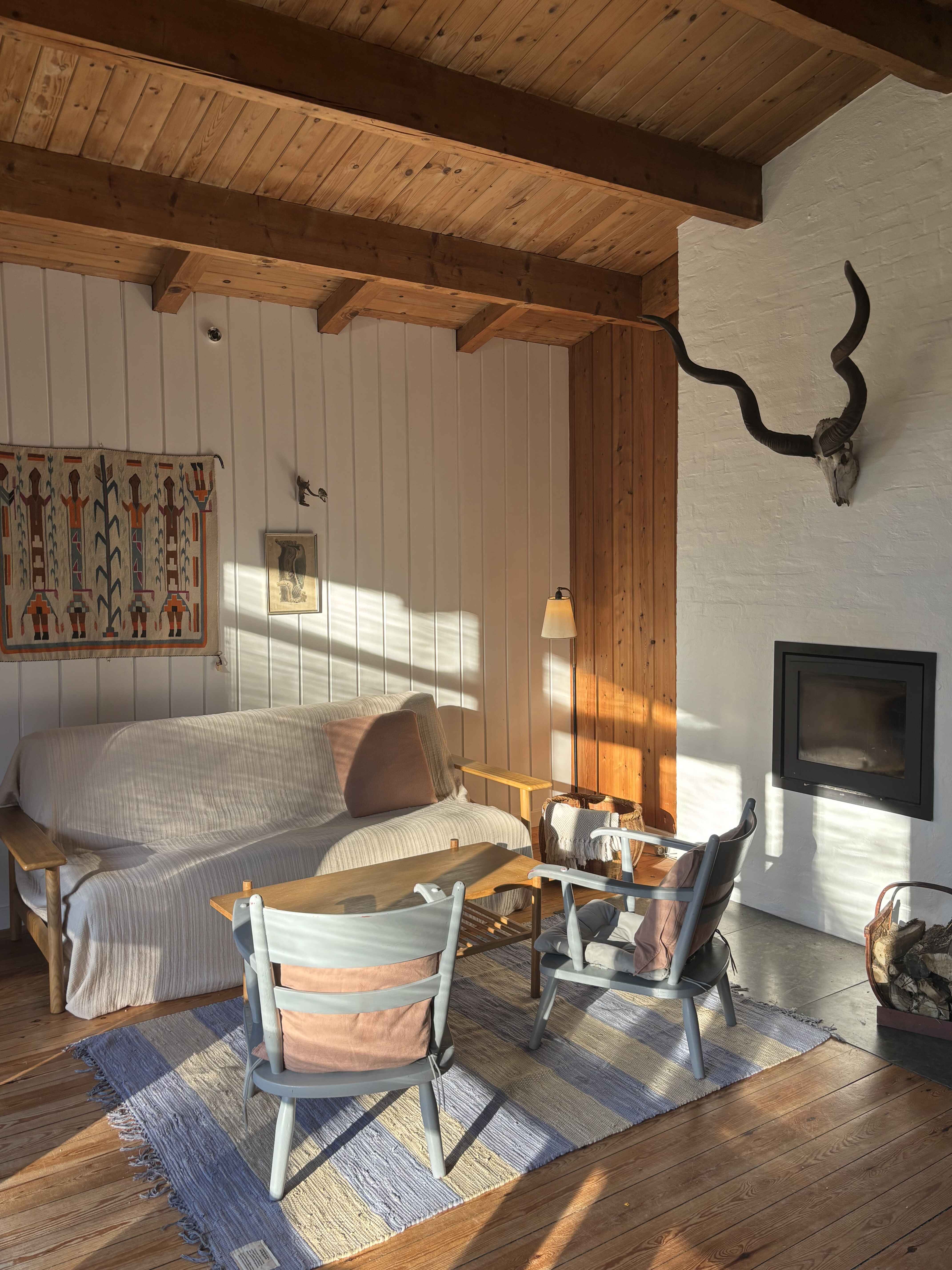 Huset er opført i ren trækonstruktion og har enkle, hyggelige rum med plads til samvær. Pejsen danner et naturligt samlingspunkt på kølige aftener, hvor I kan læne jer tilbage og nyde stilheden.