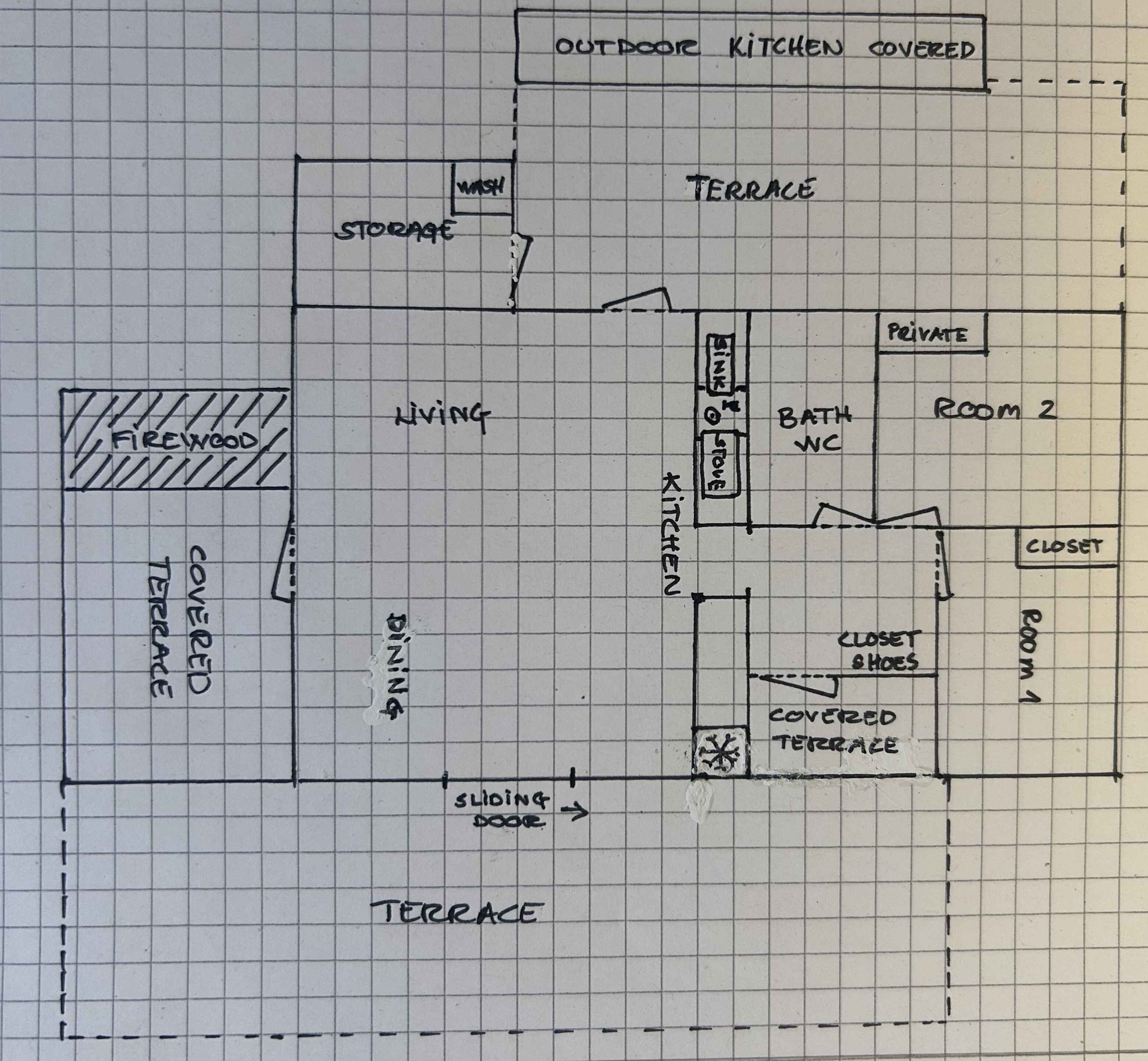 På den ene terrasse findes et veludstyret udekøkken med induktion, grill, wok-blus og pizzaovn. Hertil kommer varmt vand og minikøleskab, så madlavning og måltider nemt kan flyttes udenfor og de mange lækre lokale råvarer en naturlig del af ferien.