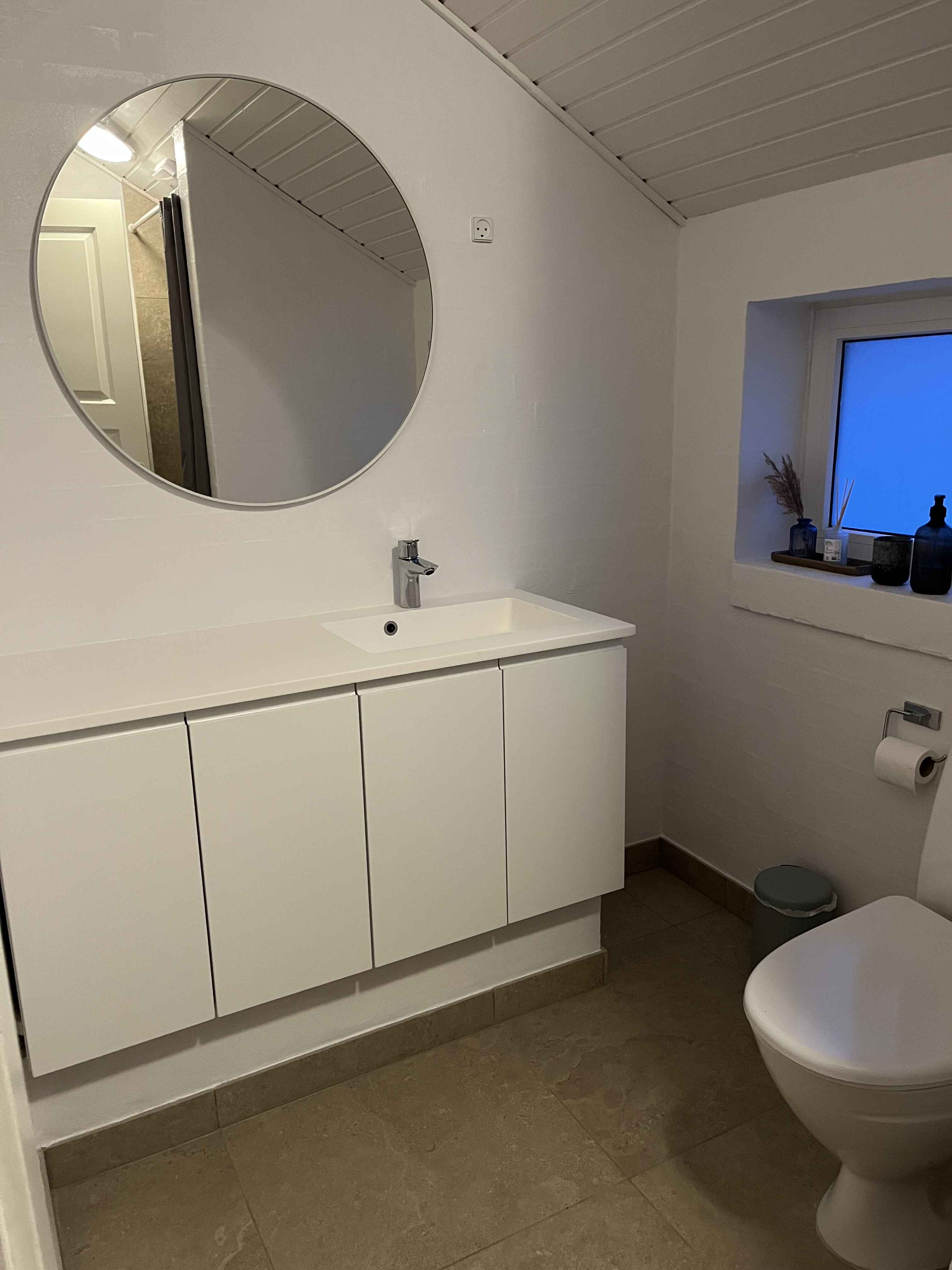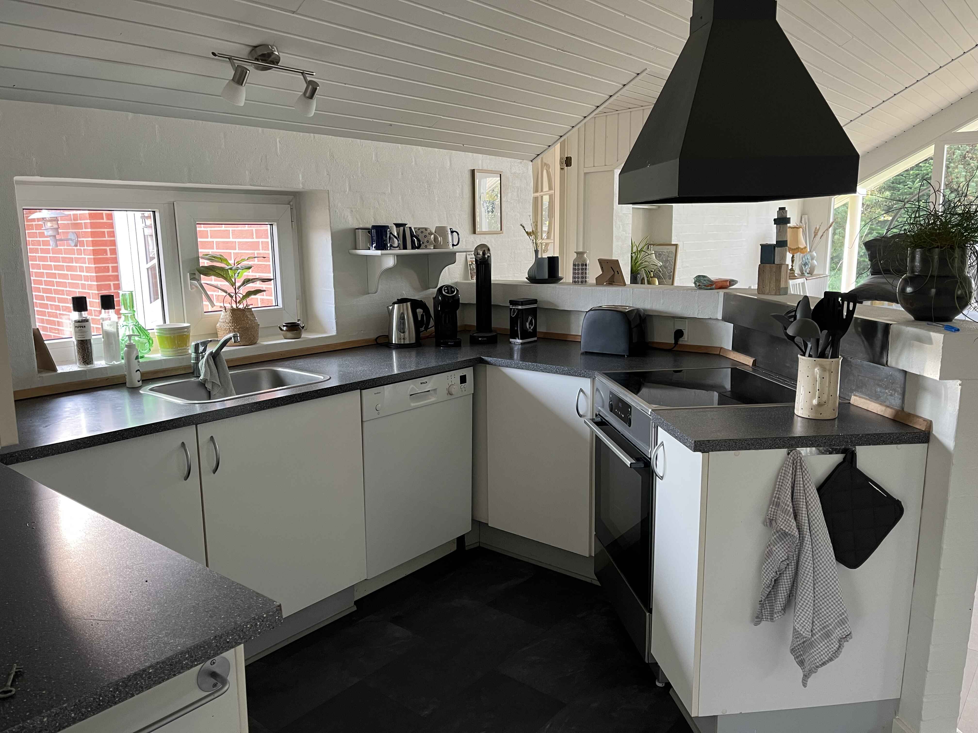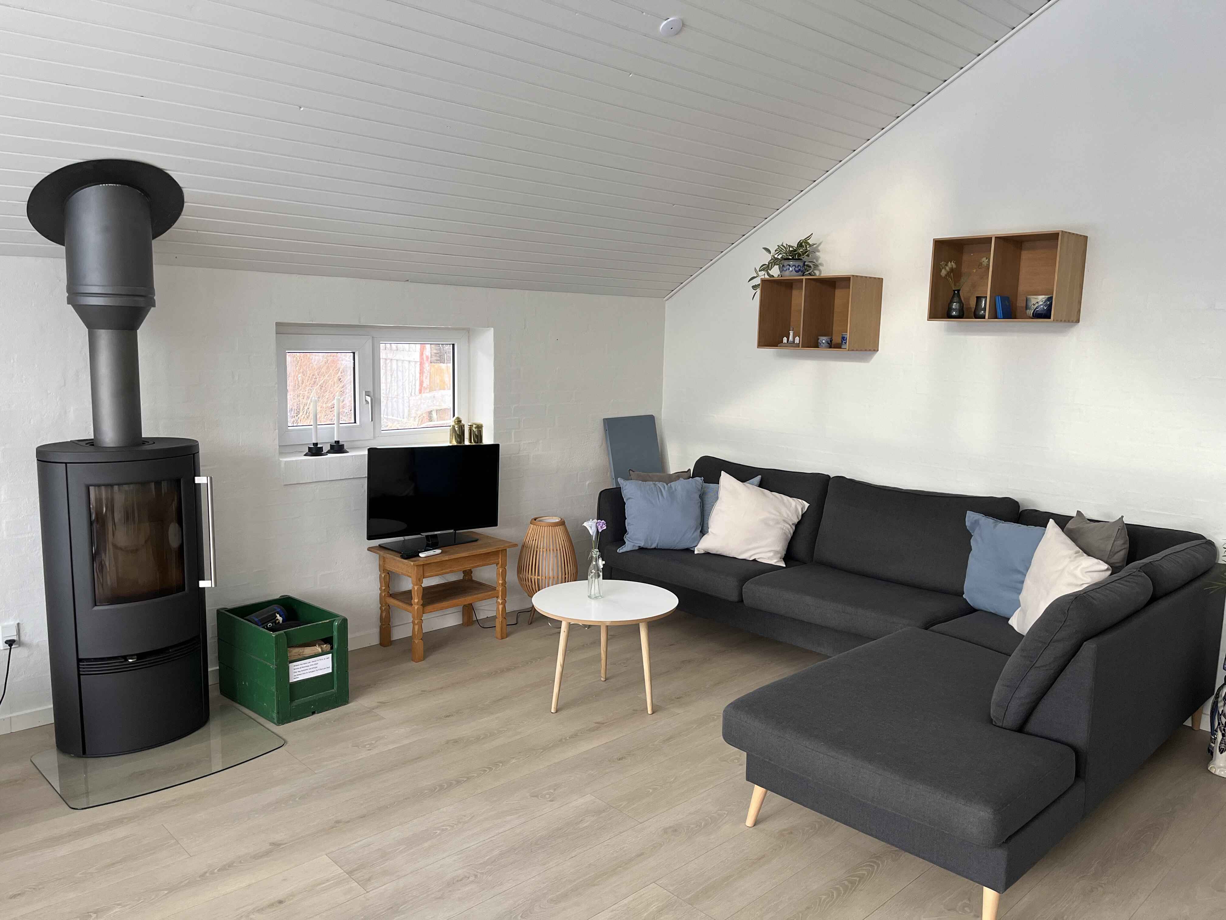 Huset har en dejlig lys stue med ny brændeovn, varmepumpe, spiseplads og åbent til et veludstyret køkken. I køkkenet er der bl.a. opvaskemaskine og mikroovn. Der er desuden et pænt, lyst badeværelse med bruseniche og varme i gulvet.