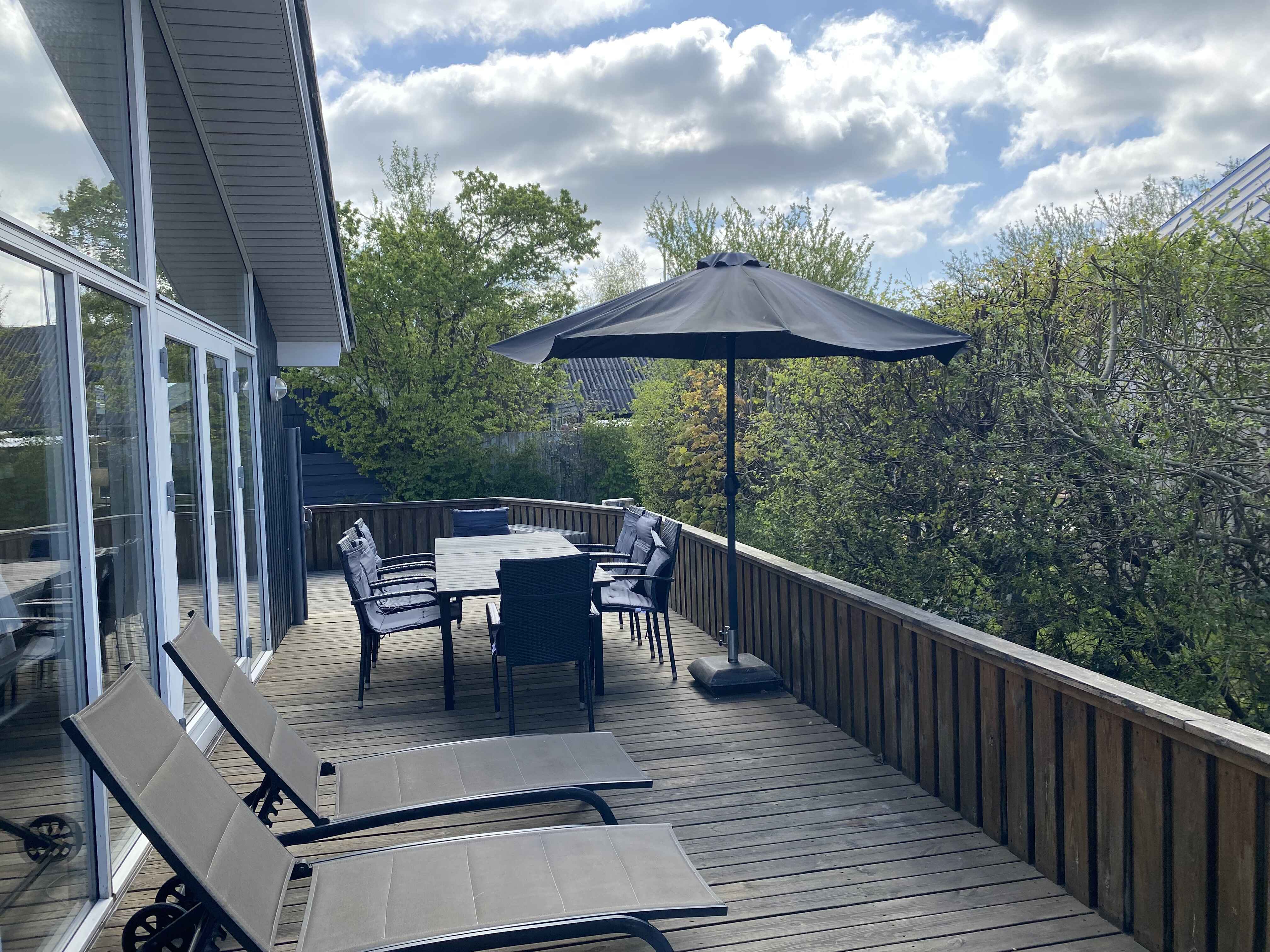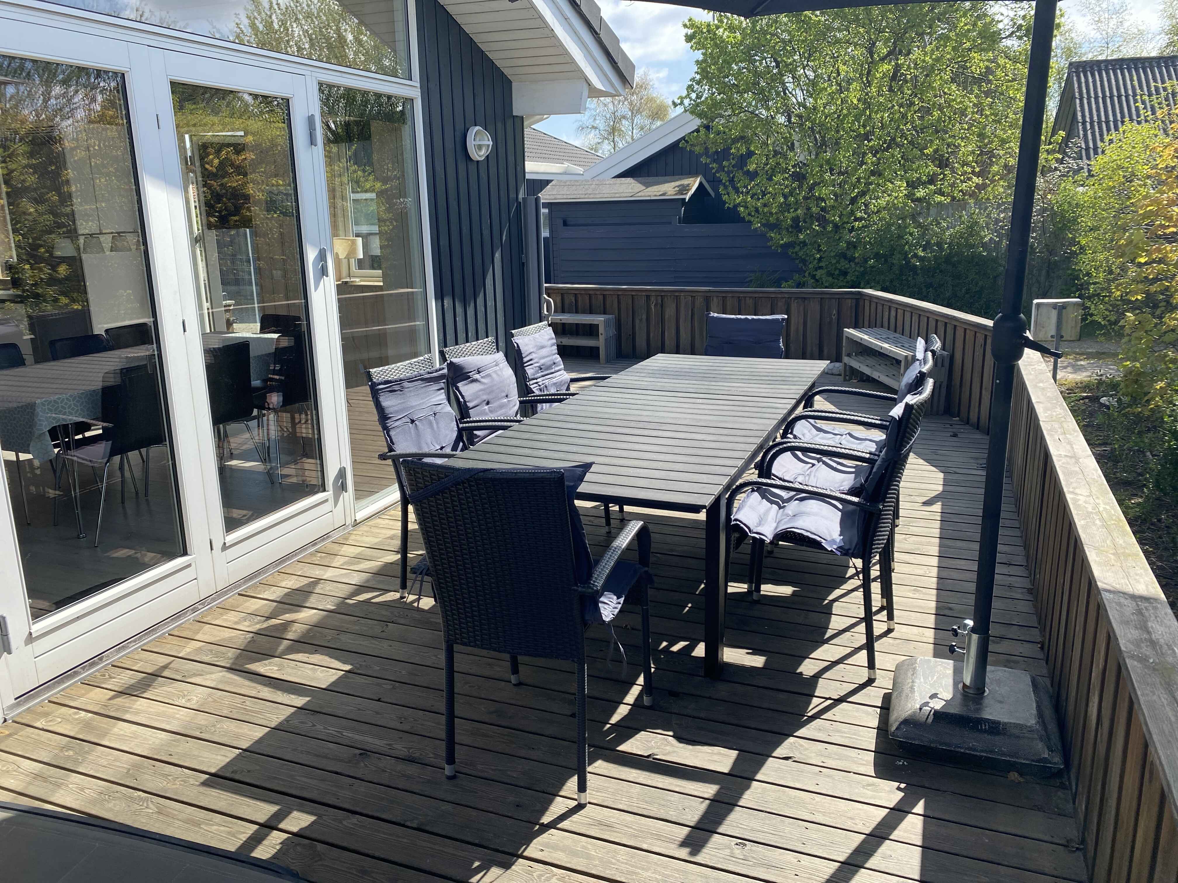 Udenfor er der en 60 m2 stor aflukket terrasse med en gasgrill, men ingen græsplæne. Der er en sandkasse til børnene. Mulighed for parkering til 3-4 biler direkte ved ferieboligen.