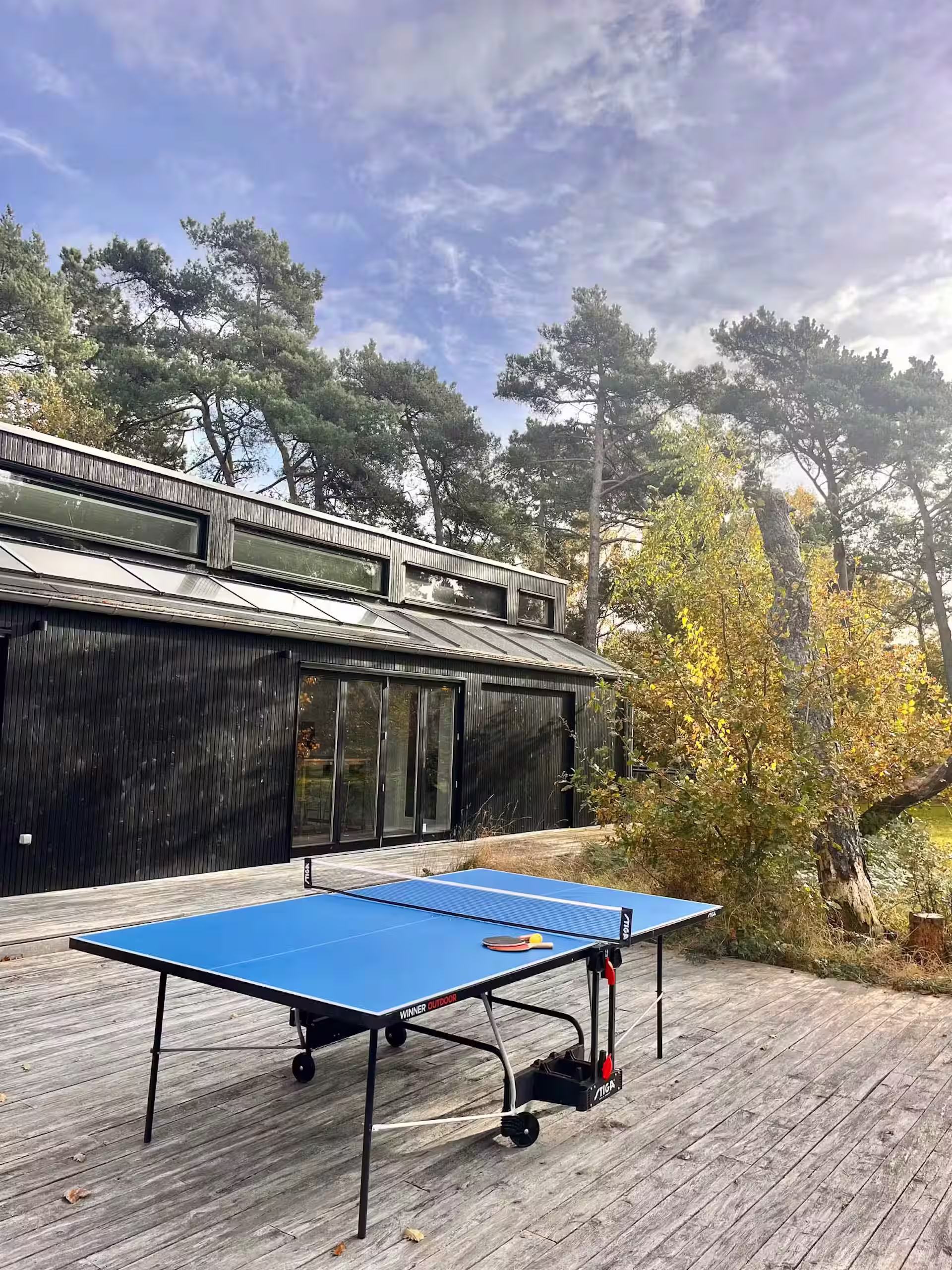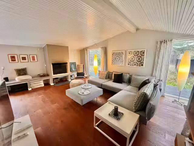 Udendørs faciliteterne omfatter en stor grund på 2400 m2, hvor gamle fyrretræer tilbyder privatliv og skygge. Her kan man nyde udendørslivet, hvad enten man vil solbade på terrassen eller lege i baghaven.