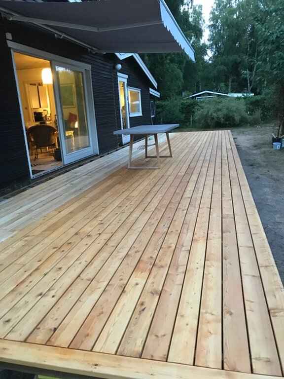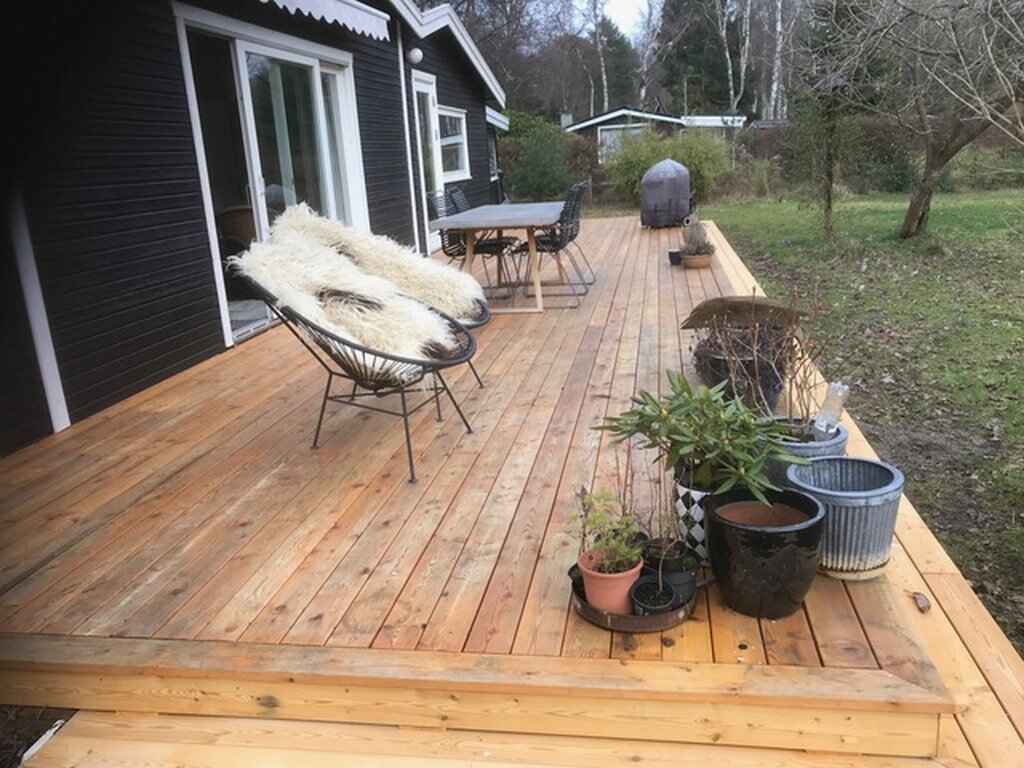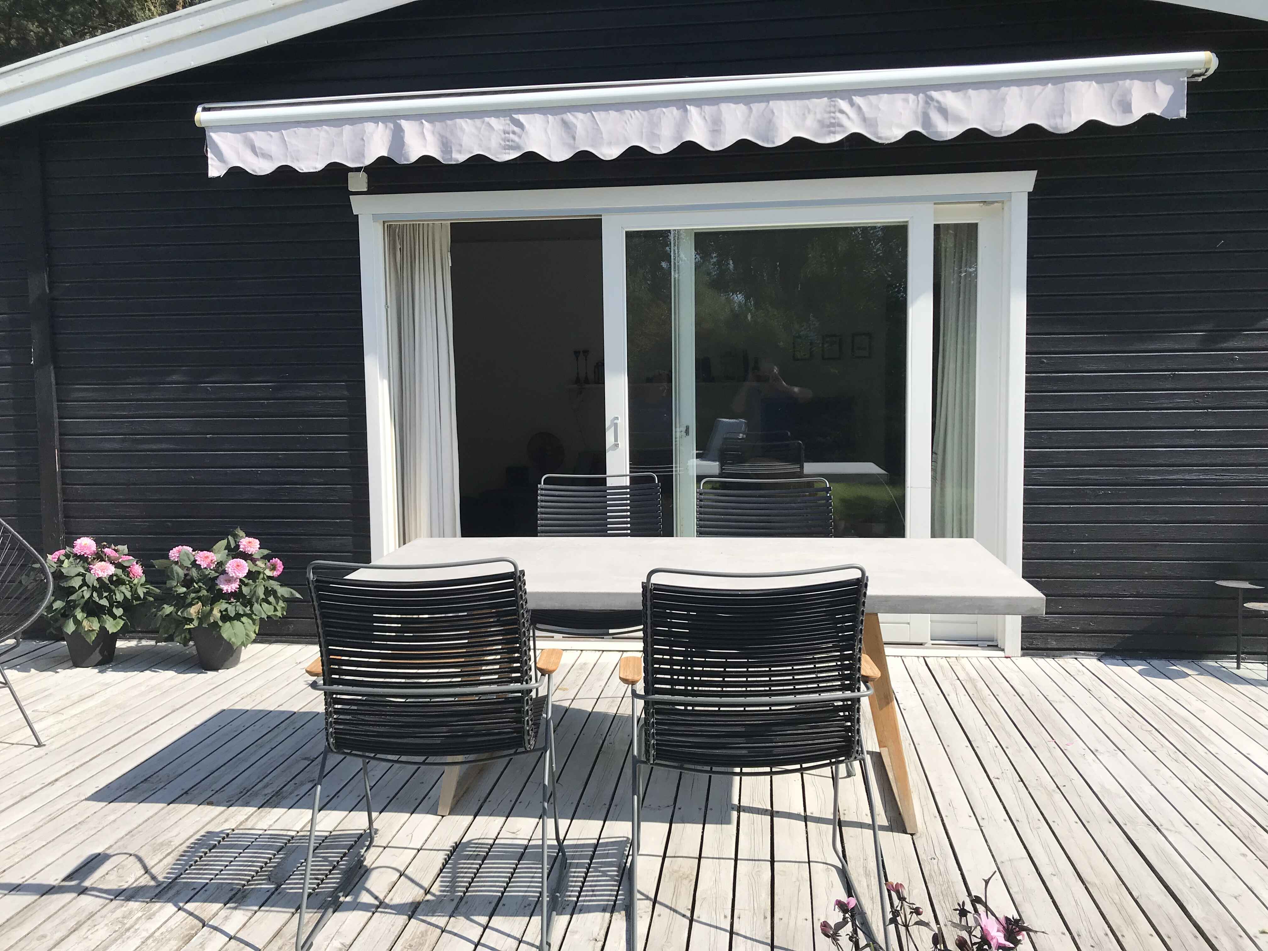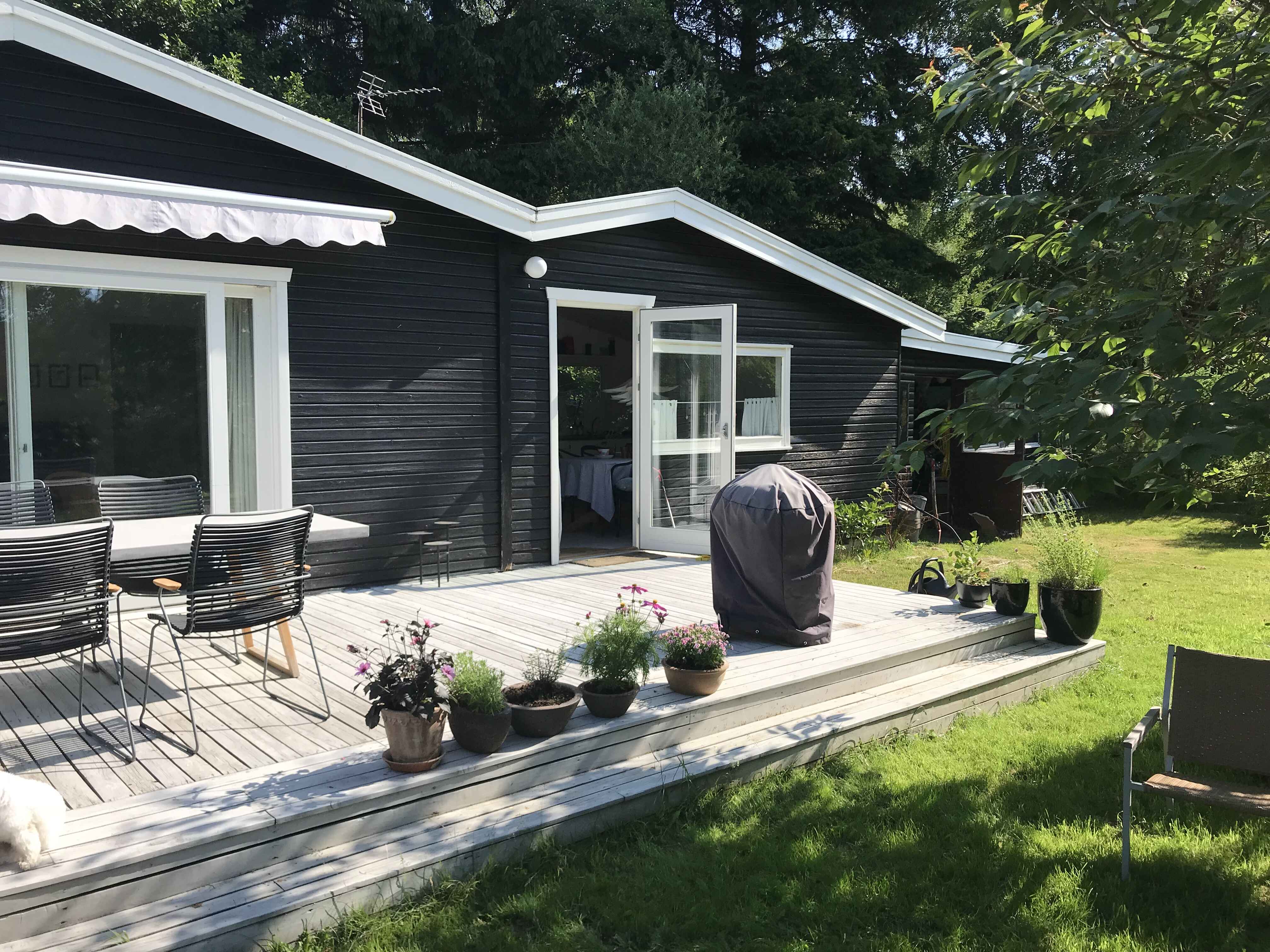 Stuen er hyggeligt indrettet bl.a. med brændeovn og dobbelte skydedøre som udgang til en dejlig, stor terrasse med havemøbler, plantekrukker og grill. Terrassen kan delvist overdækkes med en markise. Herfra er der dejlig udsigt over haven.