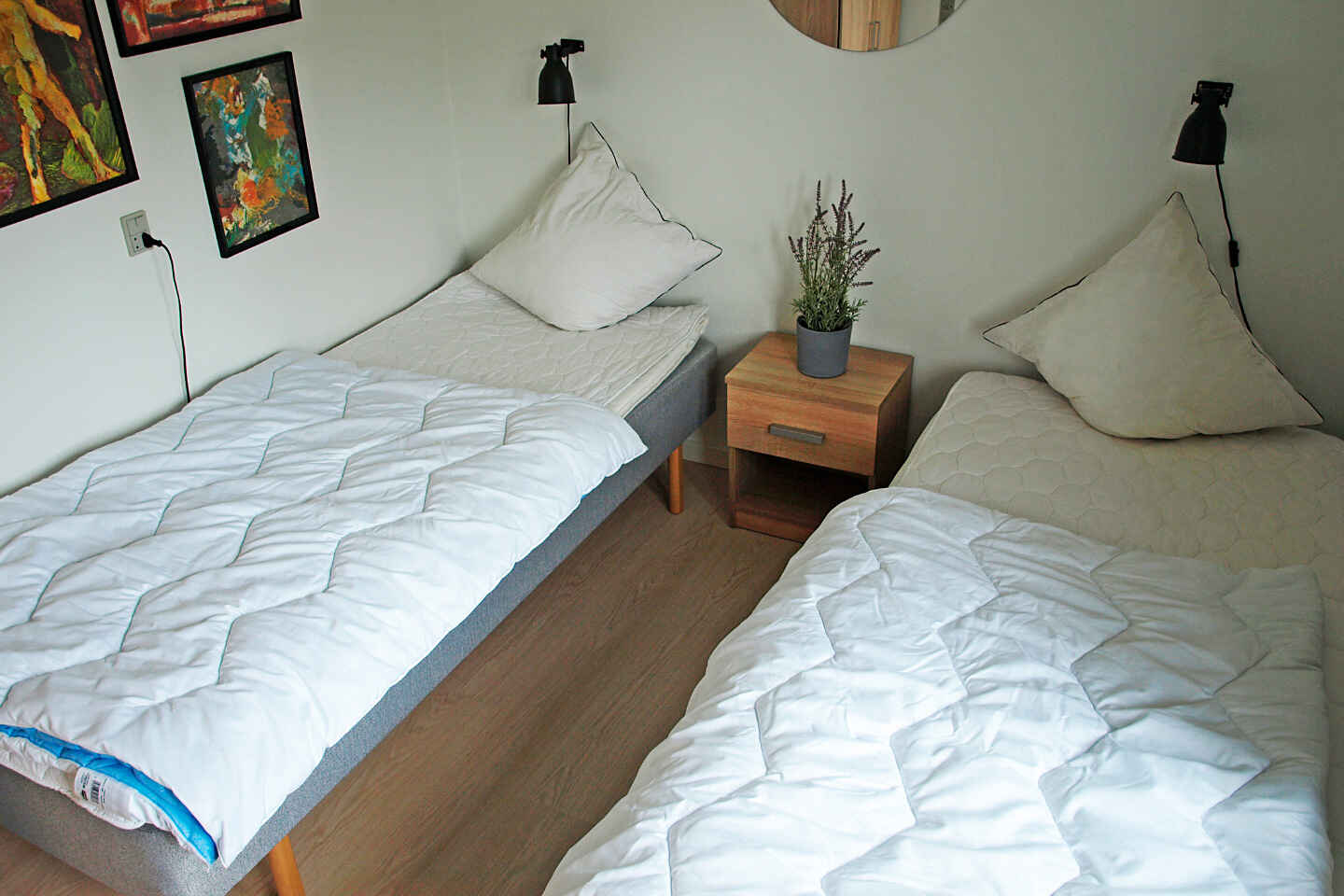 Huset har 6 soveværelser med i alt 11 enkeltsenge. Her er også en barneseng og en barnestol. Her er 2 badeværelser.