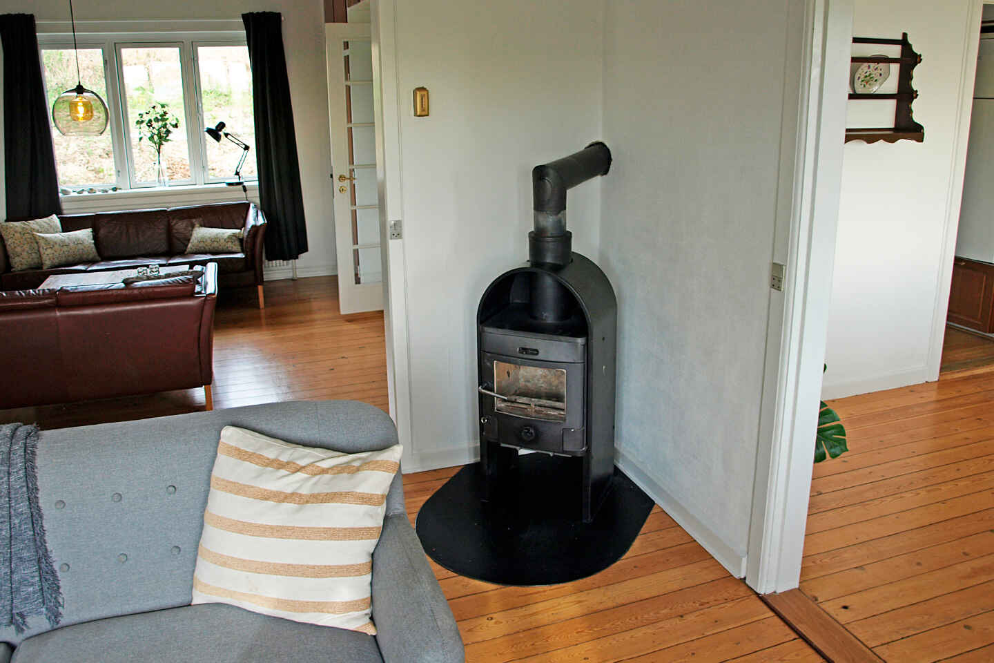 Der er en dejlig stor stue med brændeovn, og her er også gratis internet.