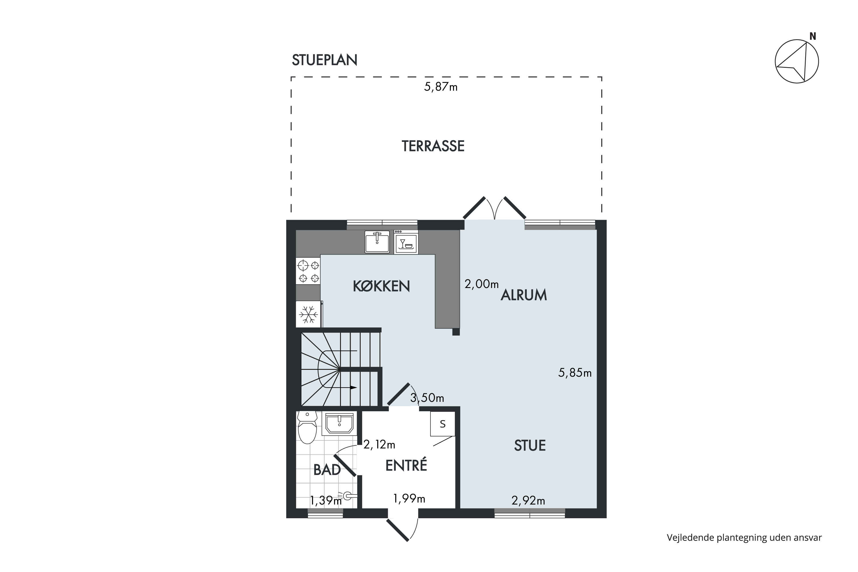 Huset rummer entré med plads til overtøj, et badeværelse med stor brusekabine samt et åbent køkken-alrum. Køkkenet er veludstyret med service og redskaber til alle måltider. Stuen har stor sofa, tv, spiseplads og udgang til terrassen, hvor der står loungemøbler, hynder og grill.