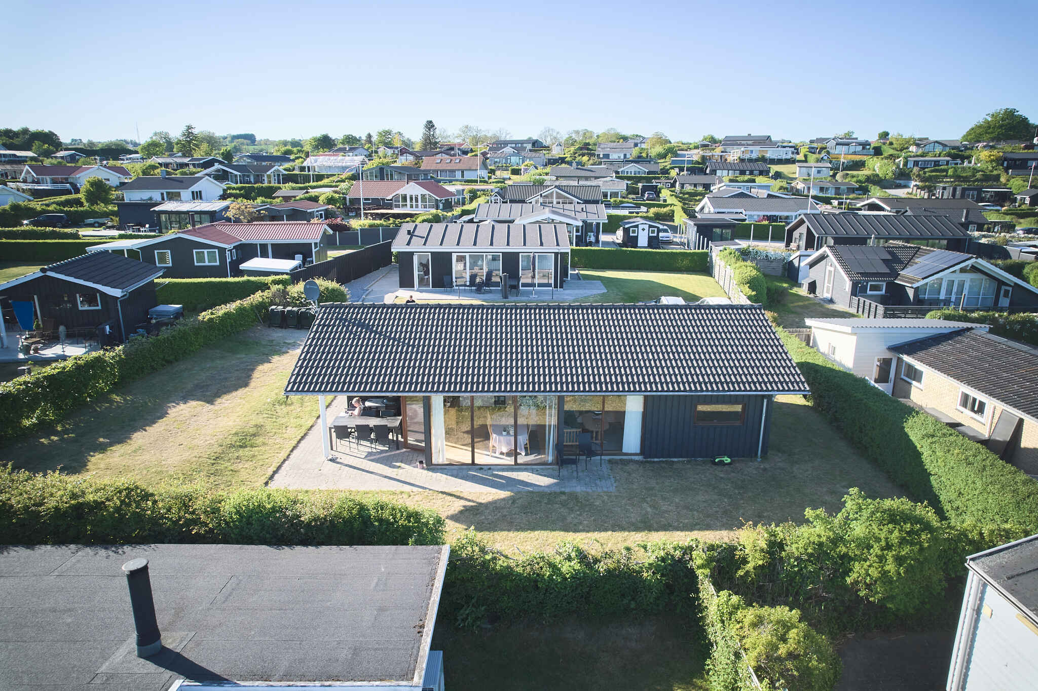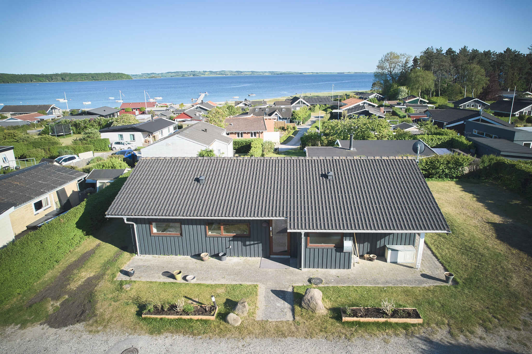Sommerhus beliggende med udsigt til vandet i udkanten af et sommerhusområde nær børnevenlig badestr...
